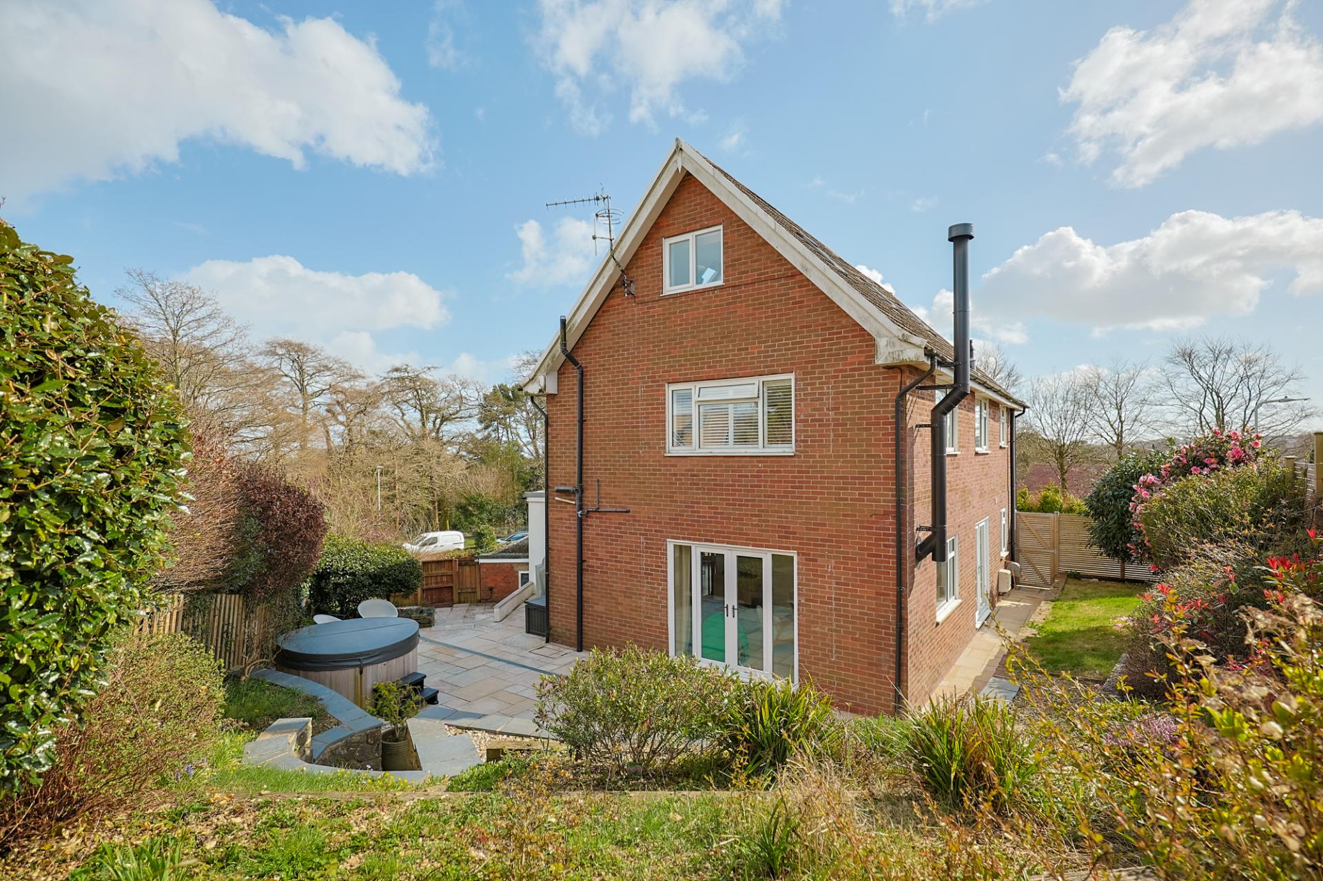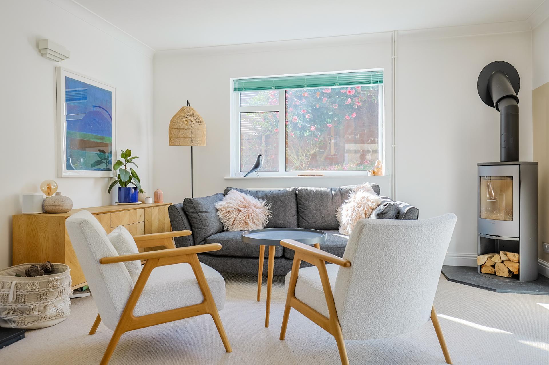 The lounge, positioned at the rear of the home, is a warm and inviting space. This cosy carpeted room is exceptionally bright, thanks to its triple-aspect windows and double patio doors that open onto the garden. A wood burner with a slate hearth enhances the aesthetics, creating a perfect space for relaxation.