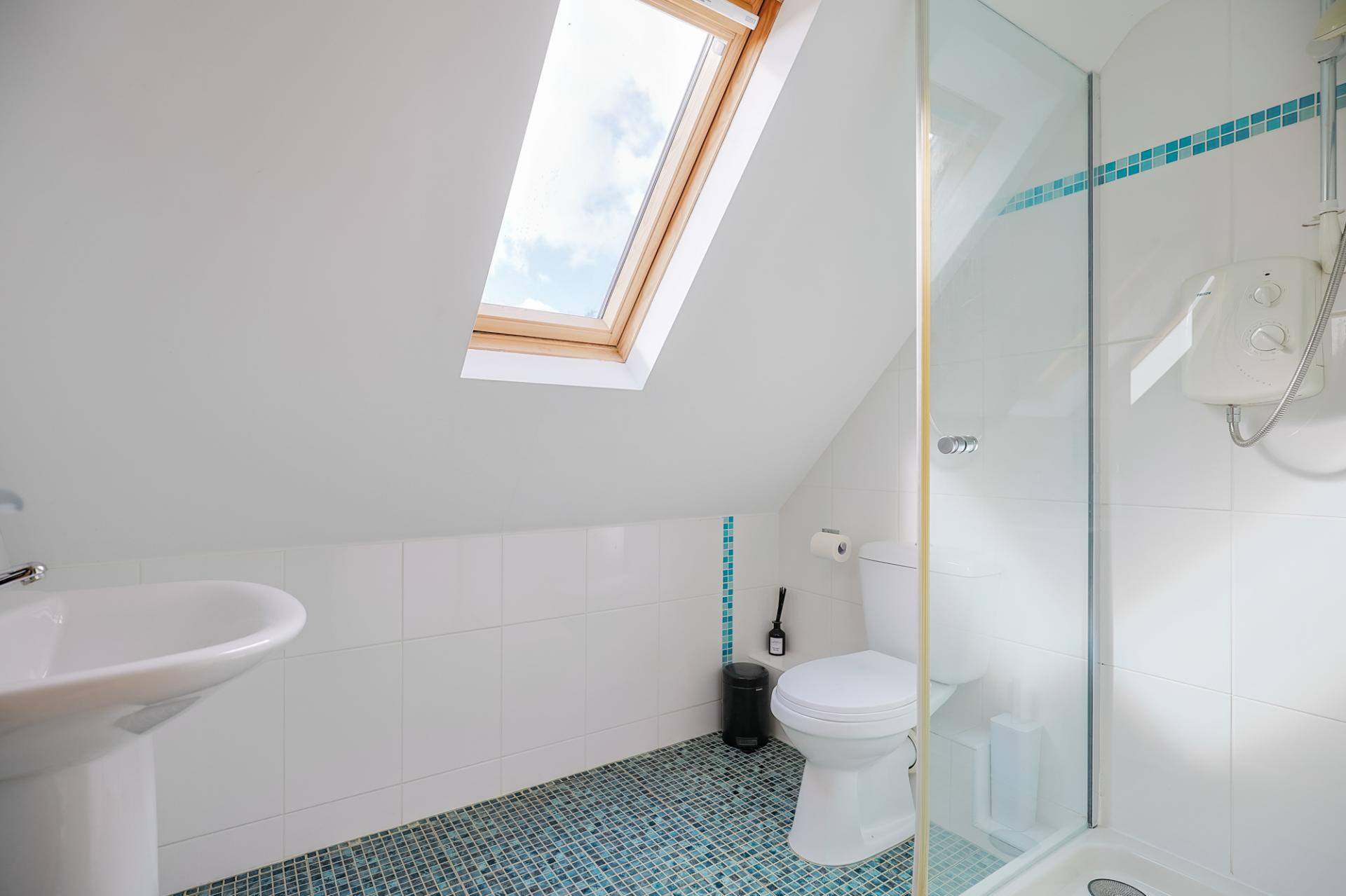 The shower room on this floor includes a WC, wash basin, shower cubicle, heated towel rail, extractor fan, vinyl flooring, tiled walls, and a Velux window.