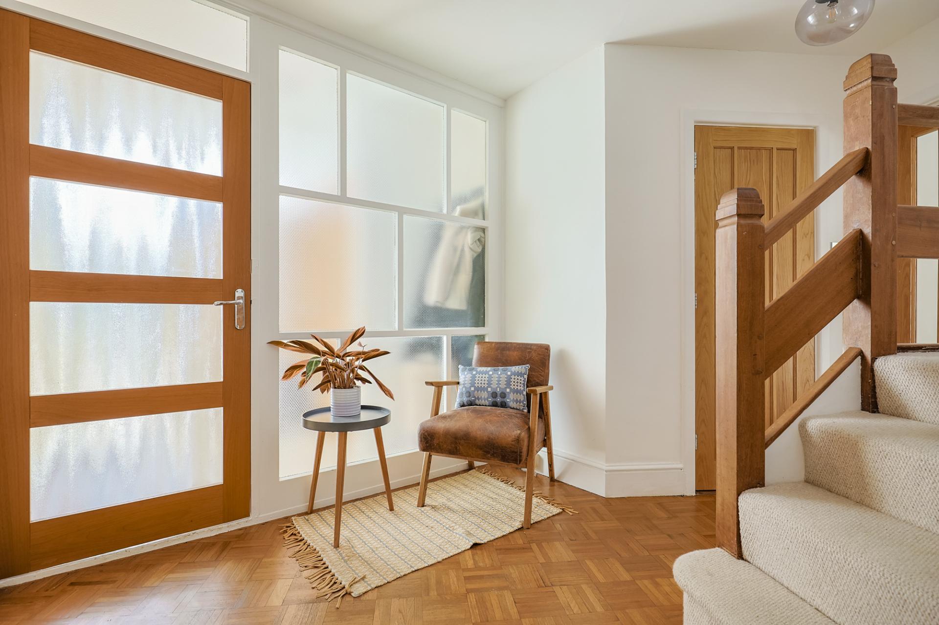Upon entering, you are greeted by a welcoming and bright entrance, enhanced by a side window allowing natural light to flow in. A double-door cloak cupboard, fitted with hanging rails and shelving, provides excellent storage for coats and shoes, keeping the space tidy. A frosted window to the hallway adds a touch of privacy while maintaining brightness.