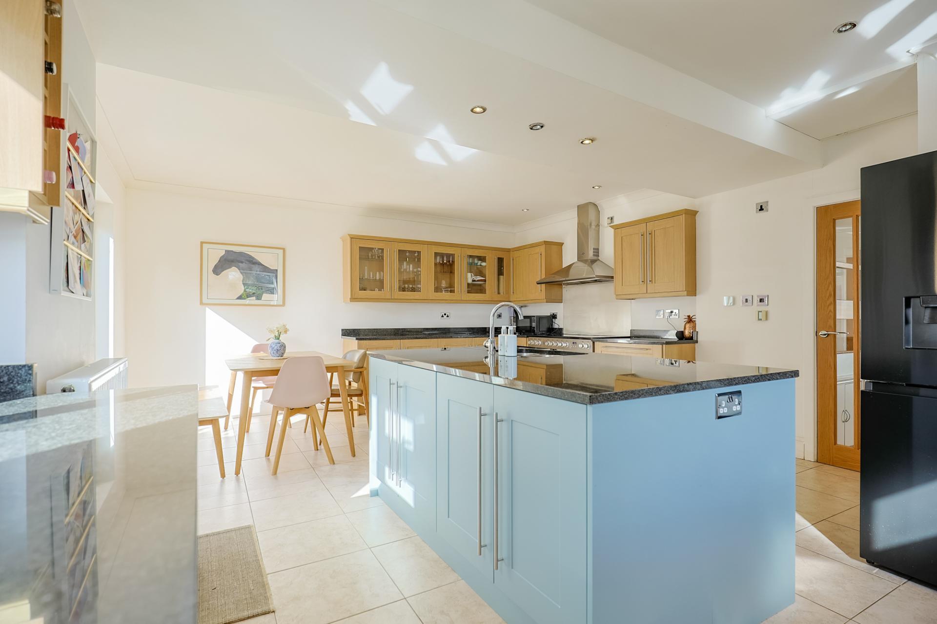 The heart of the home is the stunning kitchen/diner, a beautifully large space flooded with natural light from dual windows and double patio doors to the side. Tiled flooring and spot lighting enhance this stylish and functional area. The kitchen is equipped with an array of wall and base units topped with granite worktops, a NEXUS SE double oven/grill, a three-ring electric induction hob with a hot plate, and a Britannia extractor fan. A desirable kitchen island provides extra storage granite worktops, a double stainless-steel sink with a swan tap, a Beko dishwasher, generous dining space, and a pantry with shelving, a frosted window to the WC, and access to the front of the property.