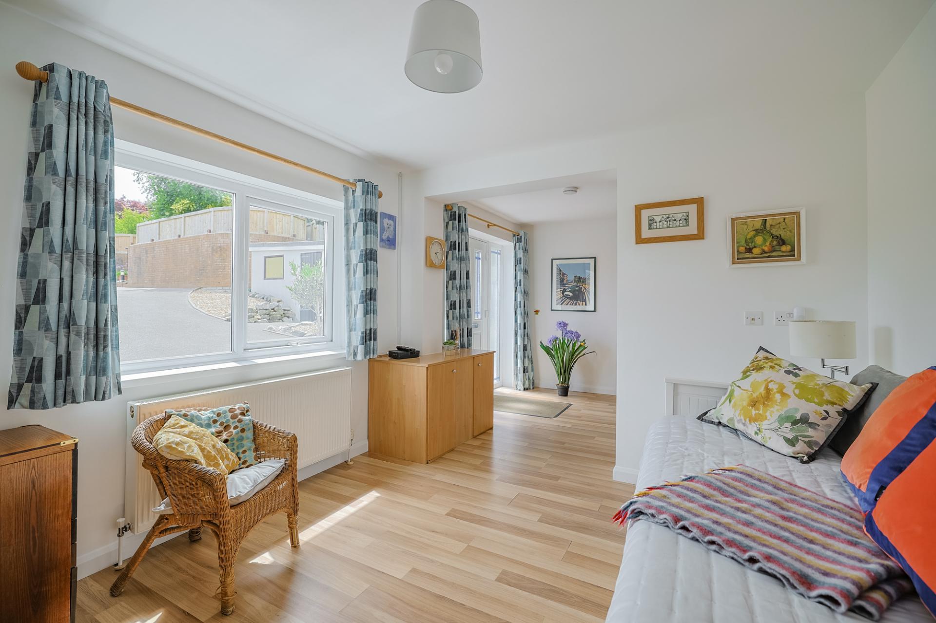 Situated off the main entrance and accessed via a cloakroom is an additional versatile reception room, currently used as a bedroom. This space could equally serve as a secondary sitting room or potentially a self-contained studio, benefitting from its own private access and flanked by frosted windows. A large front-facing window lets in ample light, and laminated flooring. From here, you gain access to a well-appointed shower room.
