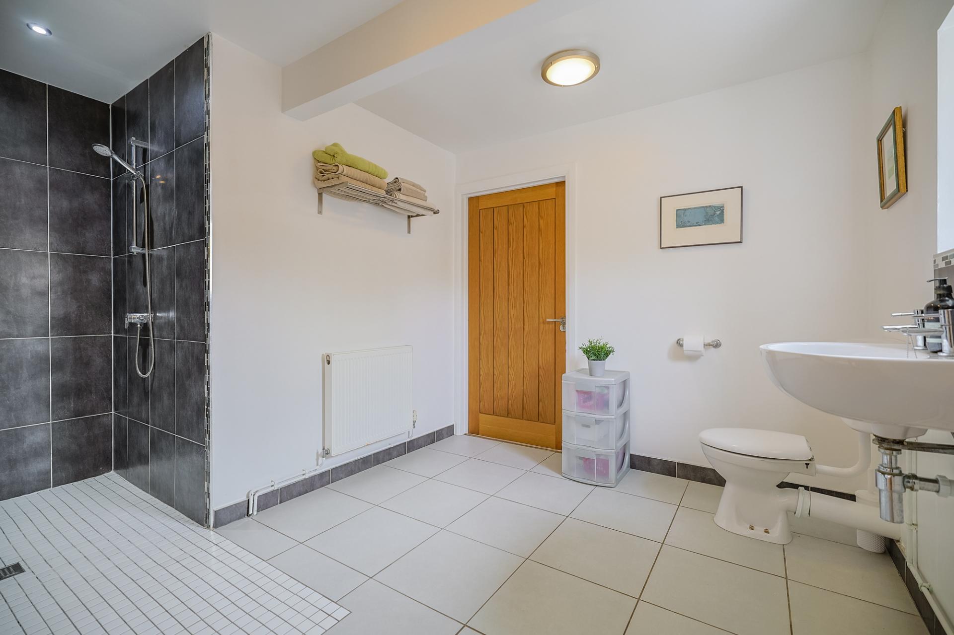The shower room includes a WC, wash basin, shower, tiled flooring and partial tiled walls, along with an extractor fan and frosted side window. This functional space also links to the utility room.