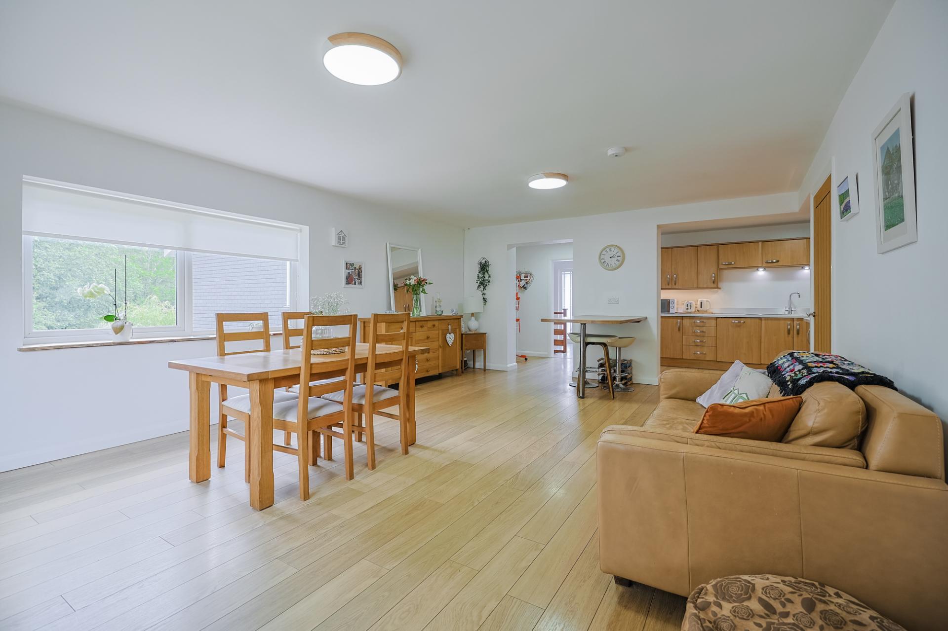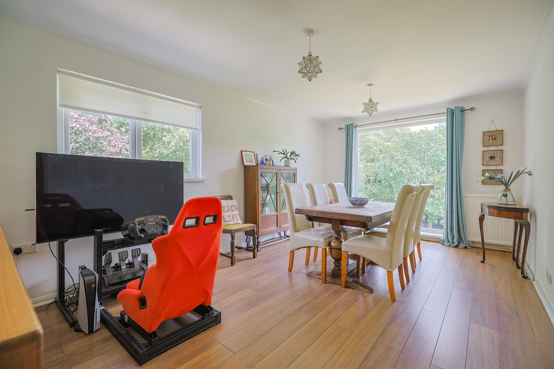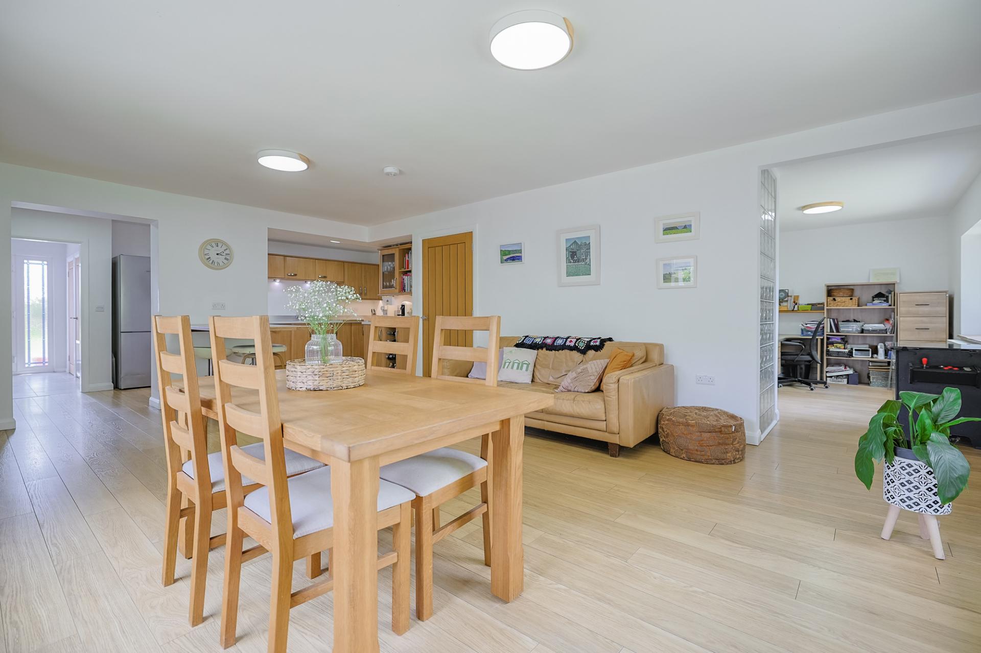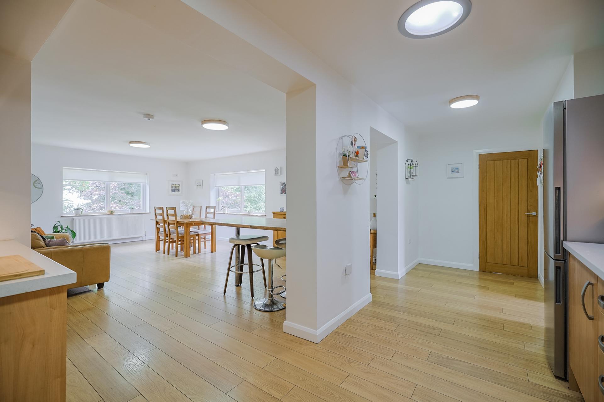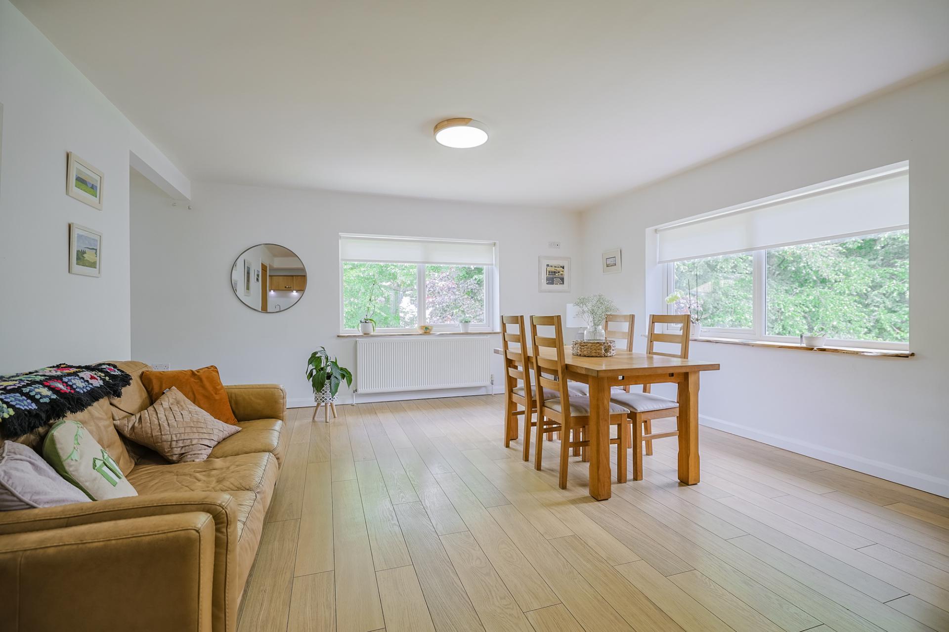 The dining room is another beautifully light-filled space, featuring dual aspect windows including a large rear-facing one that floods the room with natural light. Here you have Quickstep laminate flooring, coving, and a doorway which opens into the kitchen area.