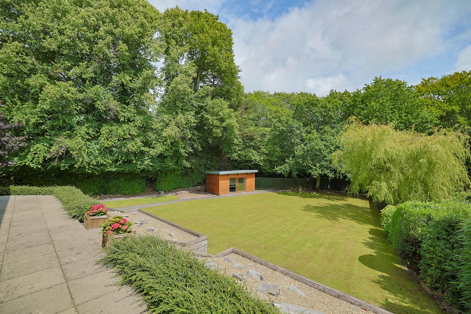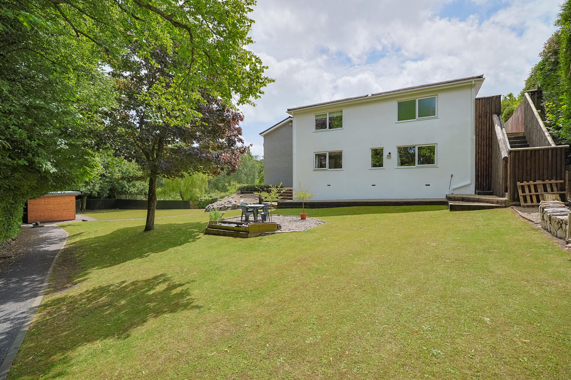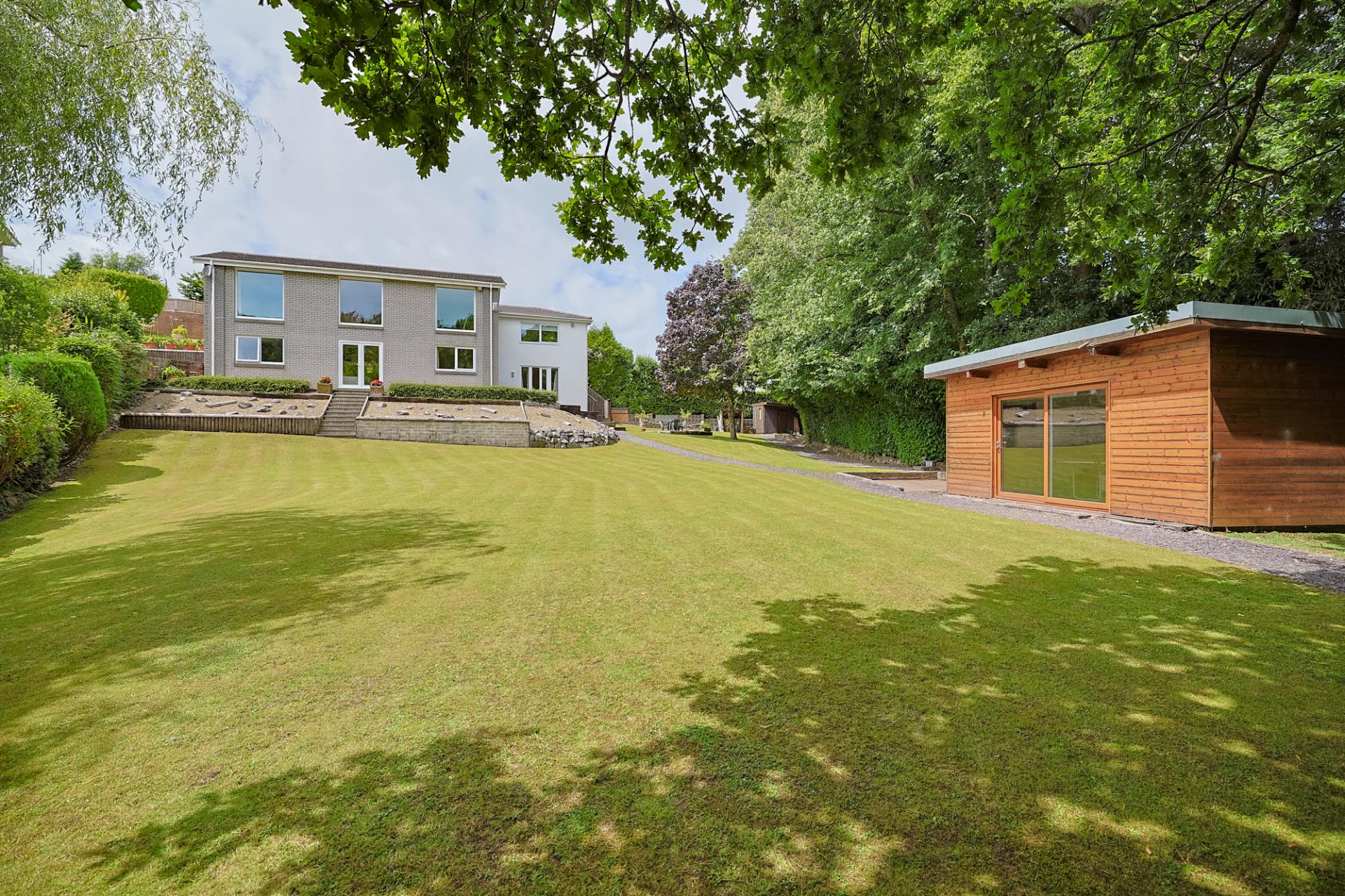 The rear garden is truly exceptional—a substantial and private outdoor space with a level lawn, beautifully bordered by mature trees and shrubs. A generous, elevated patio area offers a perfect spot for entertaining, with pathways and steps guiding you around the grounds. A feature rockery adds charm, while the garden room—equipped with lighting and electricity—is currently used as a games room but could serve equally well as a home office or studio. An additional outbuilding is currently utilised as a workshop and also benefits from power and lighting. Pathways encircle the home, providing full access around the plot. To the rear, there is direct access to the peaceful Cwm Farm Lane.