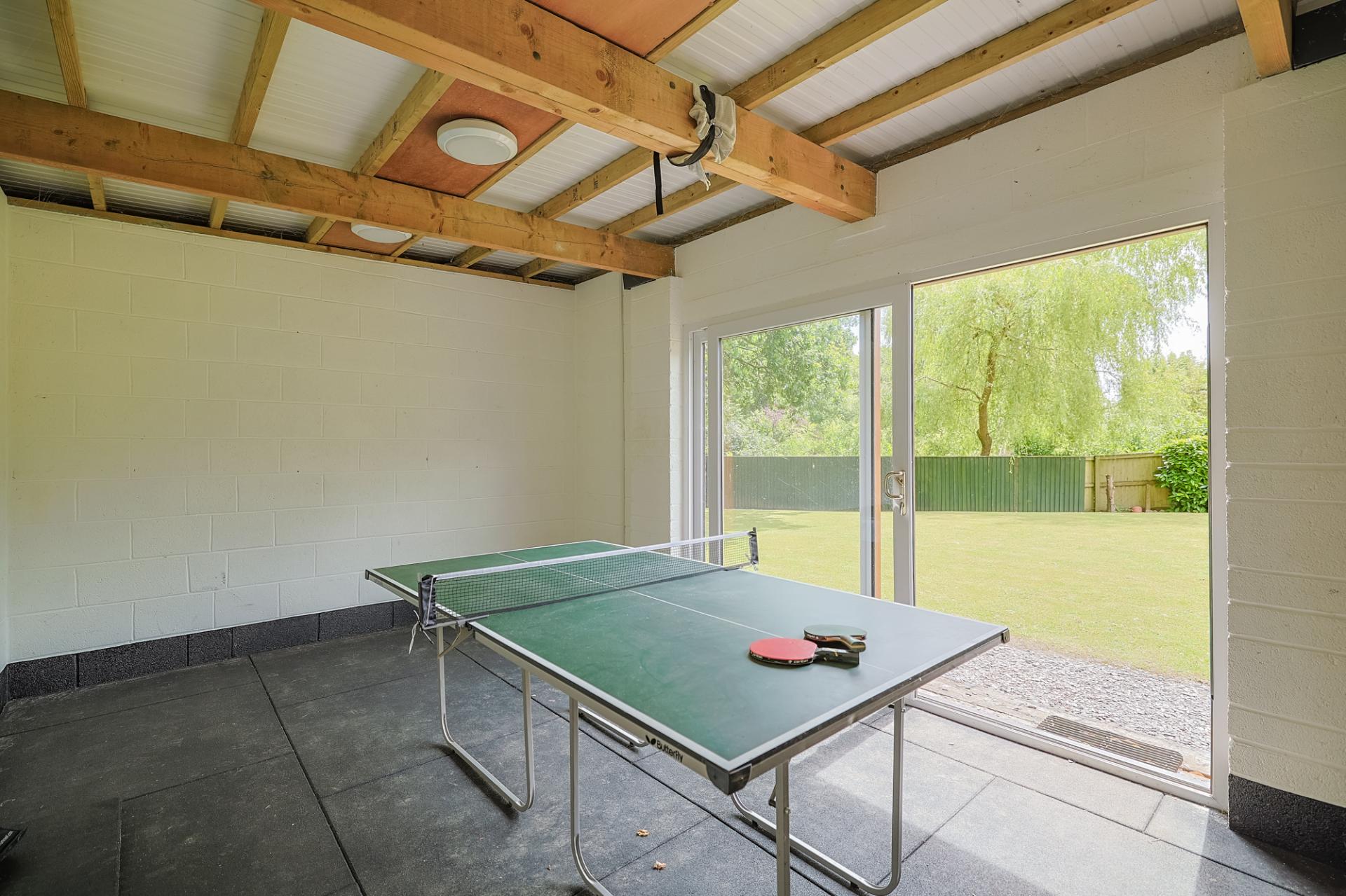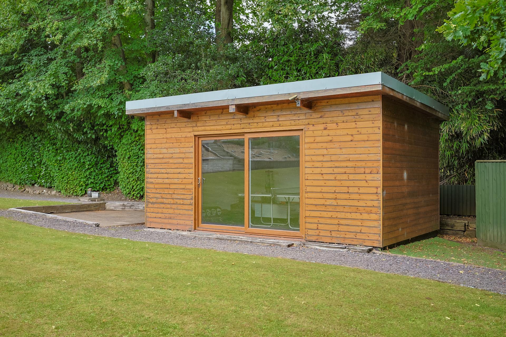 To the front, the property enjoys a well-manicured garden with lawn and chip stone areas, along with a further outbuilding ideal for garden equipment or general storage.