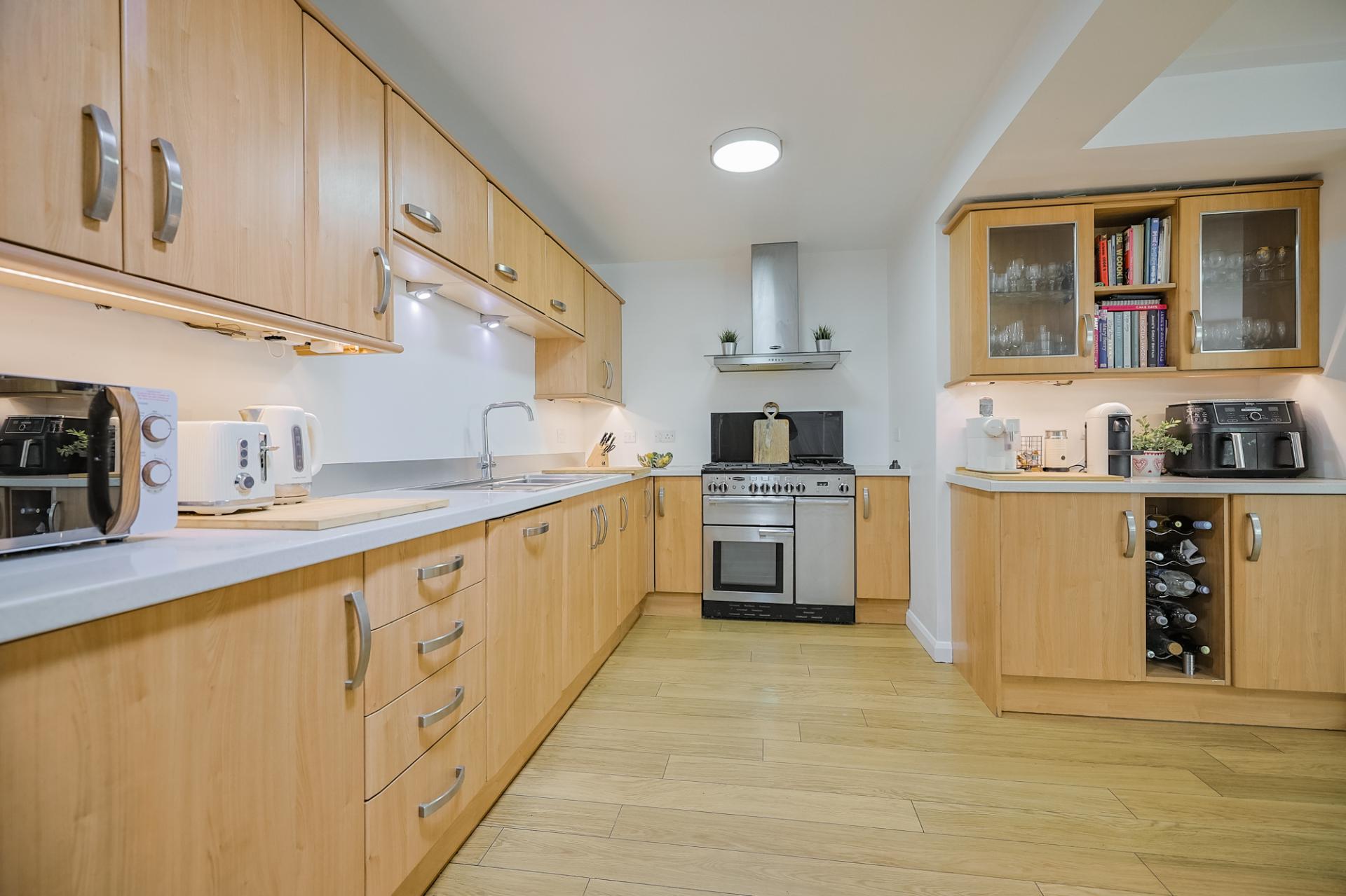 The open-plan kitchen/breakfast/family room is undoubtedly the heart of the home. This impressive space is laid with Quickstep laminate flooring and benefits from dual aspect windows overlooking the garden. The kitchen area boasts a generous selection of wall and base units, a double sunken stainless steel sink with drainage, a Beko dishwasher, and a Rangemaster oven/grill with a five-ring gas hob and elevated extractor fan. There is also space for a freestanding fridge/freezer. A breakfast bar seats up to five, and there’s additional room for a breakfast table and soft seating area, making this the ideal family and entertaining space.