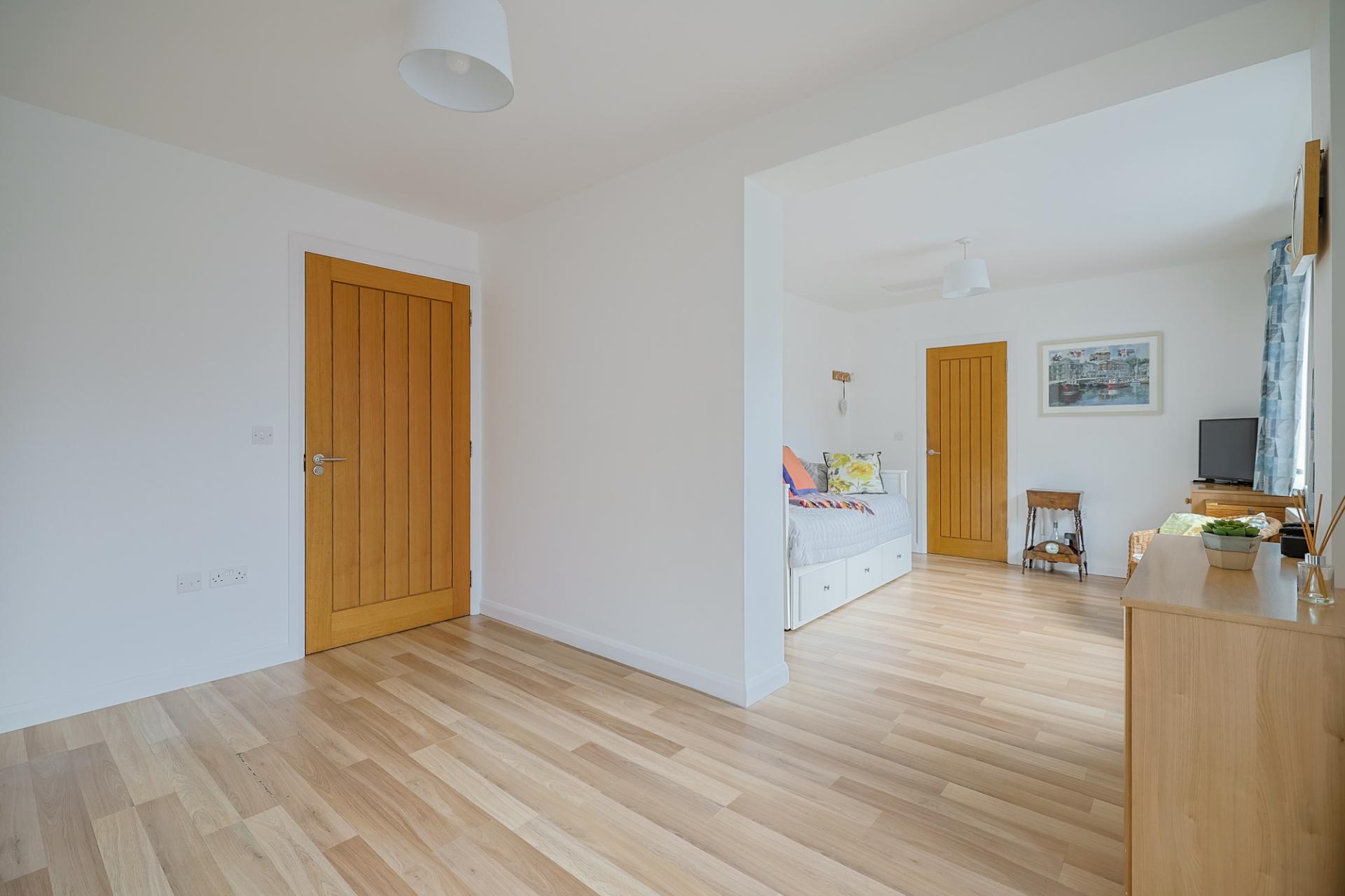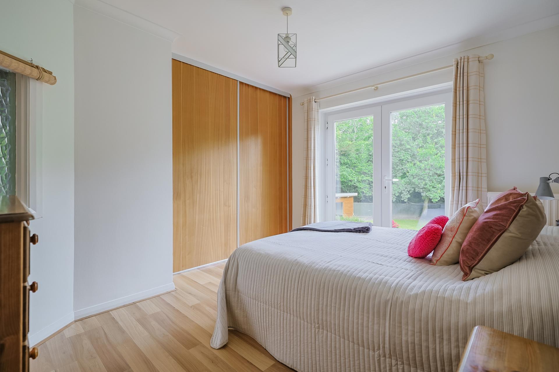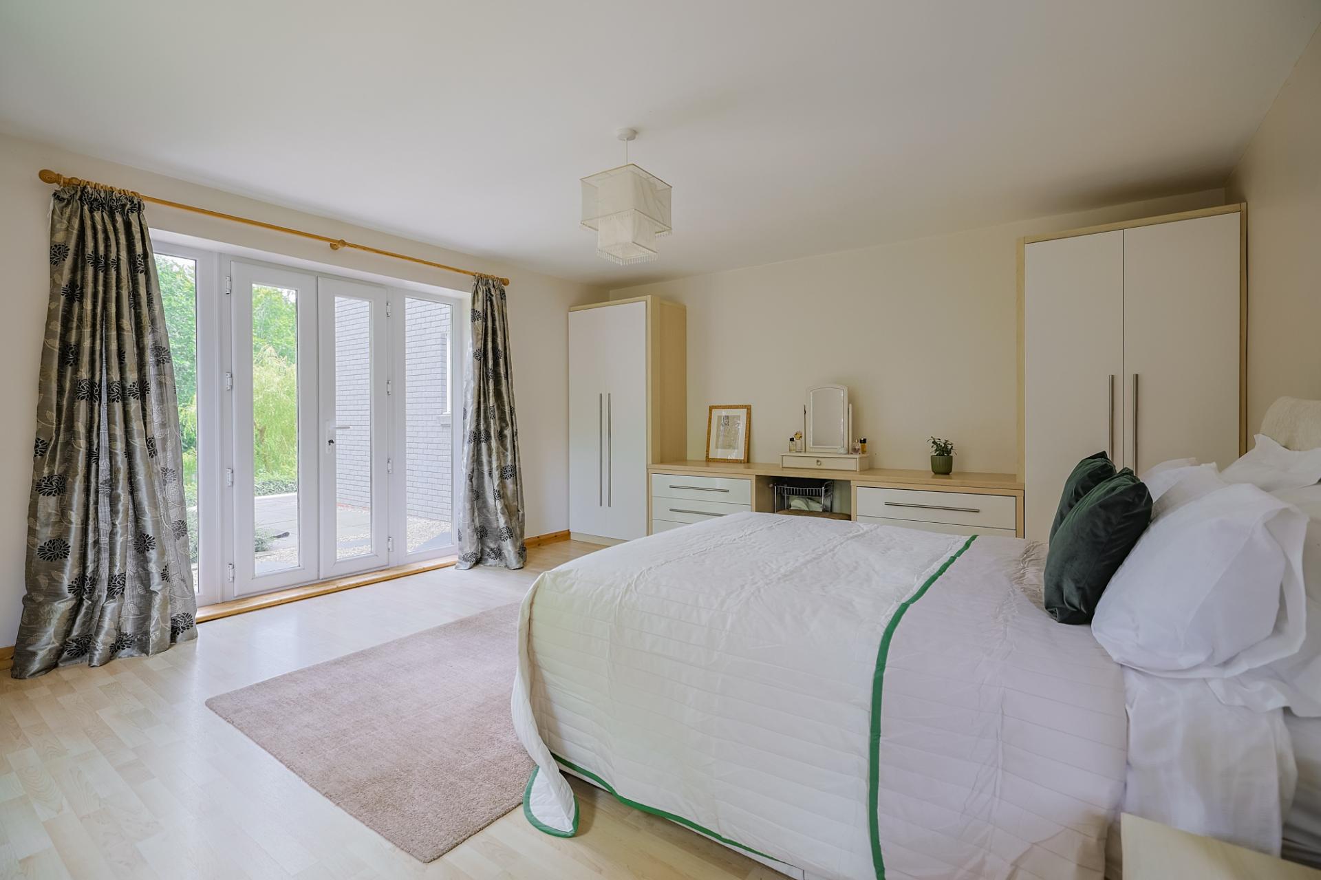 Descending this stairway brings you into the principal bedroom—a wonderfully spacious and light-filled room. With dual aspect windows and double patio doors overlooking and opening onto the rear garden, this space is laid with laminate flooring and has generous room for wardrobes, a seating area, or further personalisation.