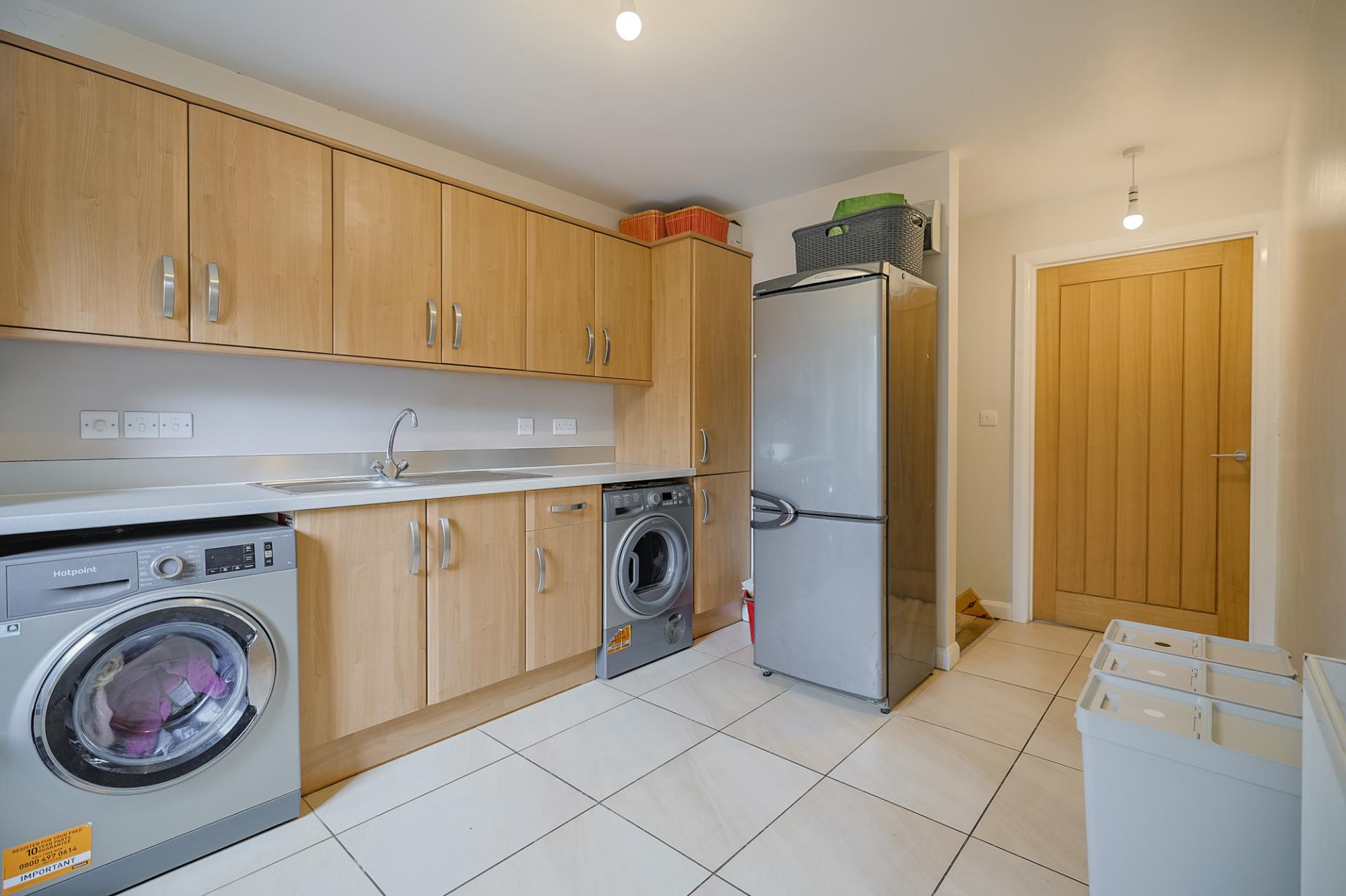 The utility room can be accessed from the kitchen, shower room, and rear of the property. It features additional wall and base units, a stainless steel sink with drainage, and tiled flooring. There's room for two under-counter appliances and one freestanding appliance. From here, a stairway leads down to a lower section of the ground floor.