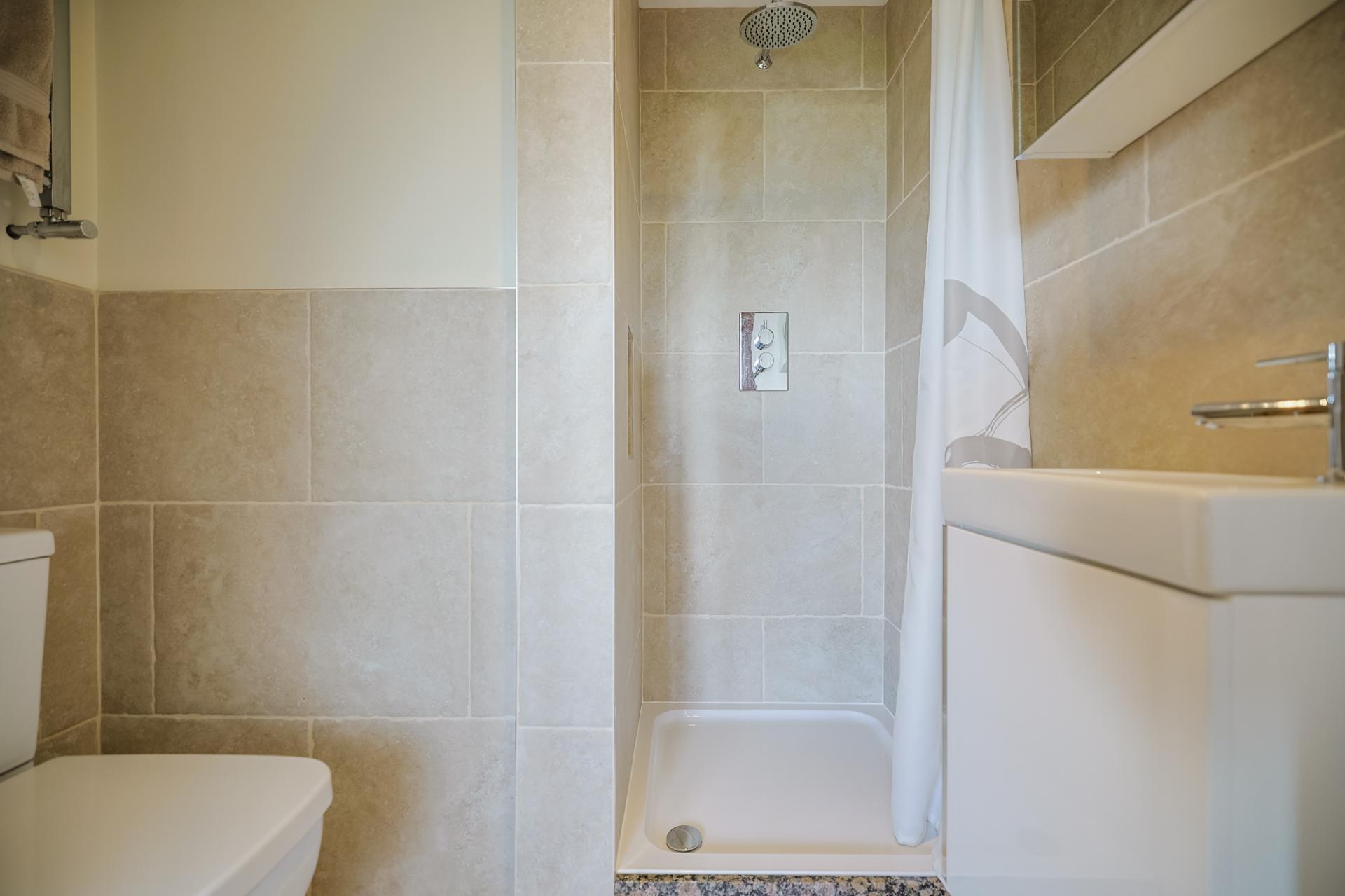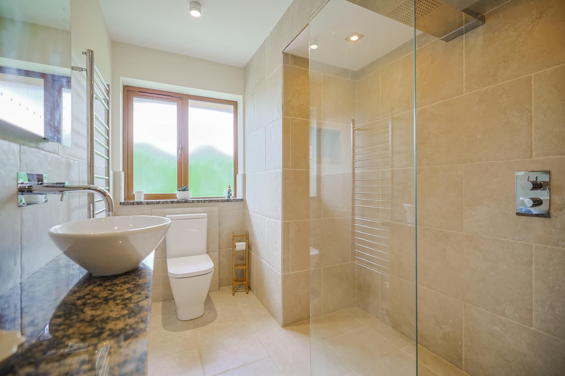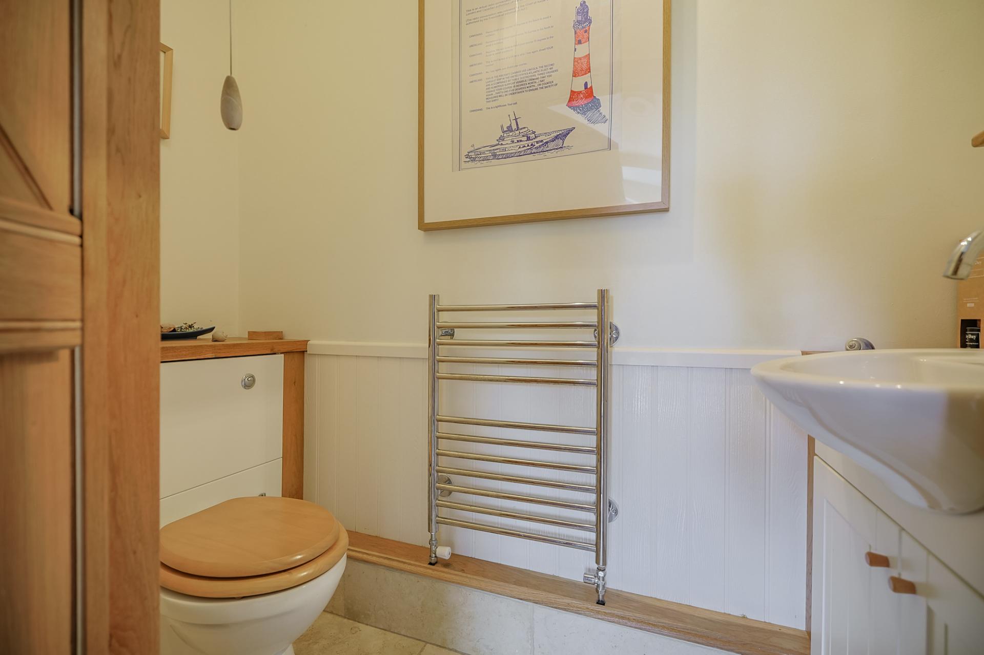 The ground floor WC is well-appointed and stylish, comprising a WC, wash basin with storage beneath, heated towel rail, extractor fan, and two shaving points. The space is finished with tiled flooring and attractive panelled walls.