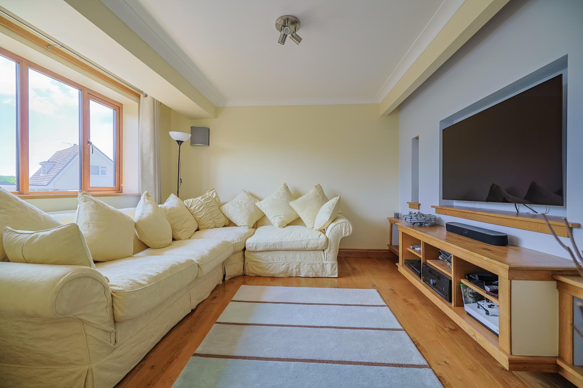 Currently used as a sitting room, this elegant front-facing space is flooded with natural light from a large window. Laid with oak flooring and framed with coving, this versatile room features a bespoke TV stand and shelving, making it ideal as a quiet retreat, playroom, or home office.