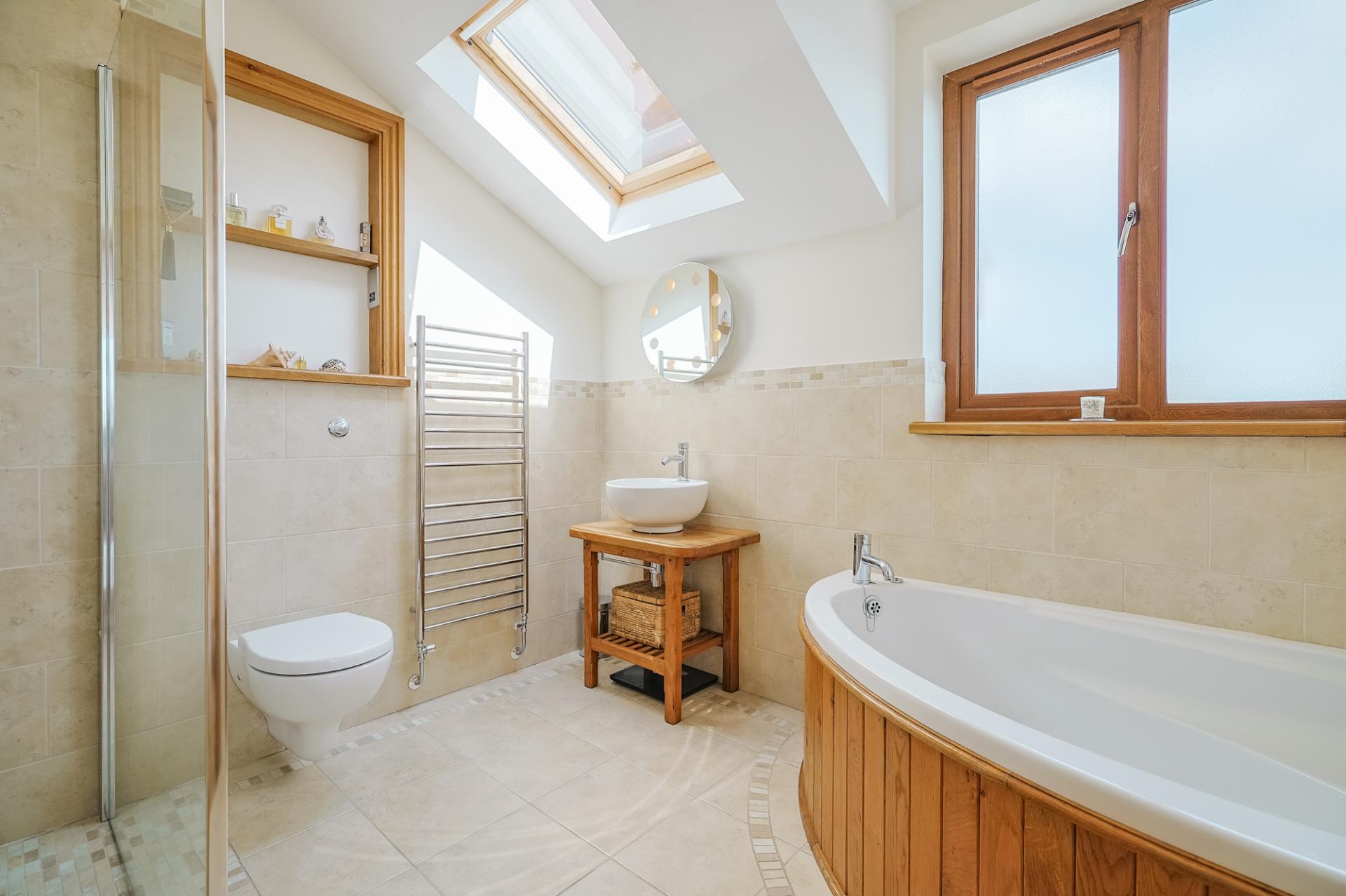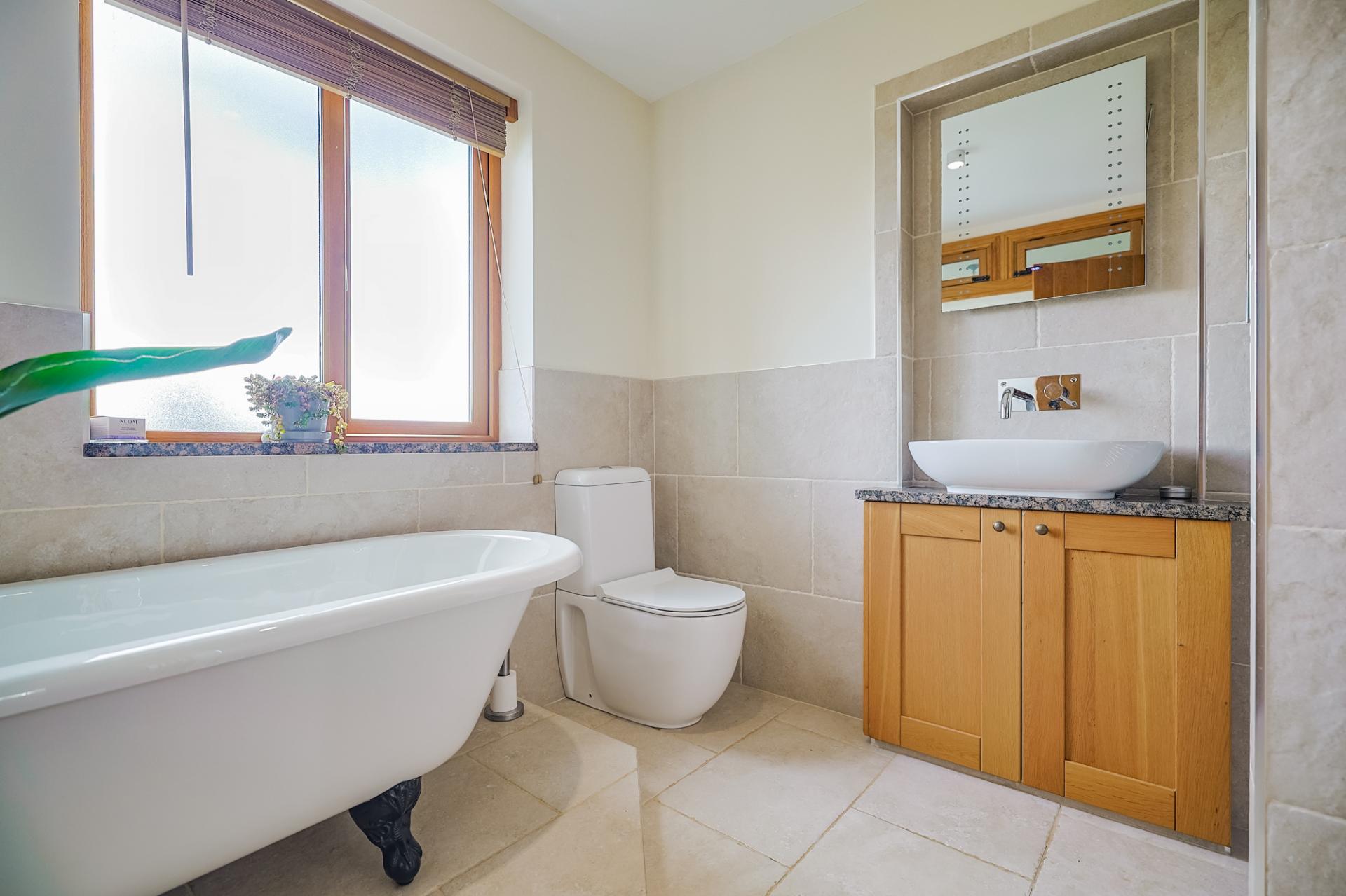 The stylish family bathroom offers a luxurious retreat, complete with a freestanding roll-top bath, WC, wash basin with granite-topped storage, a separate shower, heated towel rail, extractor fan, sensor-lit mirror, tiled flooring with partial tiled walls and a frosted front-facing window.