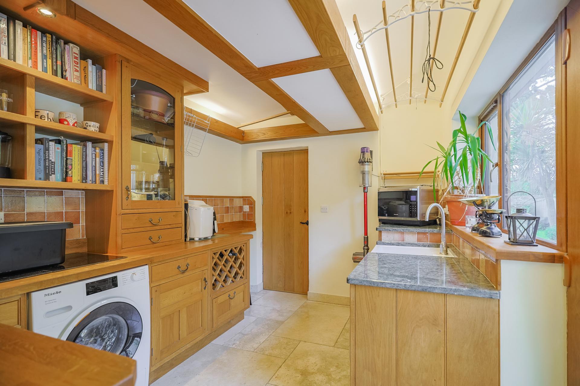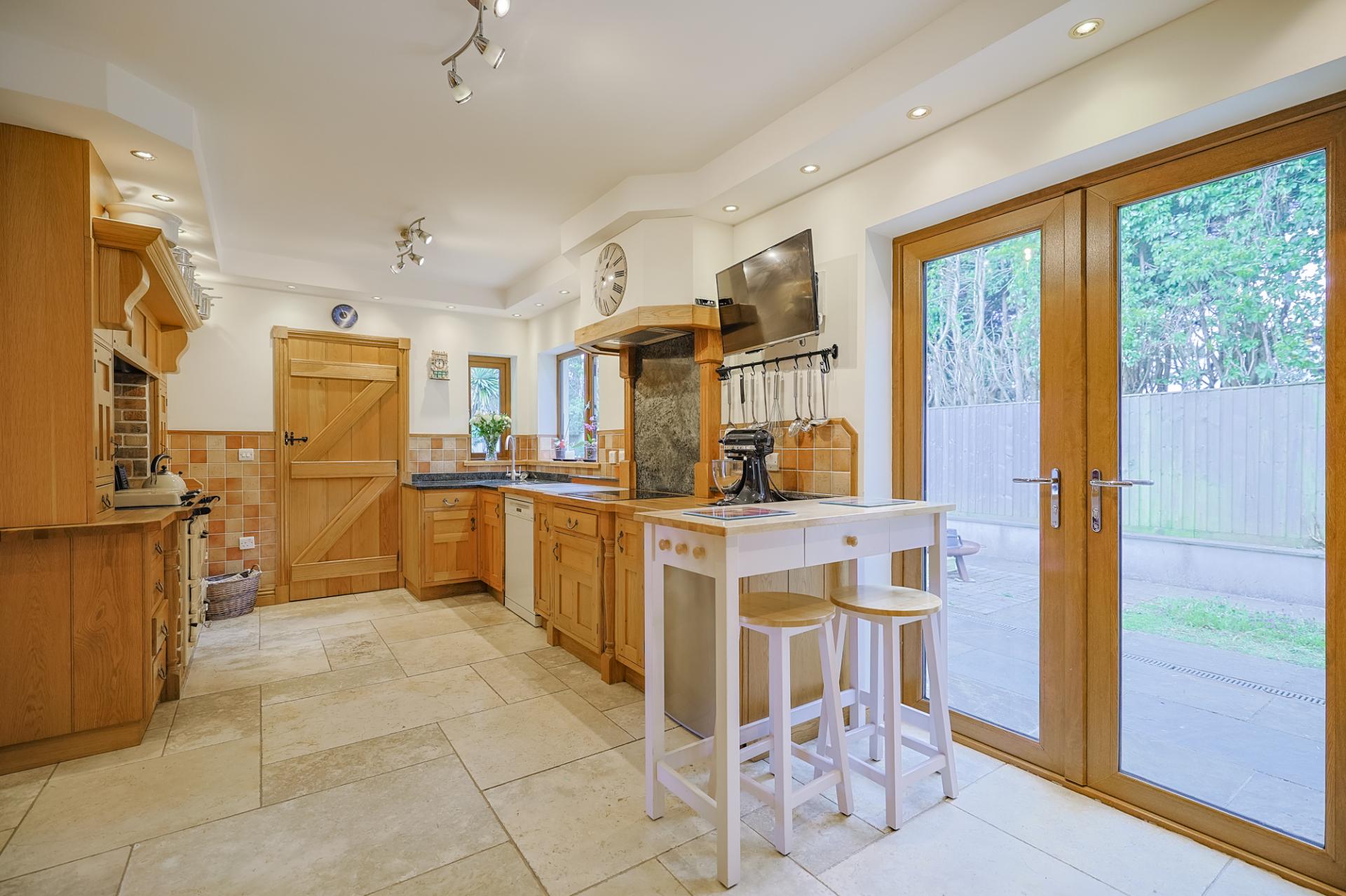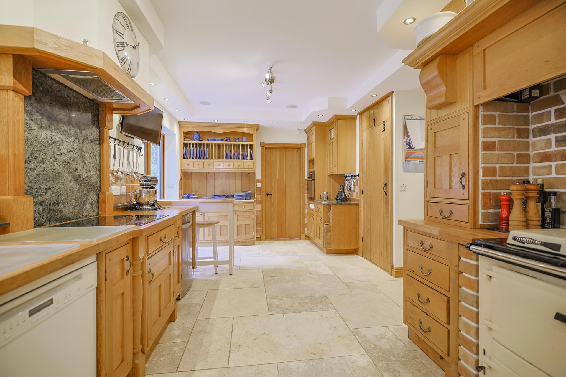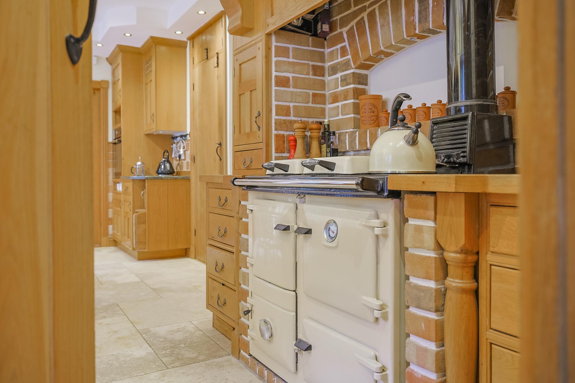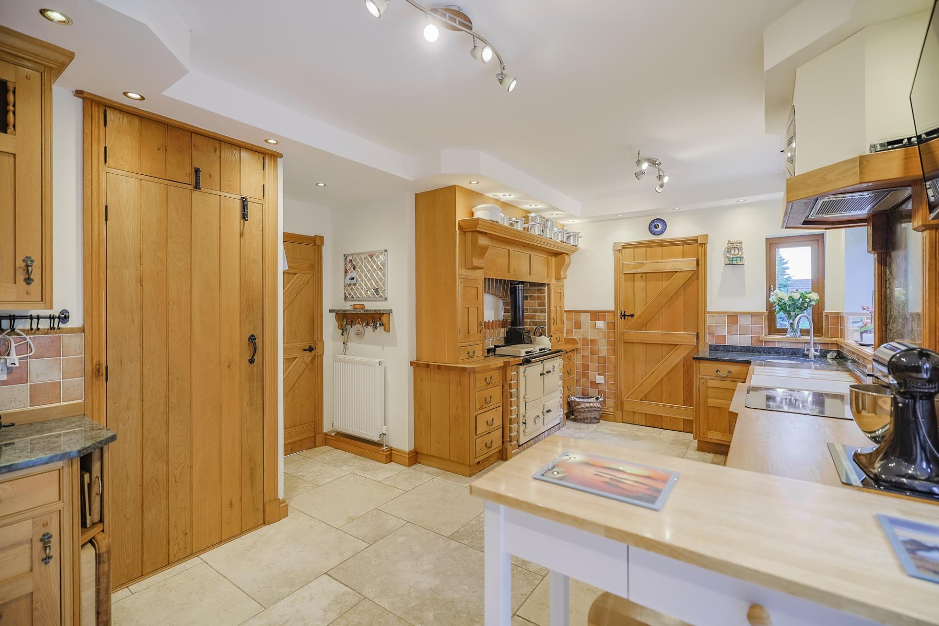 The heart of the home, this exceptional kitchen/breakfast room is accessed via the entranceway or dining room. Fitted with a comprehensive range of oak wall and base units topped with granite and oak worktops, the space also features a sunken porcelain sink, John Lewis oven and grill, John Lewis induction hob with elevated extractor, and a charming Rayburn with oven and hotplate. There’s space for two under-counter appliances and room for a two-seater breakfast bar. The room is illuminated by spot lighting, enriched by a built-in sound system and dual aspect windows, and includes the added benefit of a pantry with fitted shelving and a drawer. Double patio doors provide direct access to the rear garden, and there is further access to the utility room.