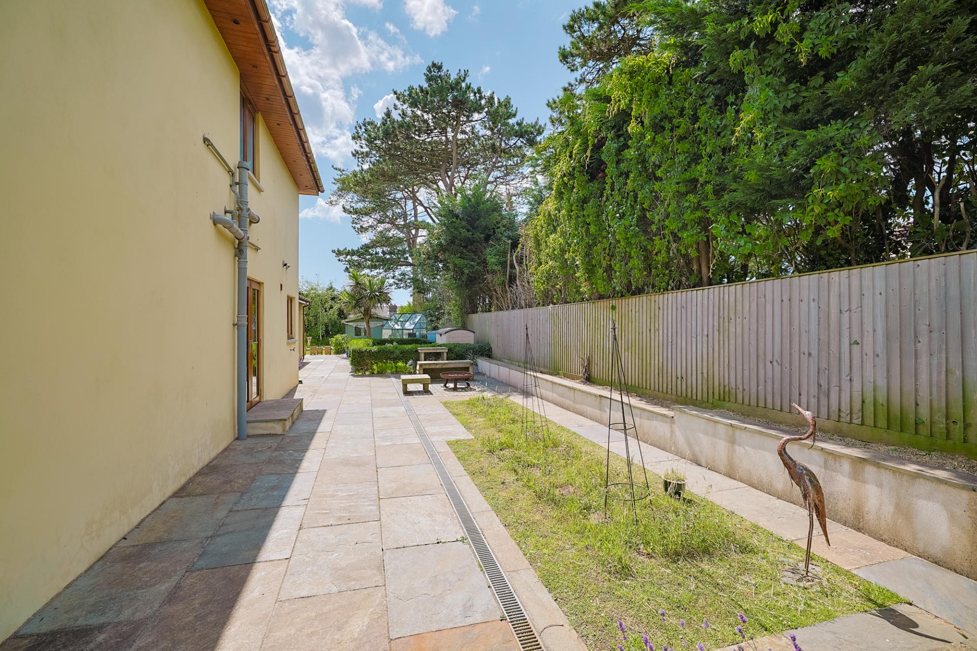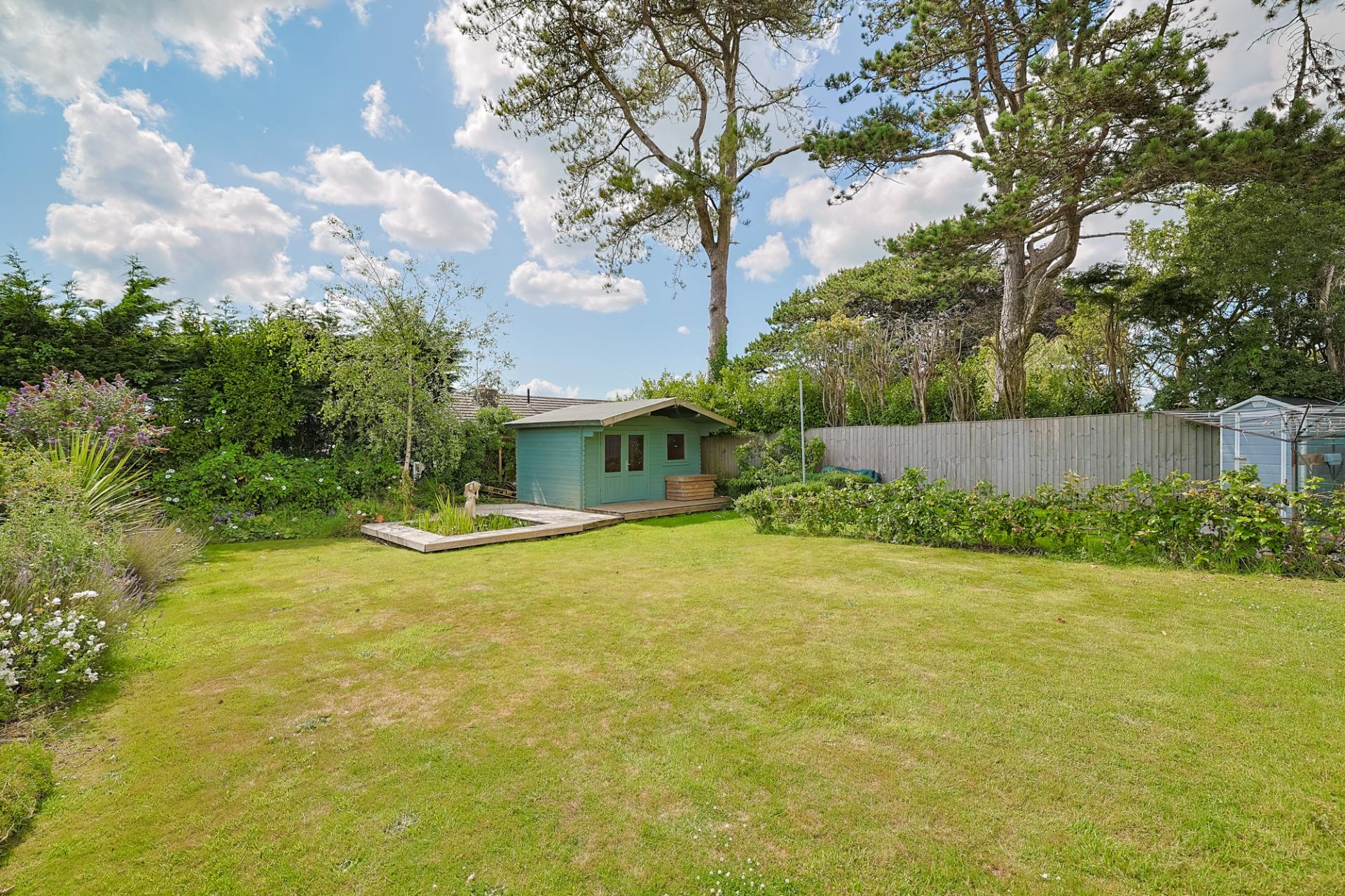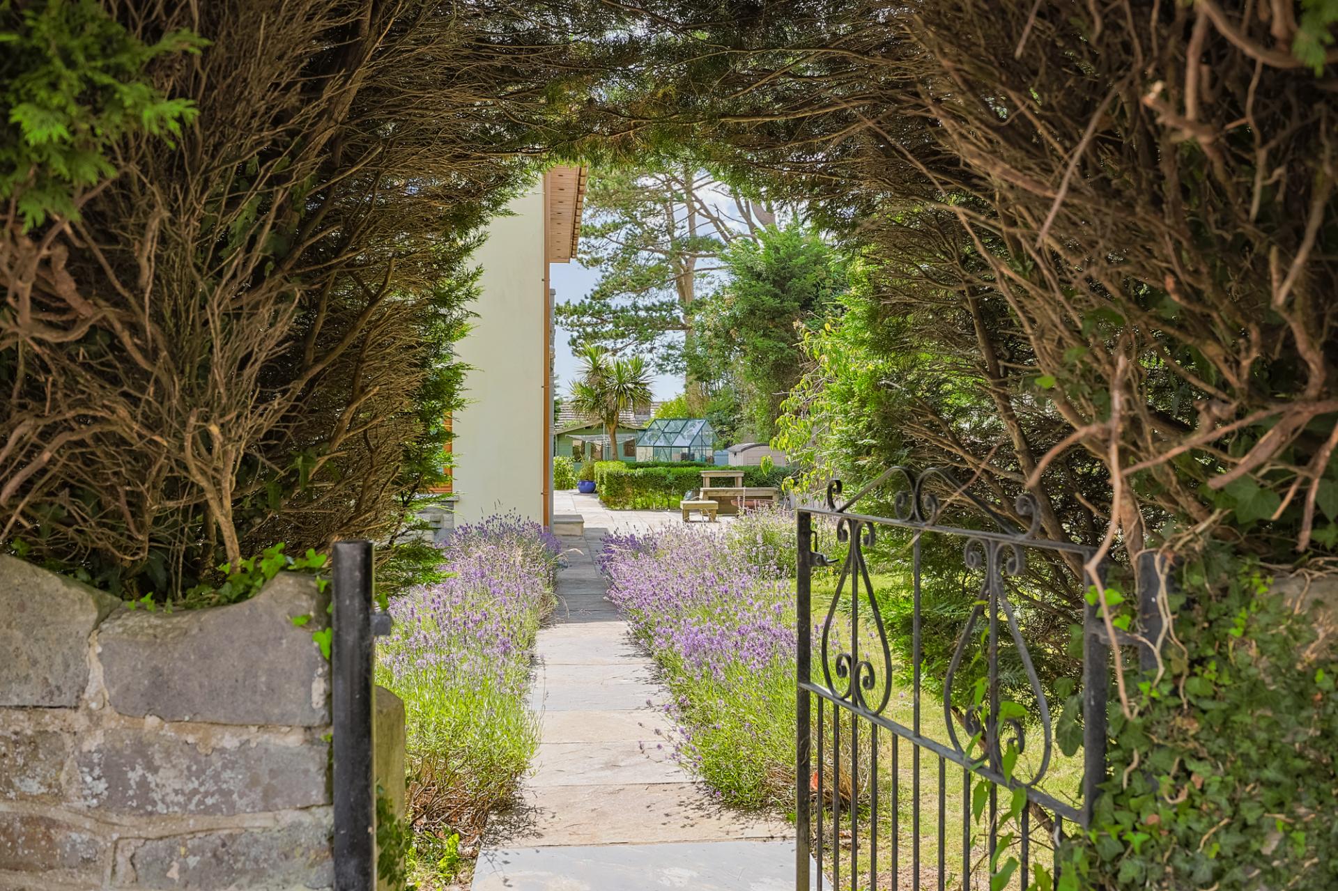 The beautifully landscaped gardens of 37 Foxhole Drive wrap around the property, offering privacy and an idyllic outdoor lifestyle. The lawns are manicured to perfection, bordered by colourful flowerbeds and mature shrubs and trees. Multiple seating areas provide the perfect settings to relax, entertain, and enjoy the peaceful surroundings. A paved slate pathway circles the property, leading you past a charming lily pond, a garden shed and greenhouse – both fitted with electricity – a wood store, and an archway through the shrubs providing additional pedestrian access to the main Southgate Road.