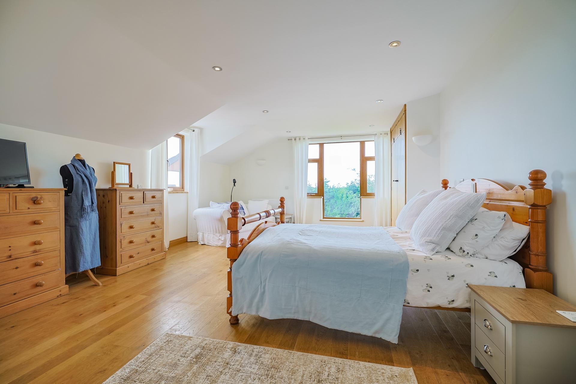 The luxurious principal suite is truly impressive. A carpeted hallway leads to the main bedroom, passing built-in wardrobes with double doors and an additional wardrobe. The bedroom opens into a vast space filled with light from dual aspect windows – one offering spectacular views over the garden and toward Cefn Bryn. This tranquil room features oak flooring, spotlighting, an alarm control panel, and two further built-in wardrobes. The spacious en-suite includes a WC, wash basin, large walk-in shower, fitted corner bath, heated towel rail, extractor fan, sound system, spotlighting, two shaving points, oak shelving in an alcove, tiled flooring, partially tiled walls, a Velux window, and a frosted window to the front.