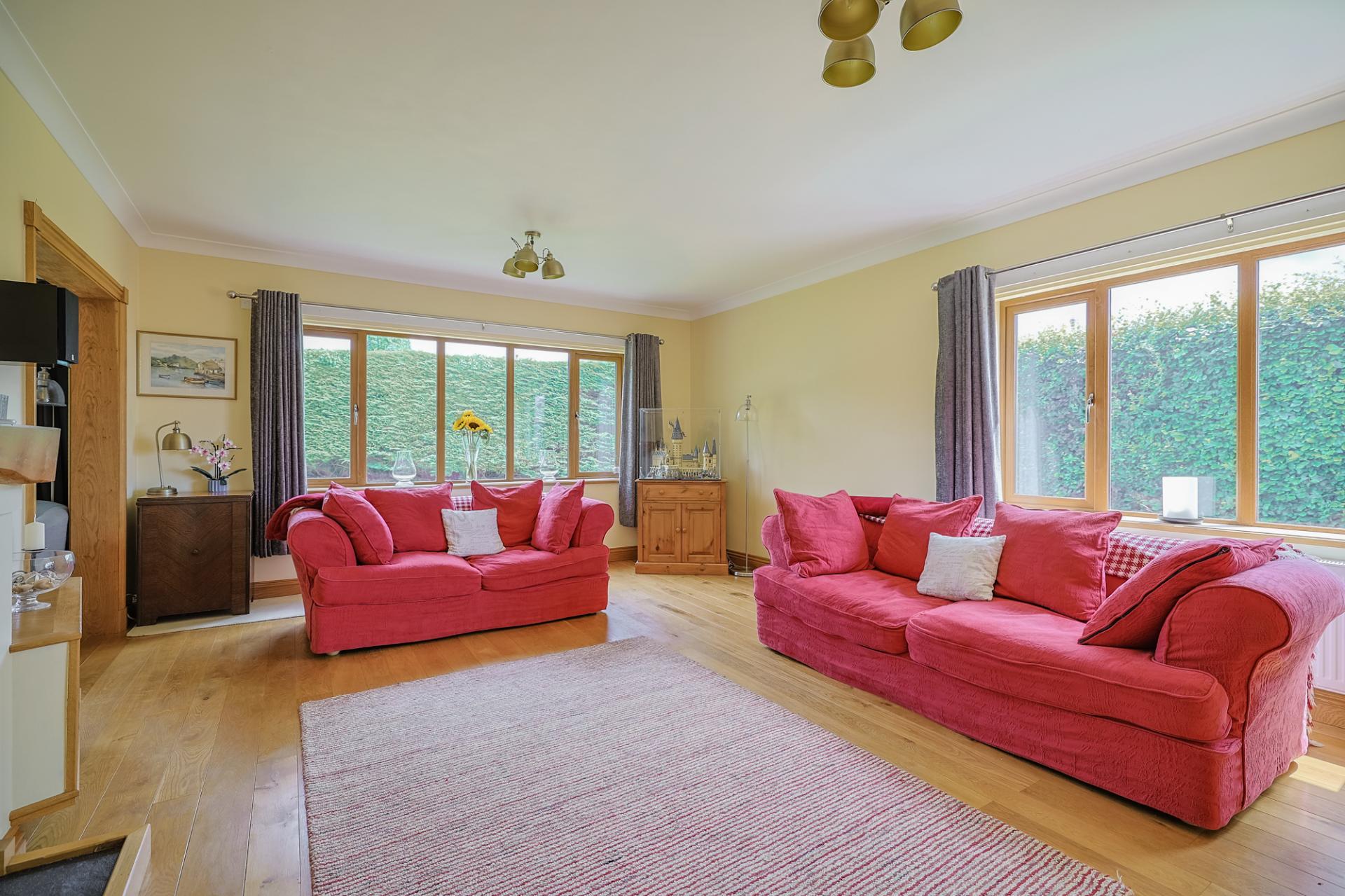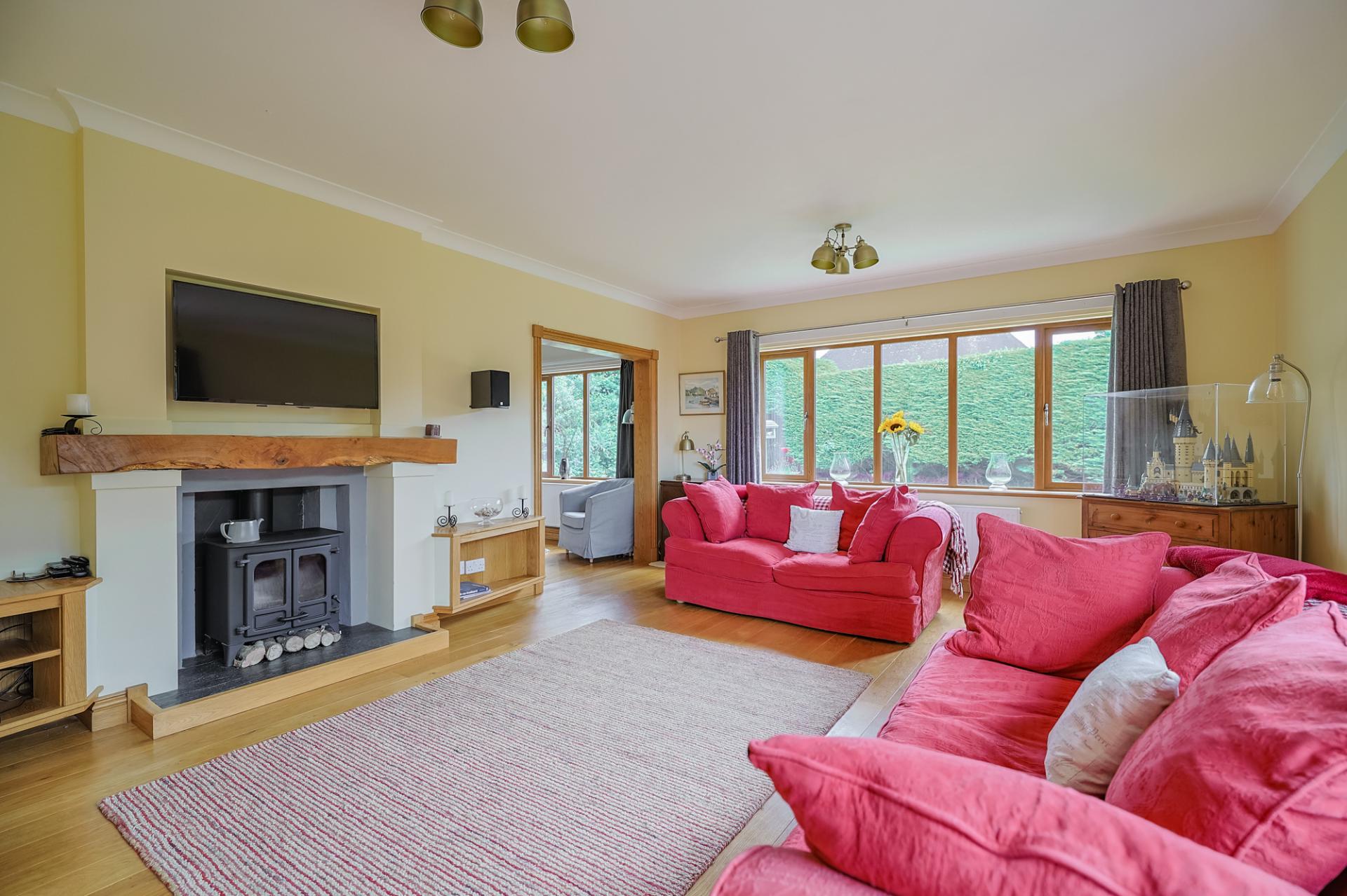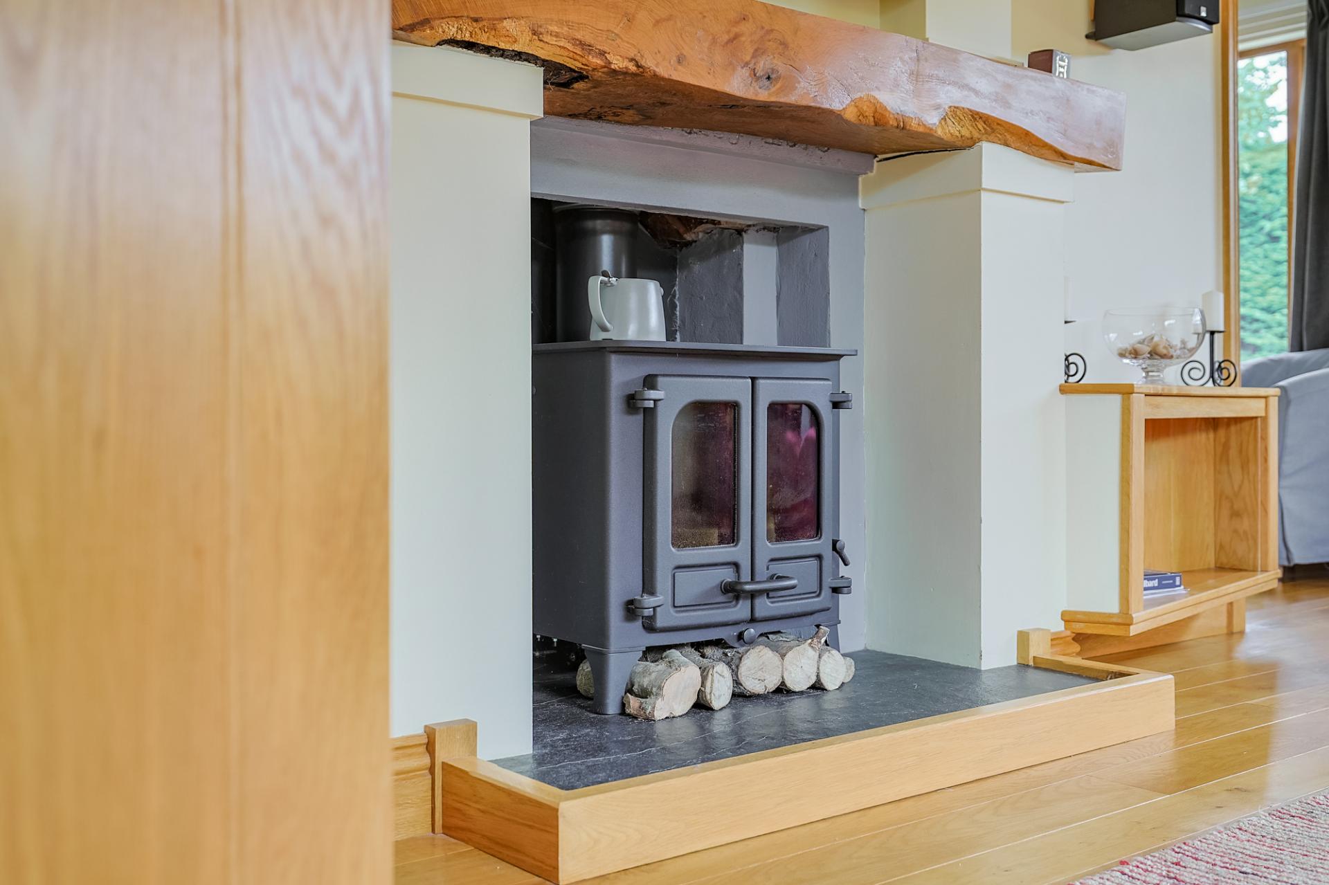 Another wonderfully bright and welcoming space, the lounge enjoys dual aspect windows with views over the garden. Cosy yet spacious, it features oak flooring, coving, a fitted TV stand and shelving, and a stunning fireplace complete with a slate hearth, locally sourced oak mantel, and charming log burner.