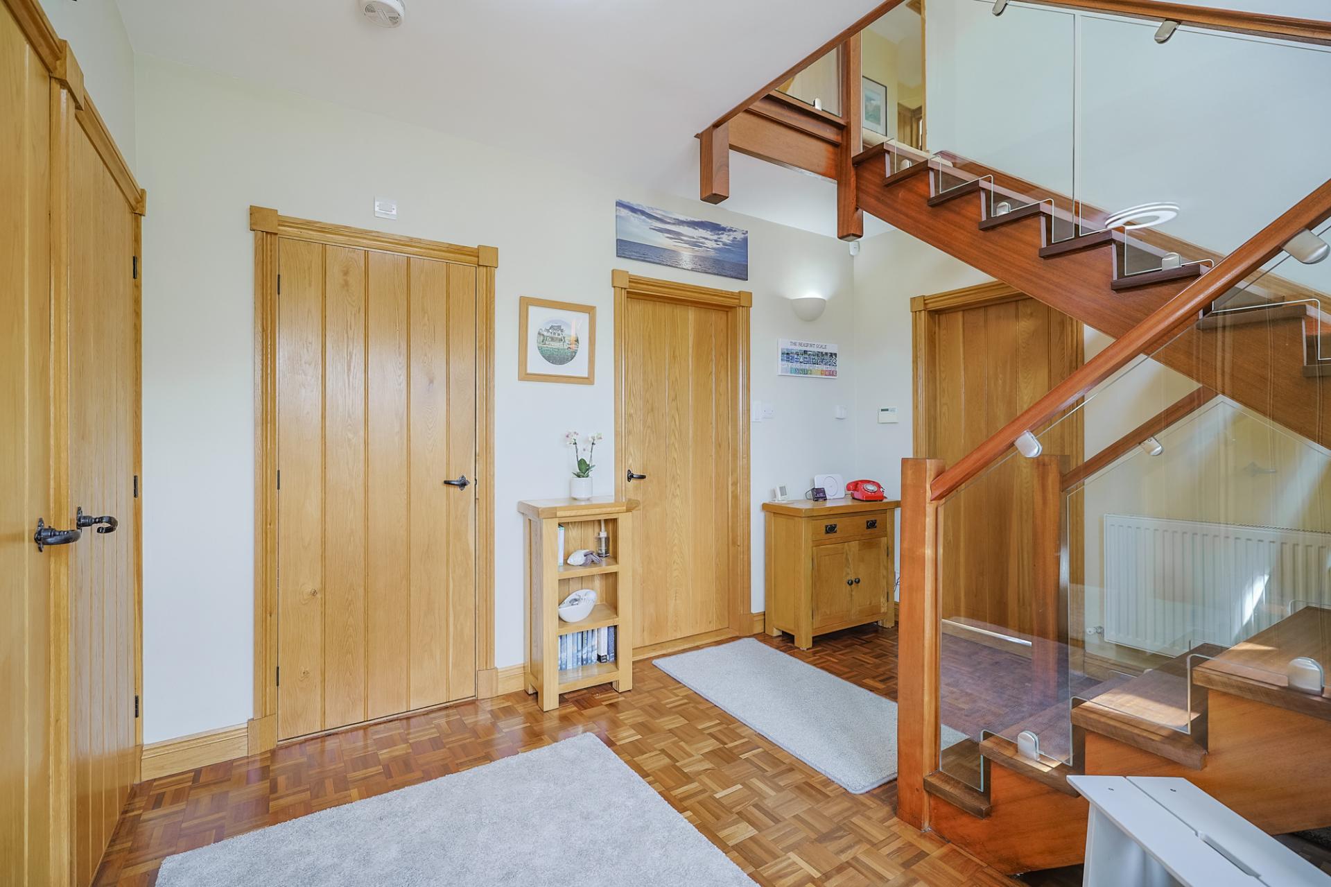 Step into a bright and welcoming entrance hall, illuminated by a frosted glass front door and flanking frosted windows. This generous central hub of the home features a combination of parquet and tiled flooring and provides access to the sitting room, lounge, kitchen/breakfast room, ground floor WC, cloak cupboard, and an additional storage cupboard complete with fitted shelving. Oak detailing is found throughout, including oak sills and shelving, while the space is finished with the alarm system control panel for added security and peace of mind.