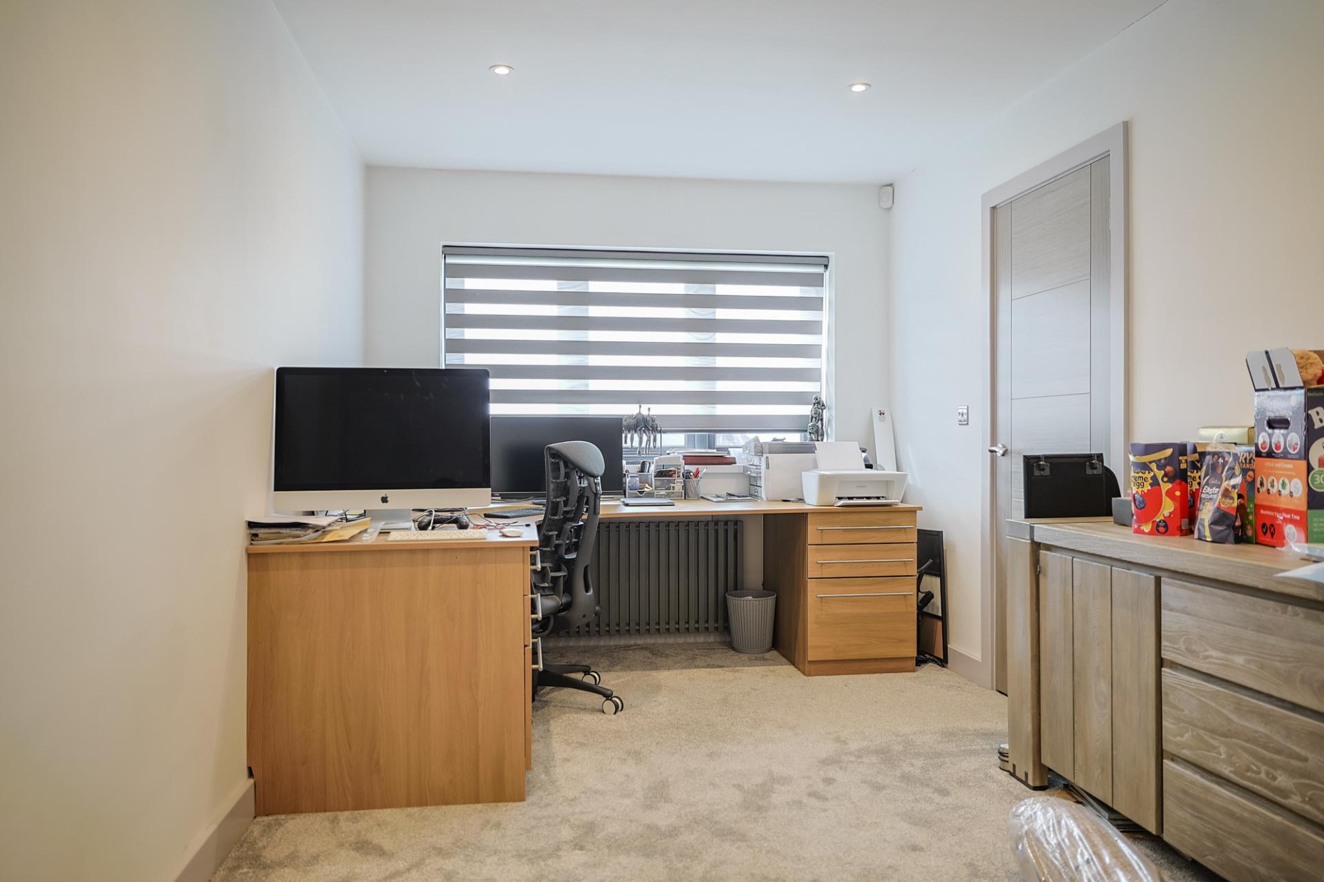 A versatile space currently set up as a home study, this additional reception room offers carpeting, a window to the front overlooking the village green, and spotlighting. Ideal as a snug, playroom, or formal office depending on your lifestyle.