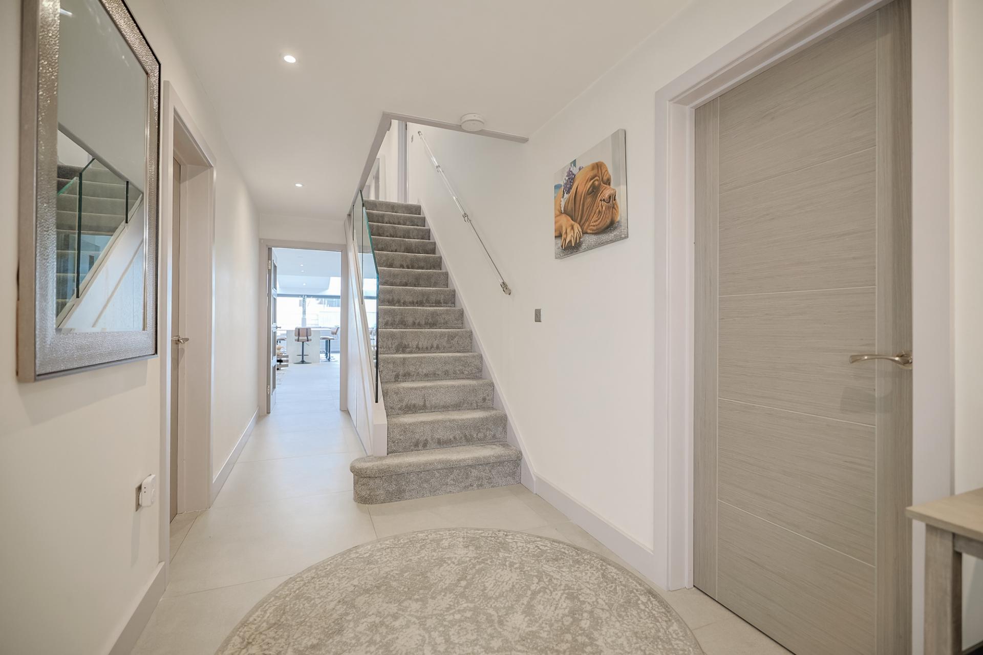 Let us now ascend the carpeted stairway with glass balustrade to the top floor, where a generous landing with Velux window introduces the show-stopping Principal Suite.