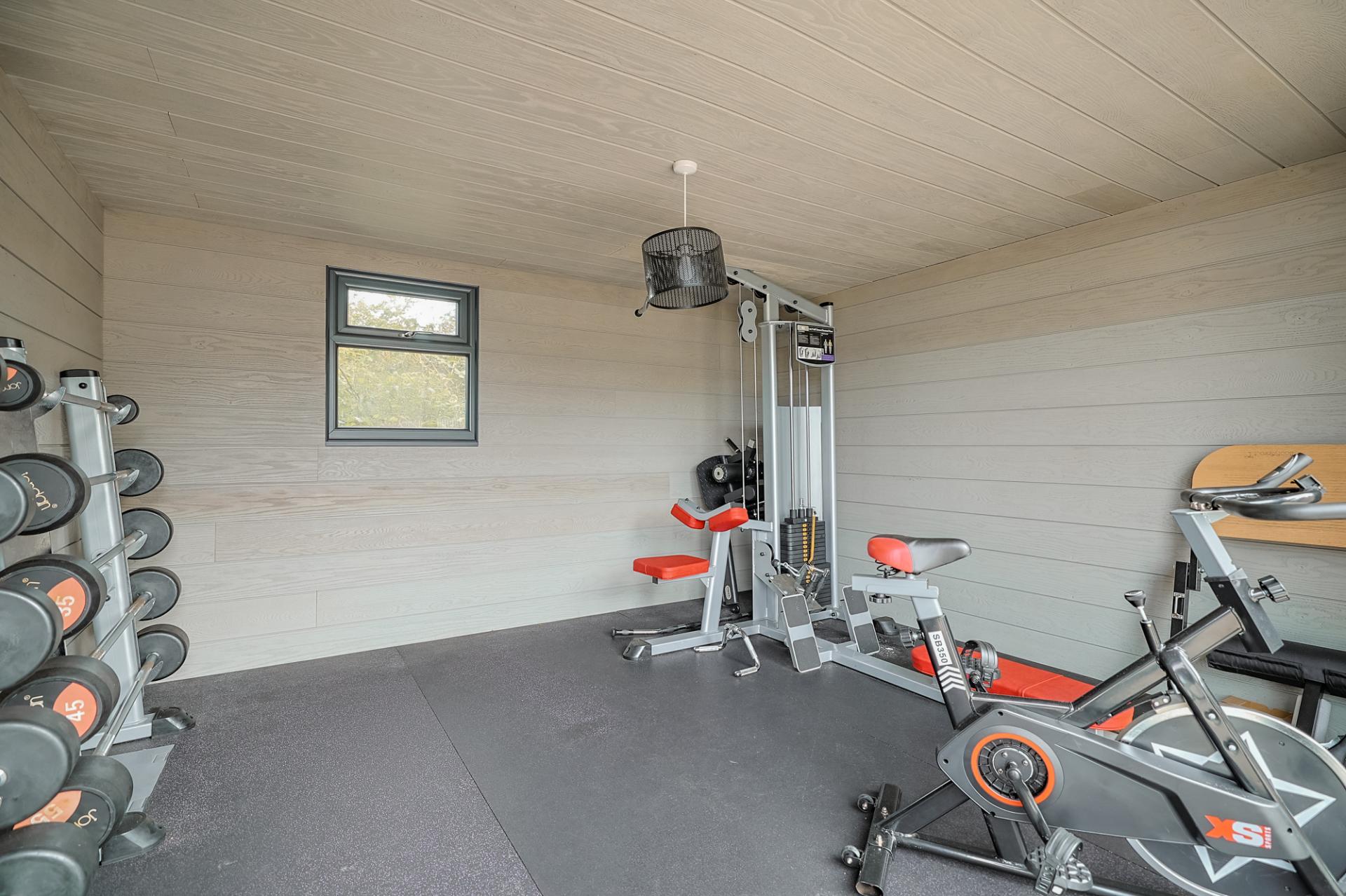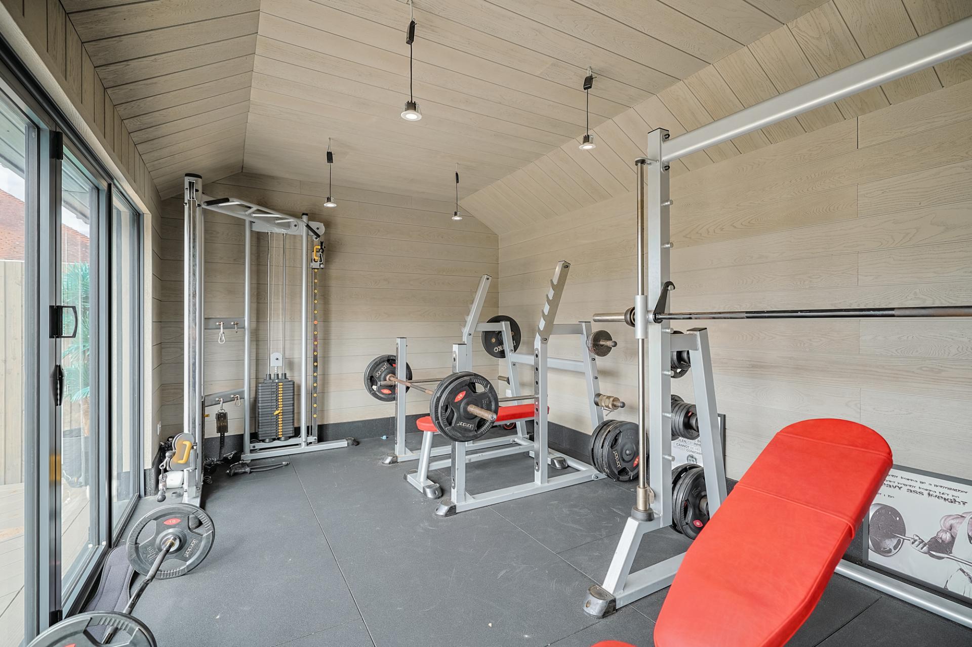 To the rear, a superb garden room currently serving as a home gym offers even more versatility. Laid out as two separate rooms, both with bi-folding doors, lighting and electrics, this space could easily be reimagined as a home office, creative studio, or private retreat.