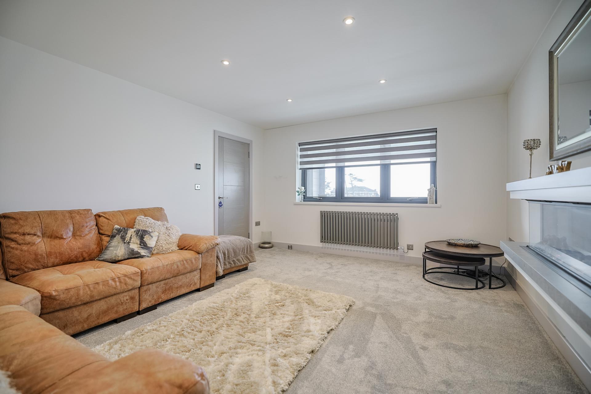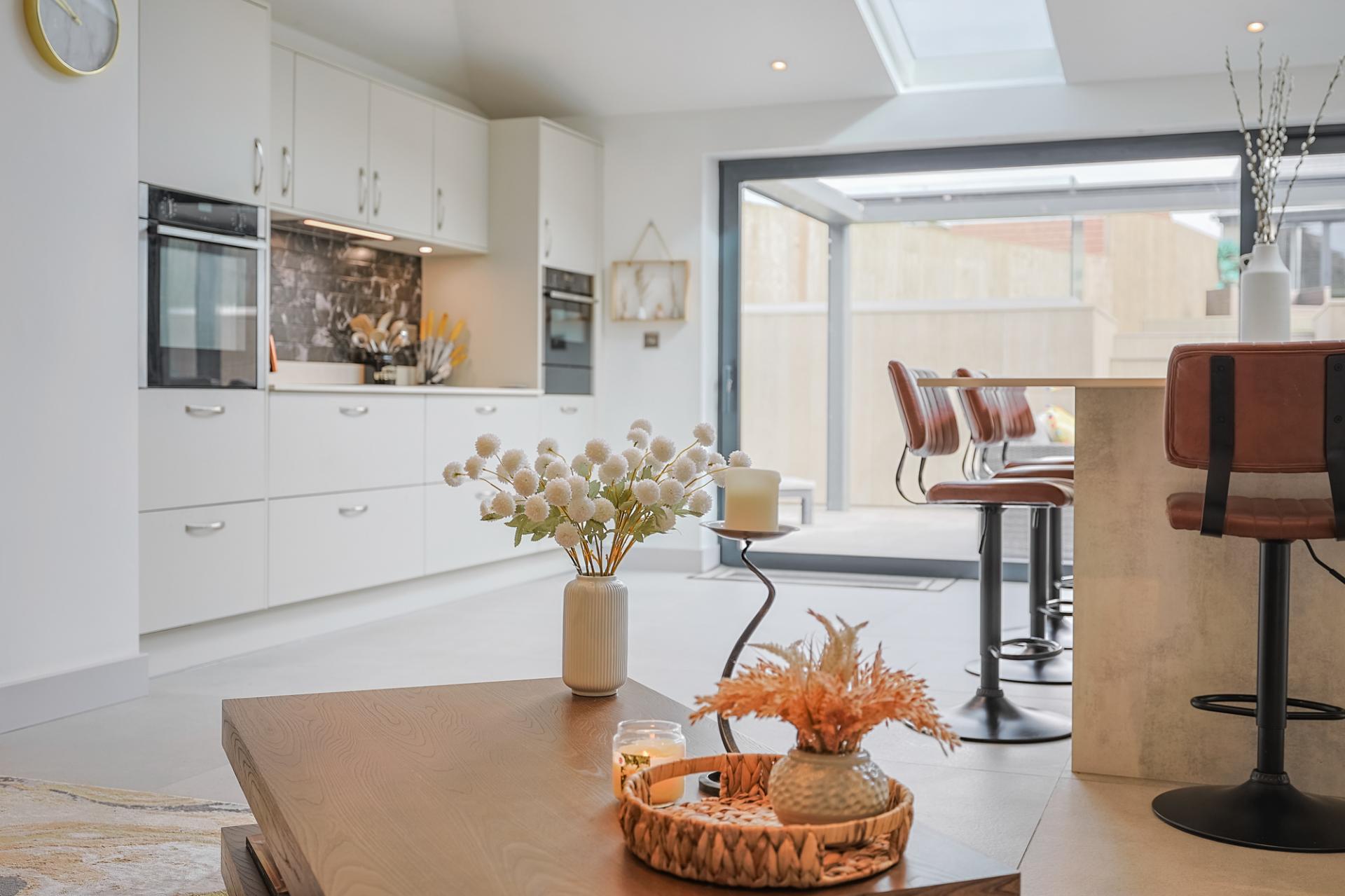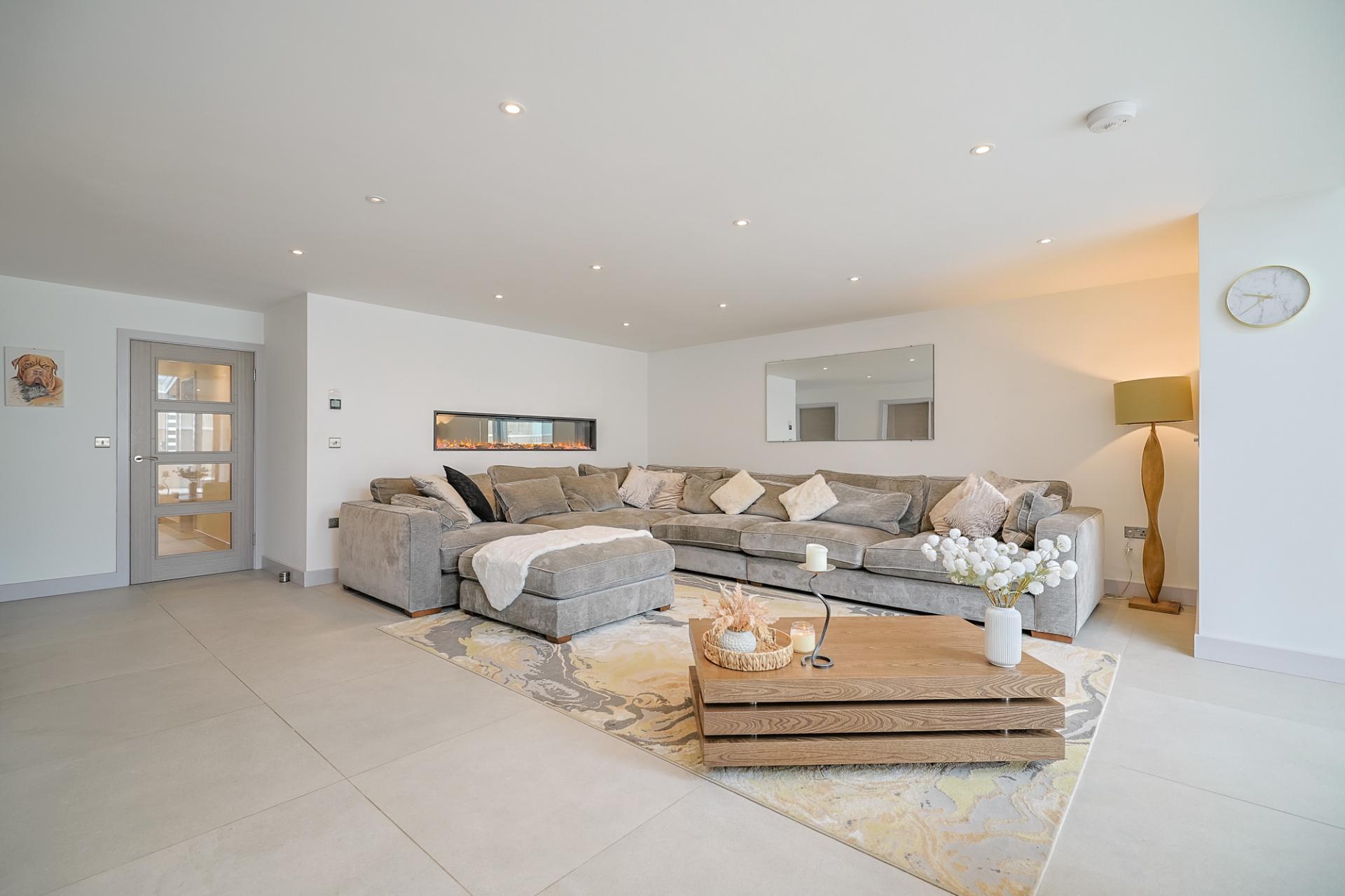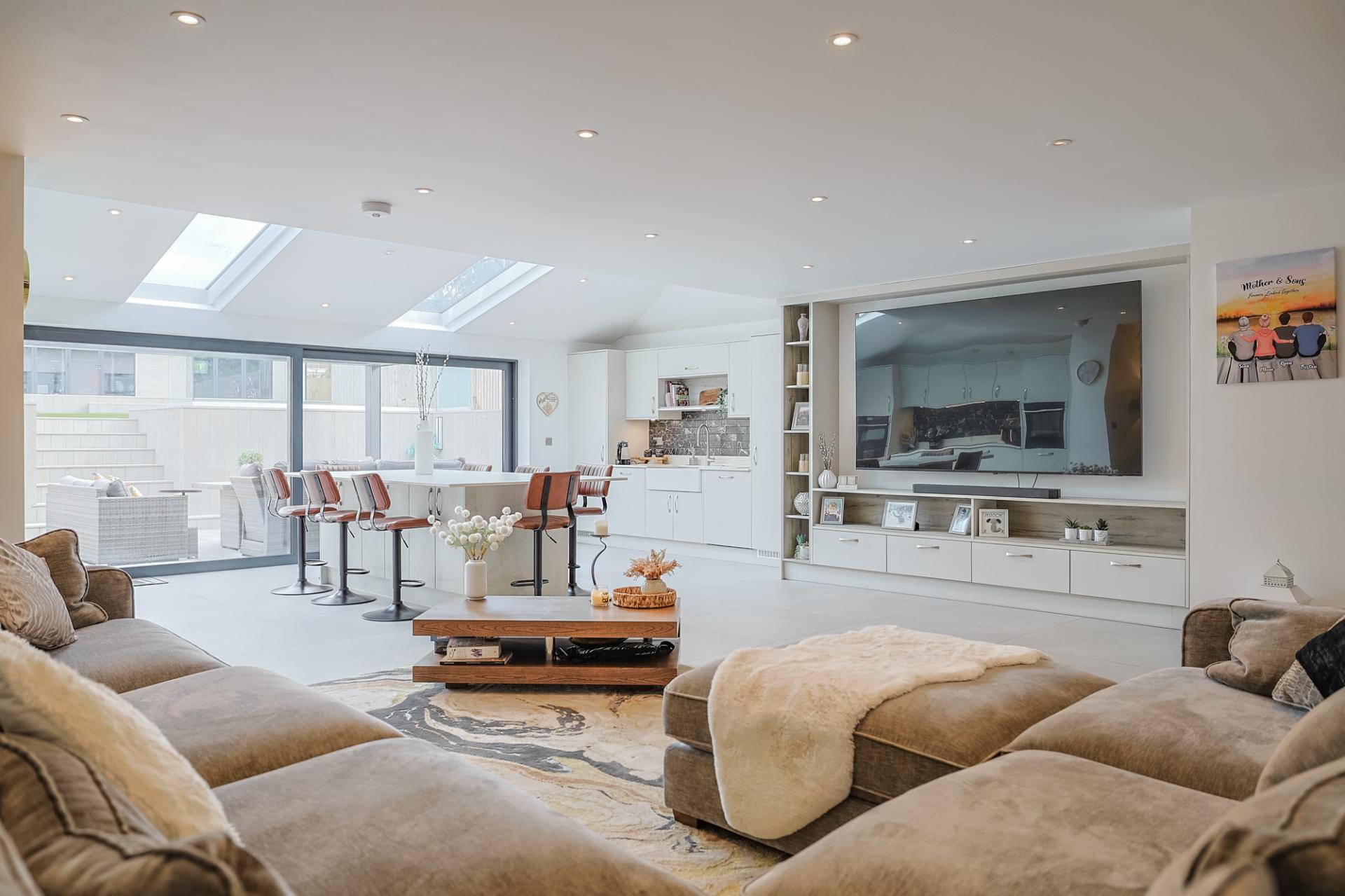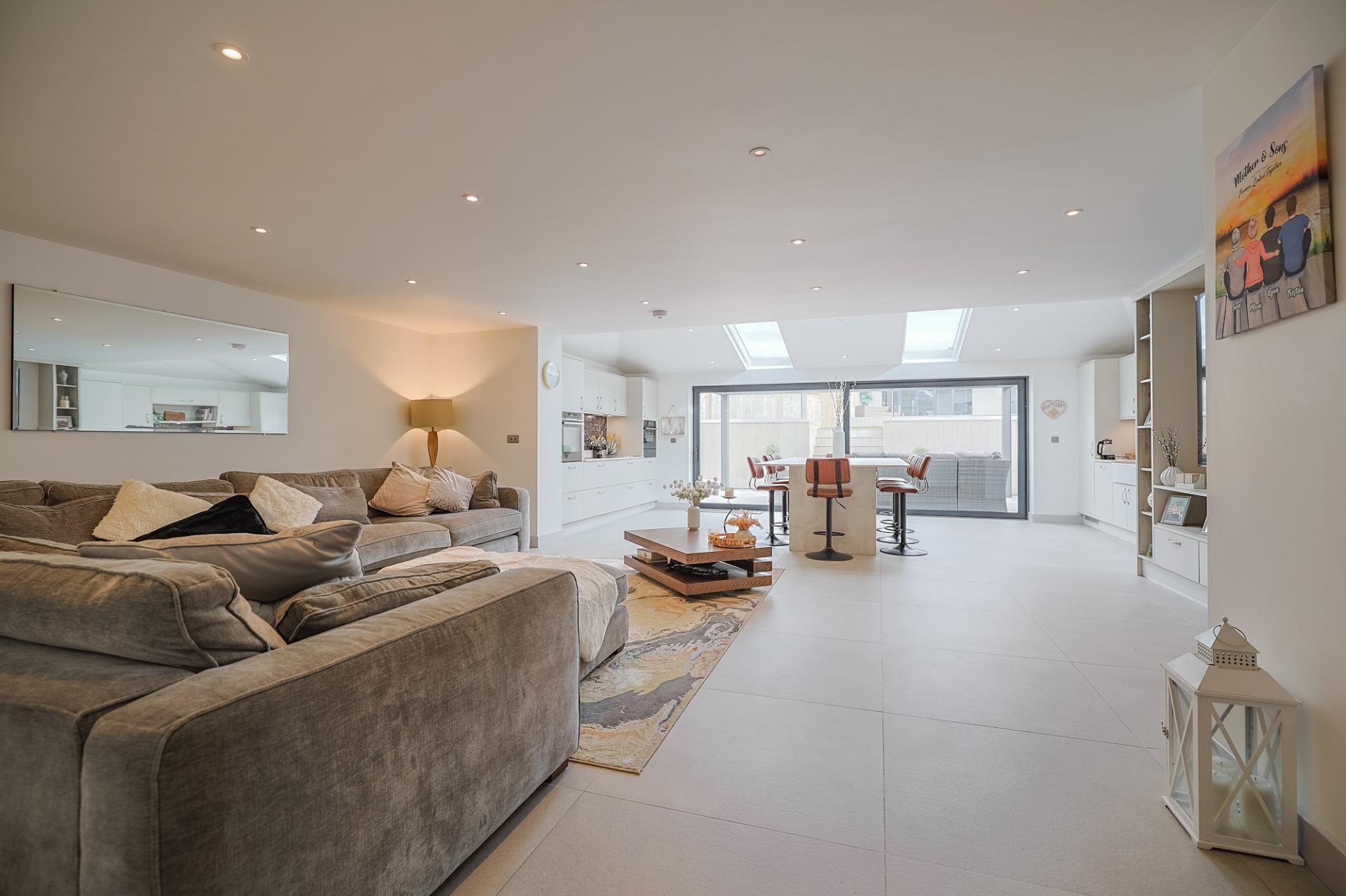 The kitchen is exceptionally well-equipped, boasting a wide range of integrated NEFF appliances, including an oven/microwave, oven/grill, 5-ring electric induction hob, dishwasher, and a tall fridge, all complemented by a double porcelain sink with swan tap, an elevated Elica extractor fan and a separate tall Leibherr freezer. Sleek worktops, wall and base units, and a central island complete the design, with the island offering additional storage and space for casual dining or evening meals after a long day. There's also ample room for a lounge area, making this a truly versatile, light-filled living hub for the whole family to enjoy.