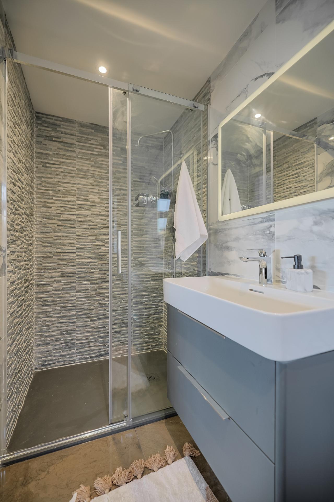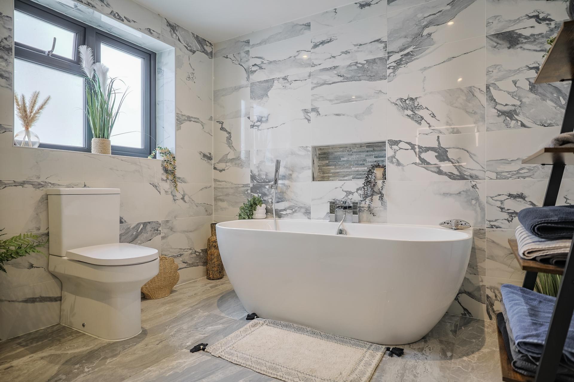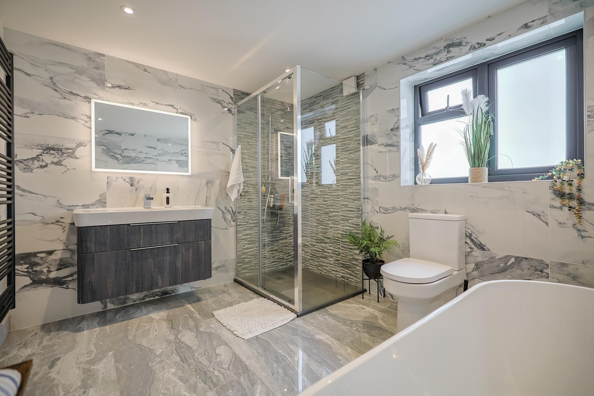 Elegantly appointed, this family bathroom includes a WC, wash basin with under-storage, a large double shower, a feature bath with handheld shower head and inset shelf, heated towel rail, touch-sensor mirror, spotlighting, tiled flooring and walls, extractor fan, and a frosted side window.