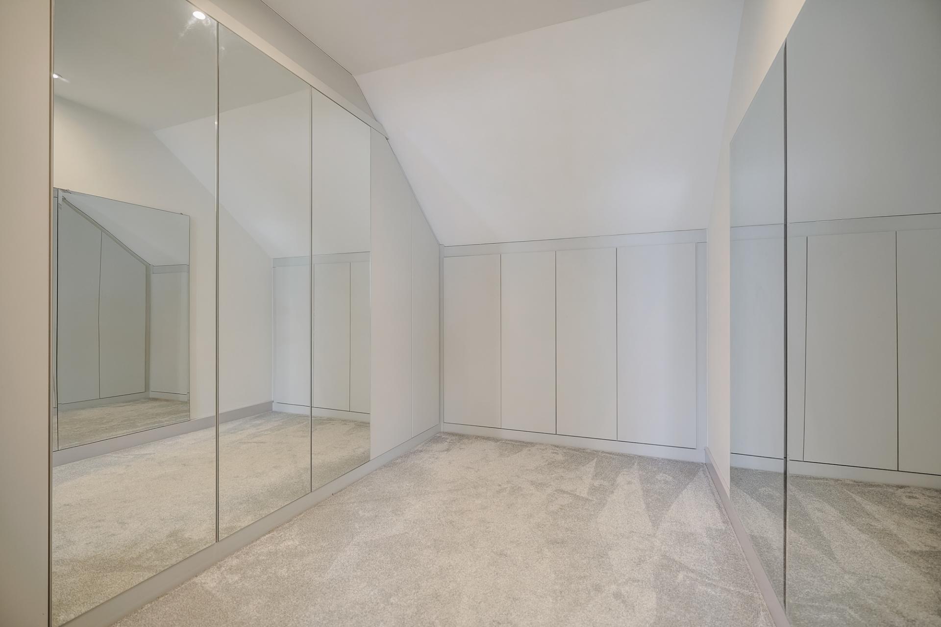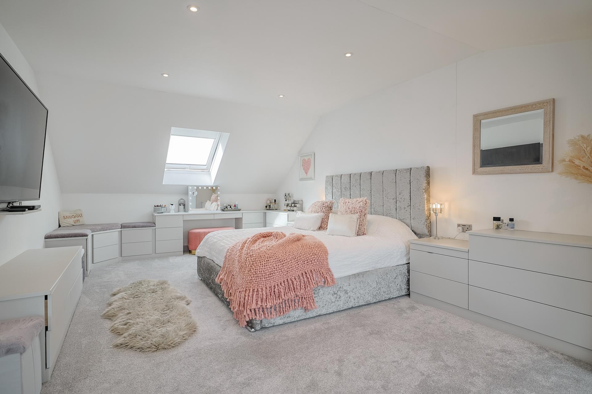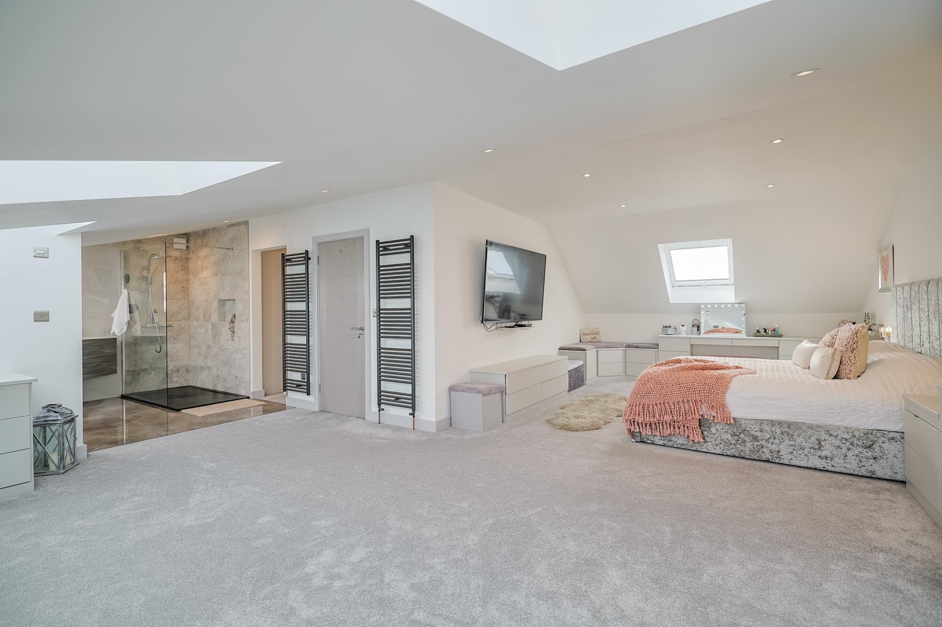 This luxurious and expansive room is bathed in natural light from five Velux windows. Offering carpeting and spotlighting, this room includes a full array of fitted wardrobes, drawers, dressing table, workspace, and air conditioning. The en-suite is open to the bedroom and features a twin wash basin with under-storage, walk-in shower, feature bath with handheld shower head, twin heated towel rails, two inset shelves, extractor fan, touch-sensor mirror, tiled flooring and walls, and spotlighting. Beyond the en-suite lies a dressing area with a full range of fitted wardrobes, hanging rails, and shelving.