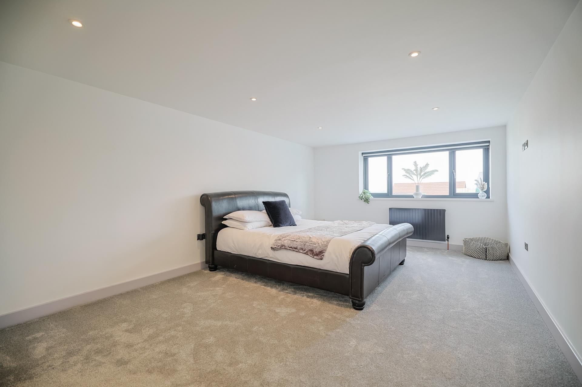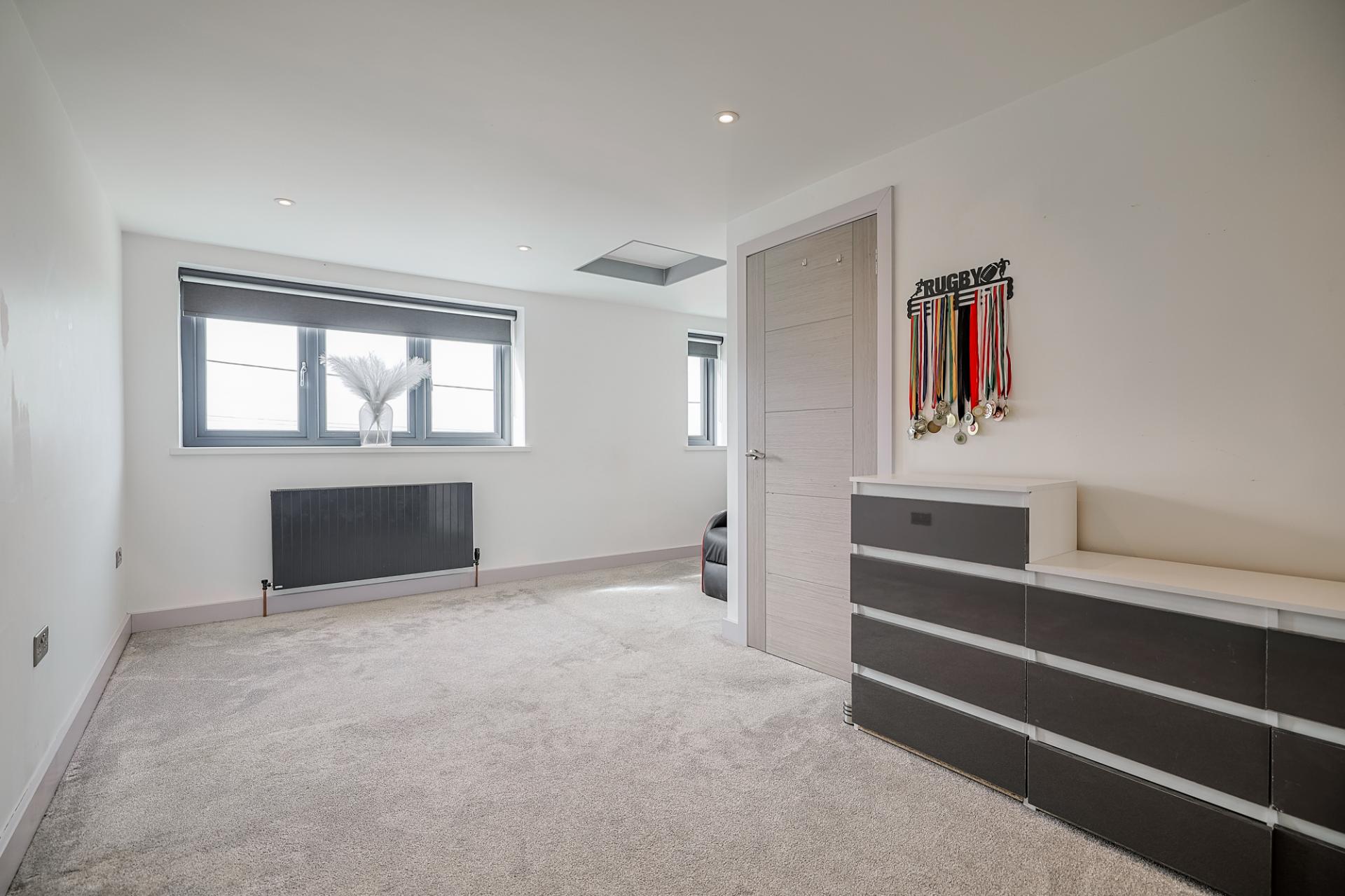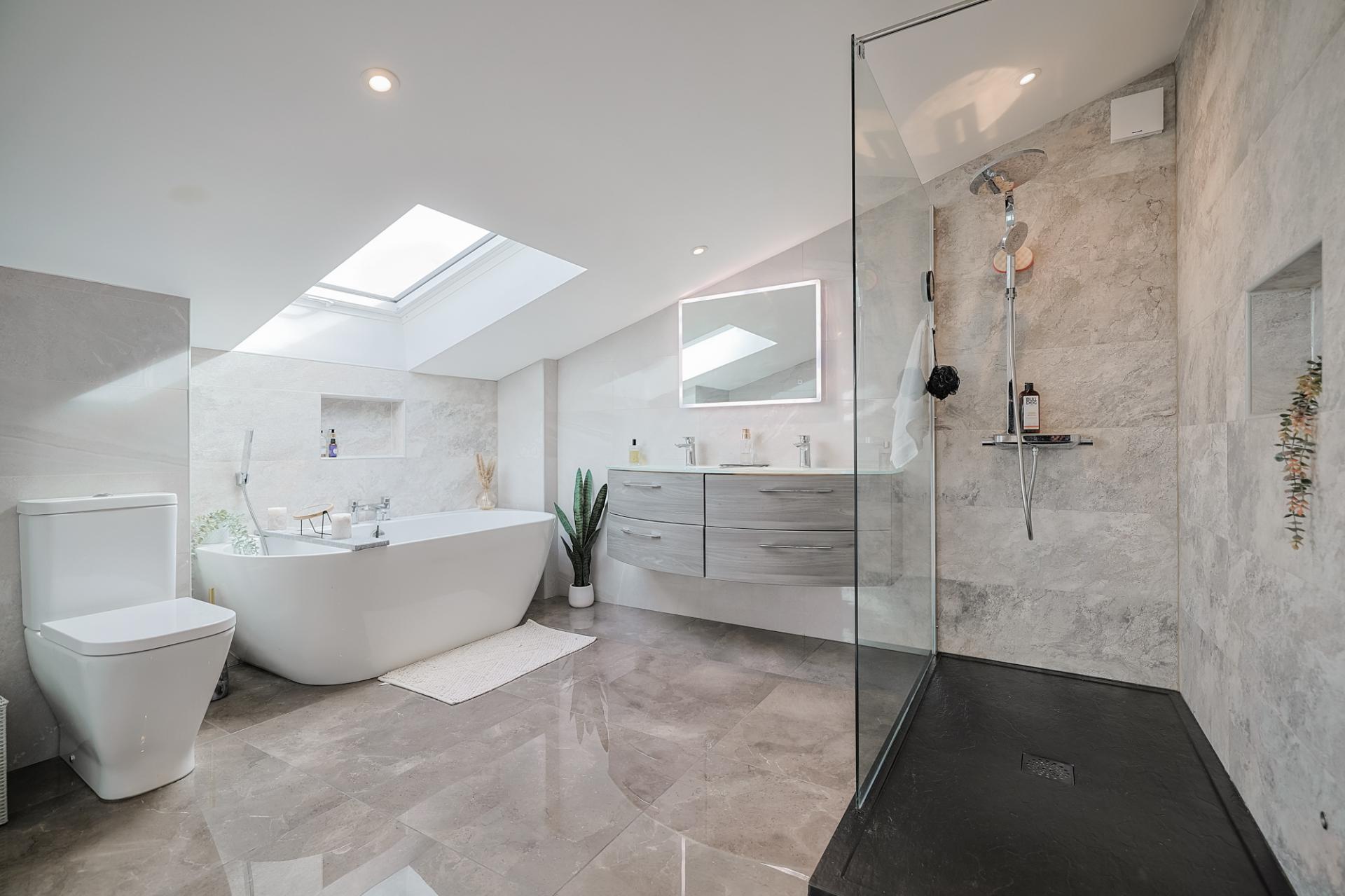 This luxurious and expansive room is bathed in natural light from five Velux windows. Offering carpeting and spotlighting, this room includes a full array of fitted wardrobes, drawers, dressing table, workspace, and air conditioning. The en-suite is open to the bedroom and features a twin wash basin with under-storage, walk-in shower, feature bath with handheld shower head, twin heated towel rails, two inset shelves, extractor fan, touch-sensor mirror, tiled flooring and walls, and spotlighting. Beyond the en-suite lies a dressing area with a full range of fitted wardrobes, hanging rails, and shelving.