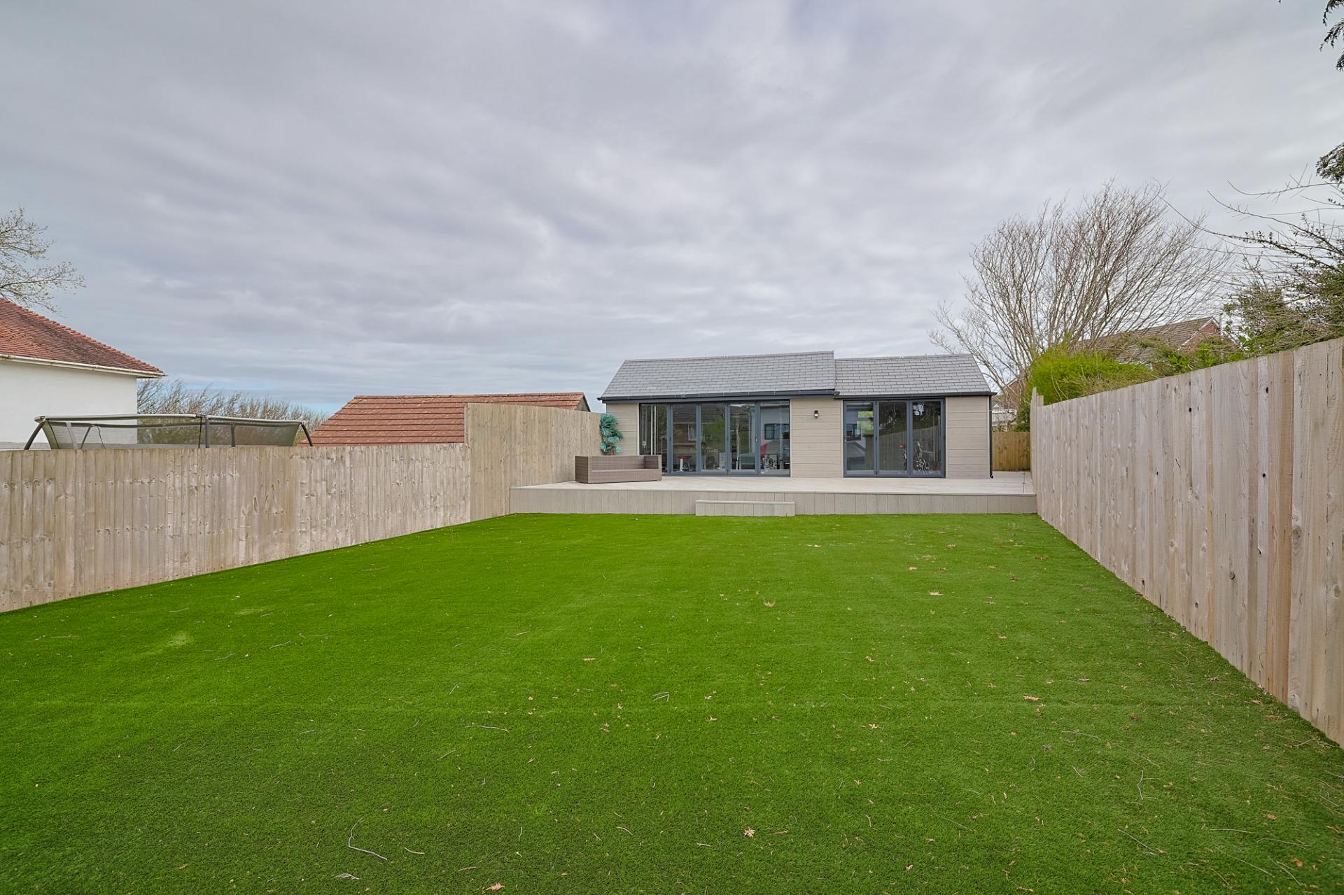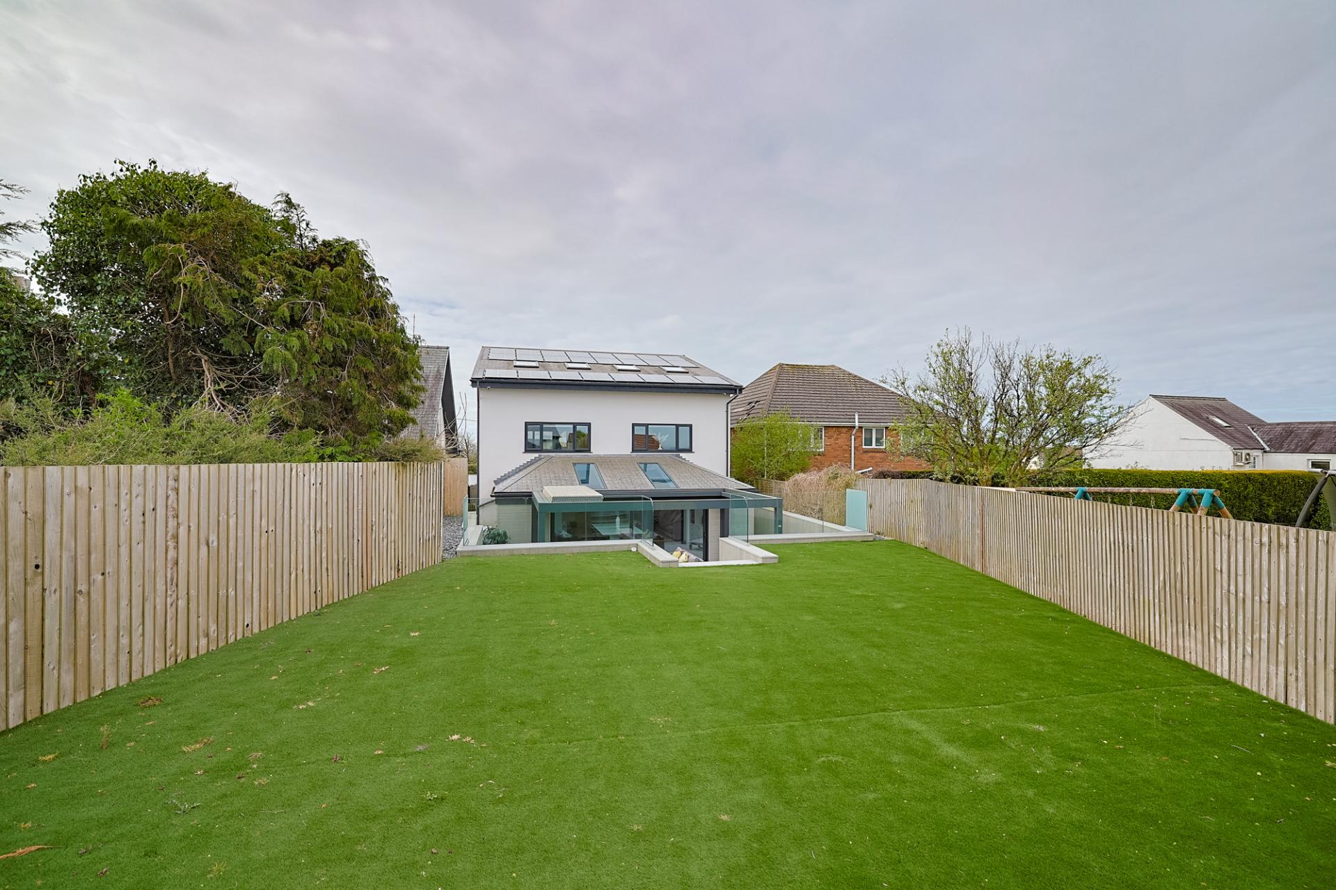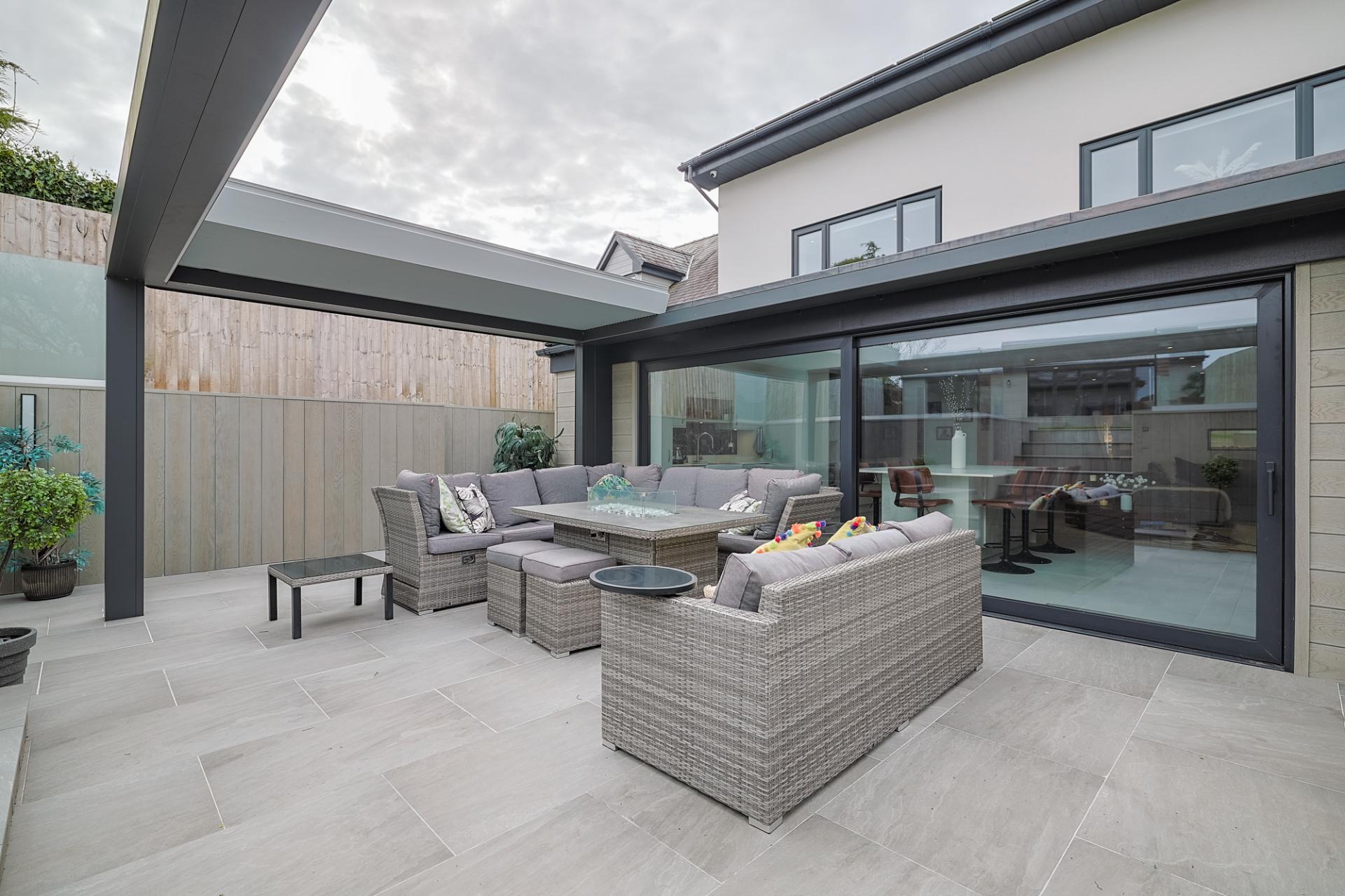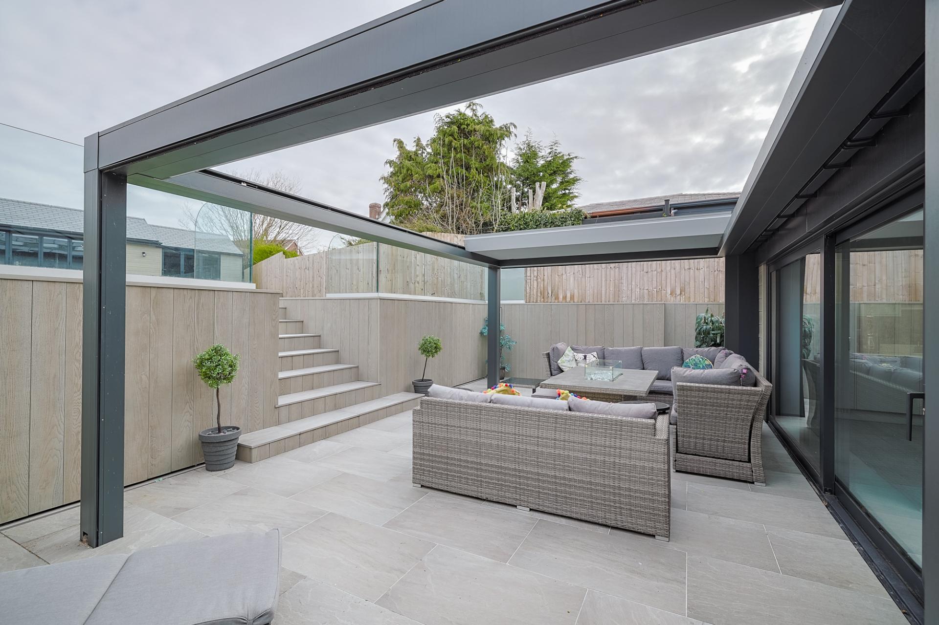 The garden of this exceptional home offers a beautifully designed, contemporary outdoor retreat that perfectly complements the indoor living space. Effortlessly accessed through expansive glass sliding doors from the kitchen, it creates a seamless transition between inside and out, ideal for modern family living and entertaining. The space can also be accessed from the front of the property via secure gated pathways on either side, ensuring a safe, enclosed environment for children and pets. A stylish patio area provides the perfect setting for al fresco dining or lounging, complete with a versatile canopy that can be opened or closed, allowing year-round enjoyment. Steps lead to an elevated, low-maintenance AstroTurf lawn bordered by sleek fencing and glass balustrade, offering ample room for relaxation or play. Additional outdoor features include integrated lighting and power, enhancing the space for both day and evening use.