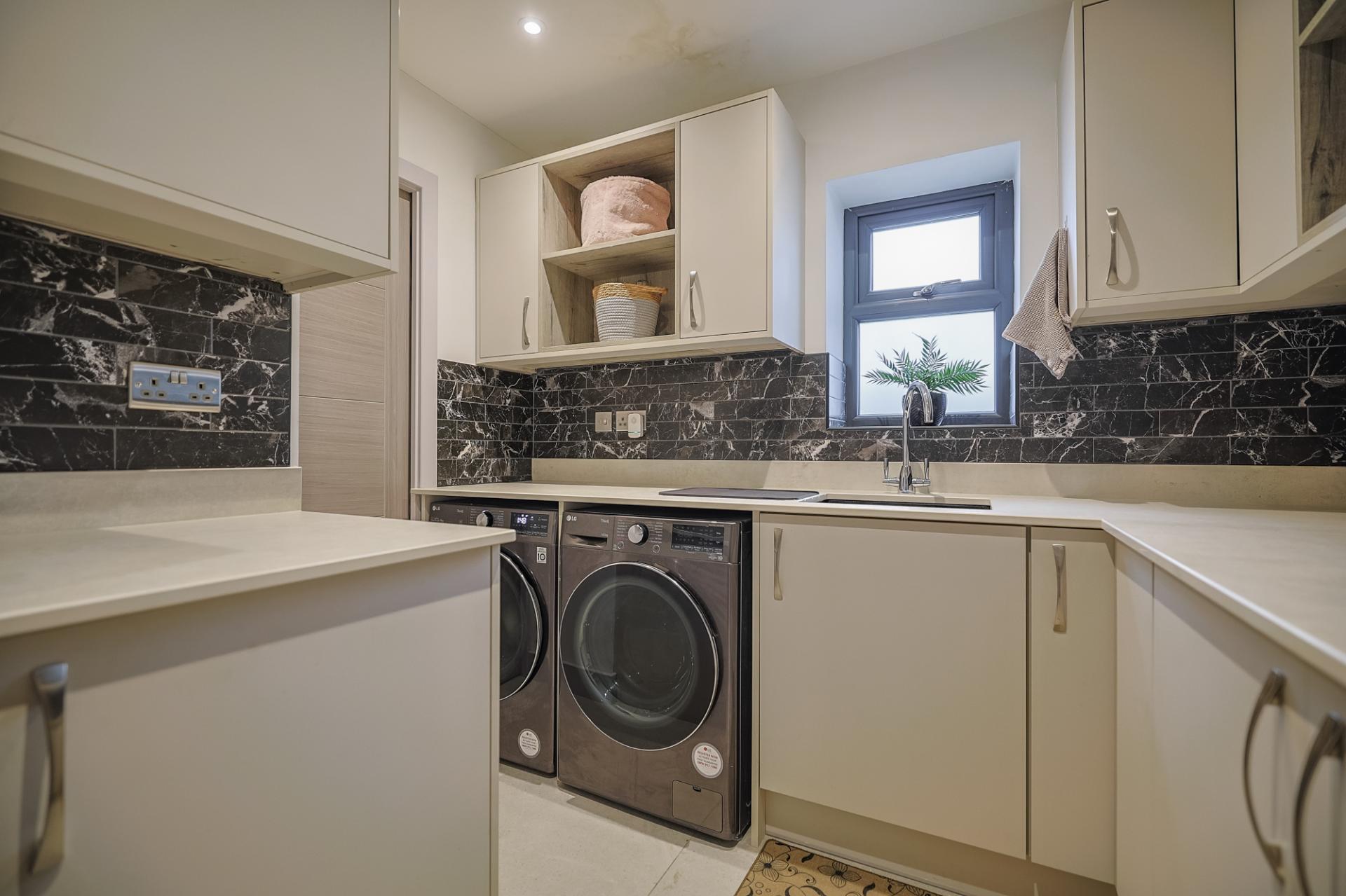 Situated just off the kitchen, this useful utility offers additional wall and base units, a Caple sunken basin with swan tap, integrated fridge/freezer, tiled flooring, spotlighting, a frosted side window, and space for two under-counter appliances. A discreet pocket door leads to a plant room housing the home’s core equipment.