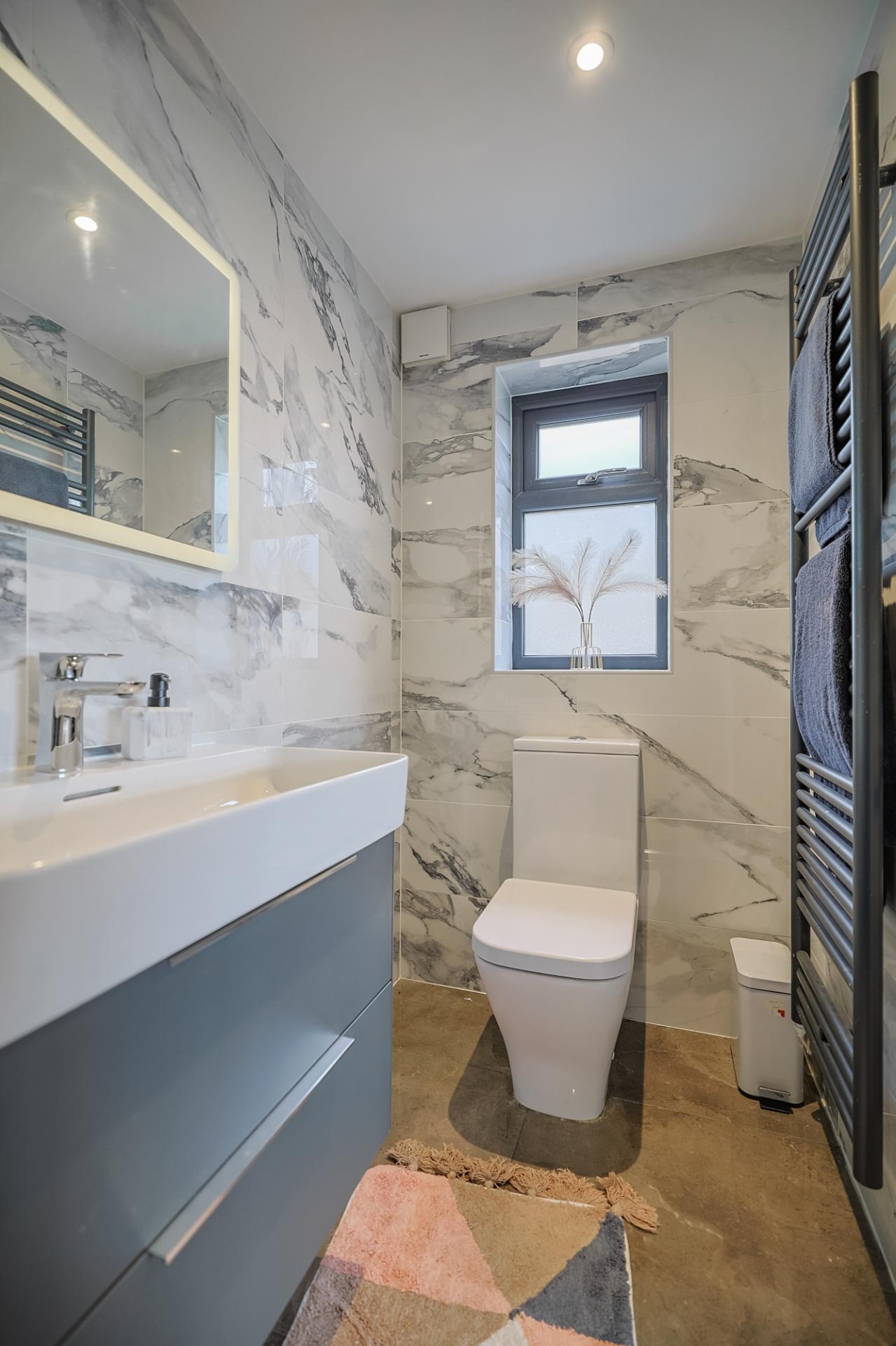 This stylish and practical ground-floor cloakroom includes a WC, Roca wash basin with under-storage, touch-sensor mirror, extractor fan, heated towel rail, spotlighting, tiled walls and flooring, and a frosted side window.