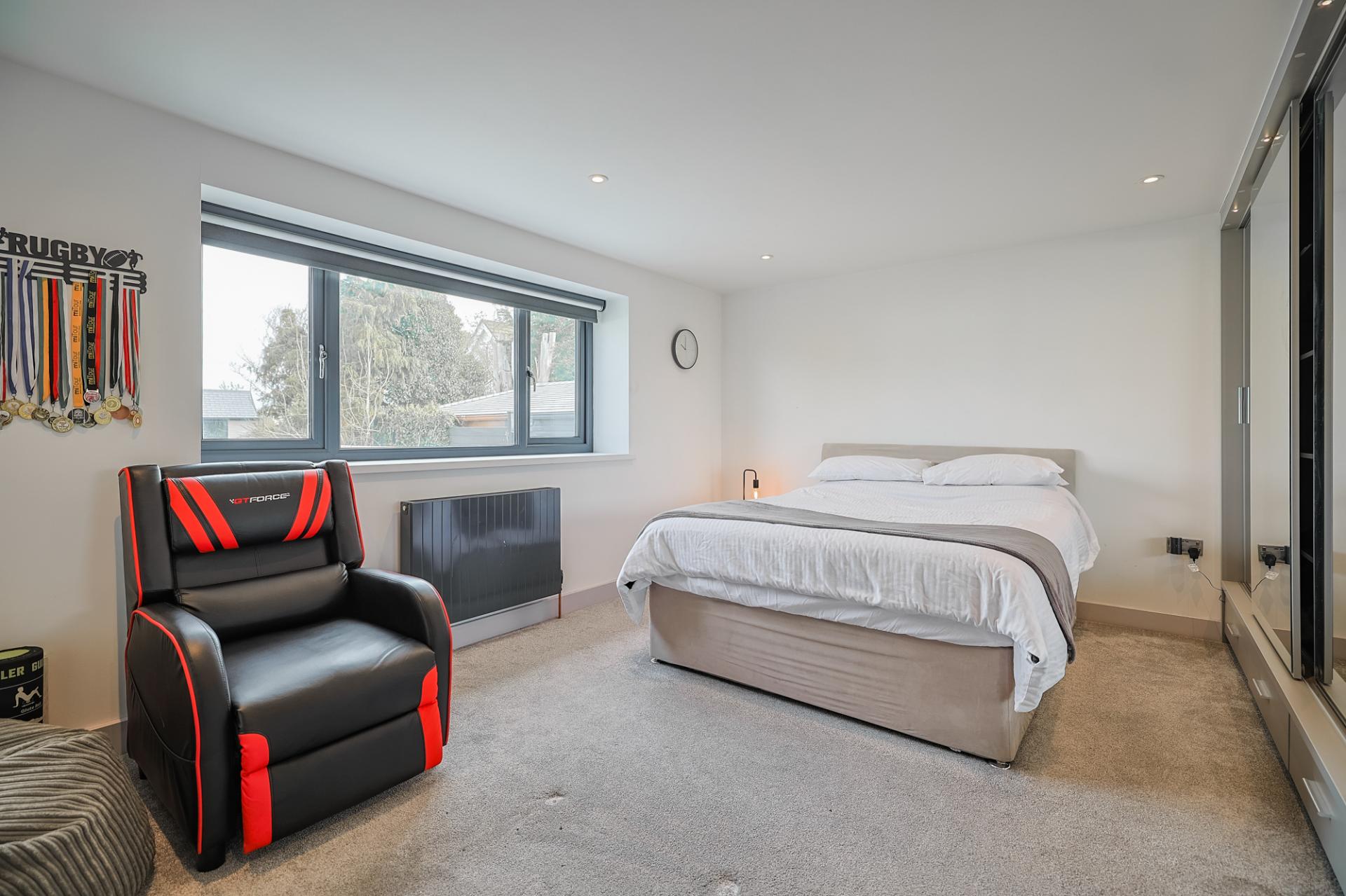 Situated to the rear of the home, this bright and peaceful bedroom features a large window overlooking the garden, fitted wardrobes with hanging rails and shelving, spotlighting, and carpeting.