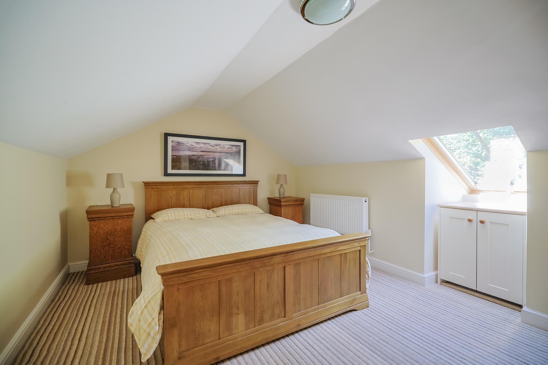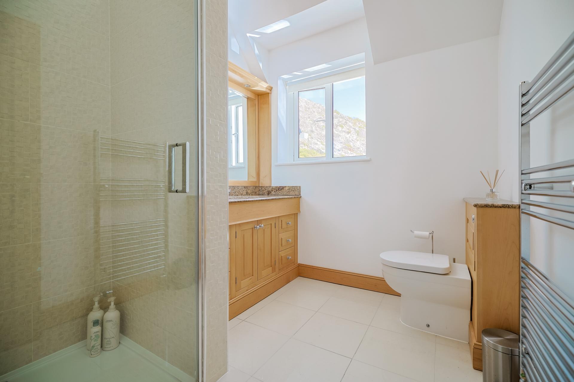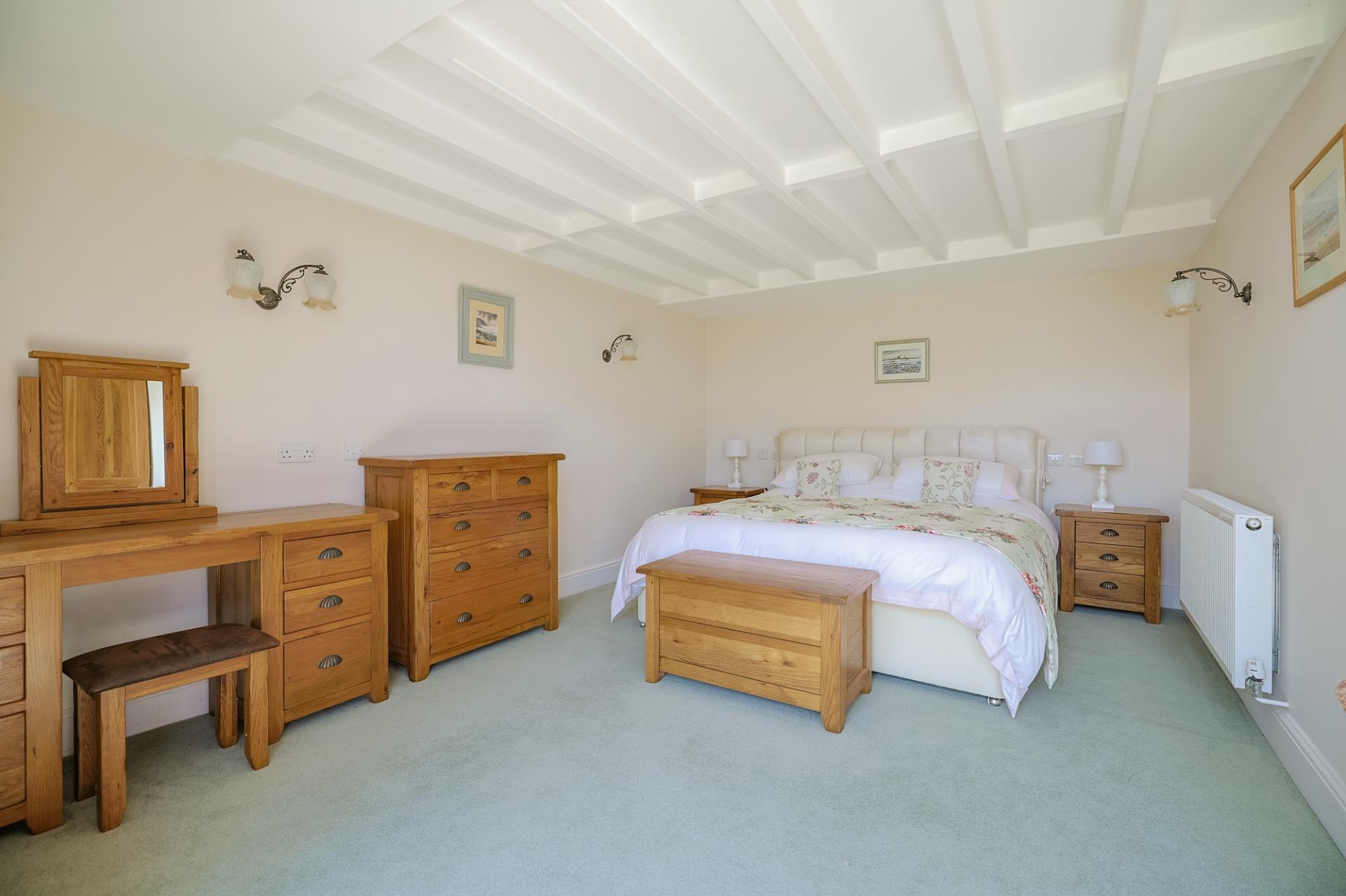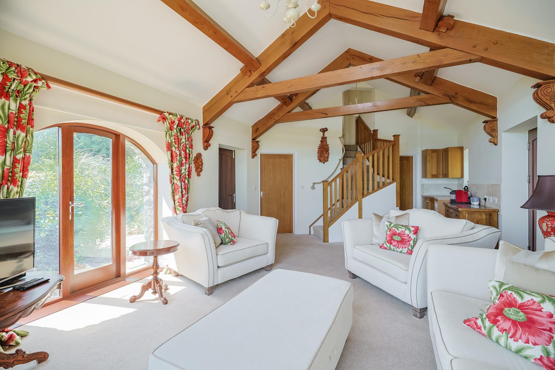 This stunning self-contained two-bedroom annex offers a fabulous open-plan lounge and kitchenette area. You are immediately drawn to the vaulted ceiling with exposed beams and the feature rear window, along with double patio doors framing the sea and garden views. Additional doors and feature windows enhance the space further. The lounge area boasts beautiful wood detailing and carpeted flooring. The kitchenette is equipped with a stainless steel sunken sink, base storage, and a wall unit. A ground floor bedroom is filled with natural light through an arched front-facing window with patio door. This spacious double bedroom has carpeted flooring, spotlights, and wall lighting. The stylish shower room includes a walk-in shower, WC, wash basin, extractor fan, heated towel rail, and two shaving points. Ascend the carpeted stairway to the upper floor where you’ll find a further double bedroom with carpeted floor, a Velux window and eaves storage.