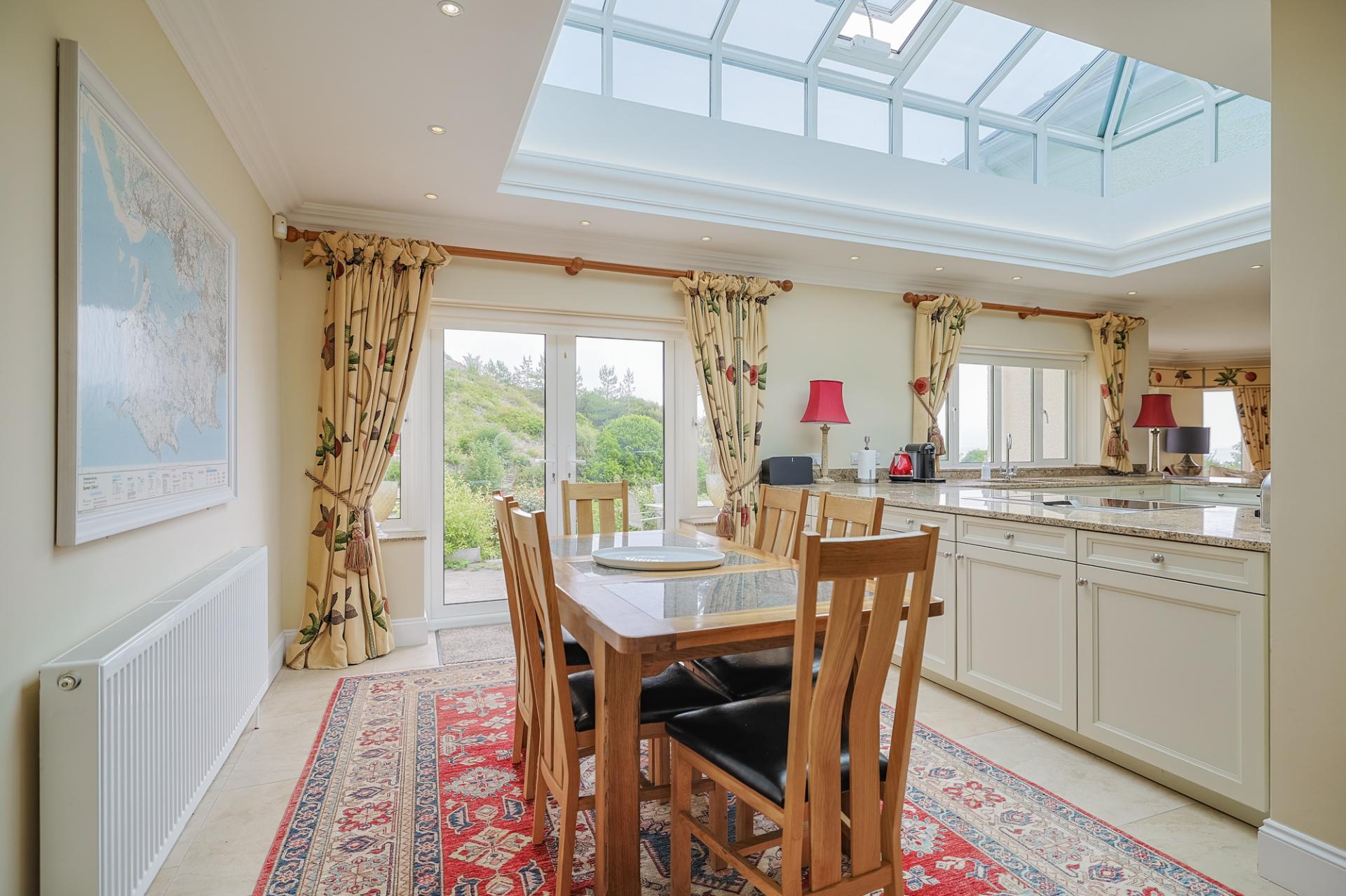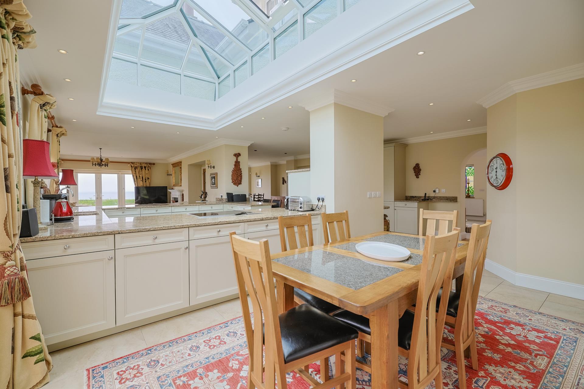 This spectacular open-plan space is a true heart of the home. An array of thoughtfully placed windows floods the area with natural light and showcases uninterrupted sea views. A stunning orangery-style window and four sets of double patio doors provide seamless indoor-outdoor living. The space is finished with a combination of tiled and carpeted flooring and enhanced by recessed spotlighting. The kitchen features a range of quality tall and base units with granite worktops and high-end integrated appliances, including two NEFF oven/grills, two NEFF warming drawers, a NEFF microwave, a 4-ring NEFF electric hob, Elica elevating extractor fan, a double Franke sunken sink with swan tap, NEFF dishwasher, a breakfast bar, and two tall fridge/freezers. There’s space for both a breakfast table and dining table, creating an ideal entertaining space. The family seating area is open to the kitchen and features an open fireplace with slate surround and hearth, carpeted flooring, and of course, outstanding views.