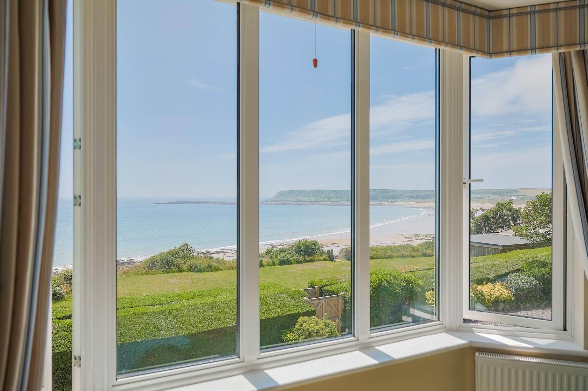Ascend the oak-carpeted stairway to a bright and airy first-floor landing. Lit by recessed spotlighting and a large front-facing window that frames sea views, this carpeted space is enhanced with detailed coving and decorative detailing above each door. From here, you can access all four bedrooms and the family bathroom.