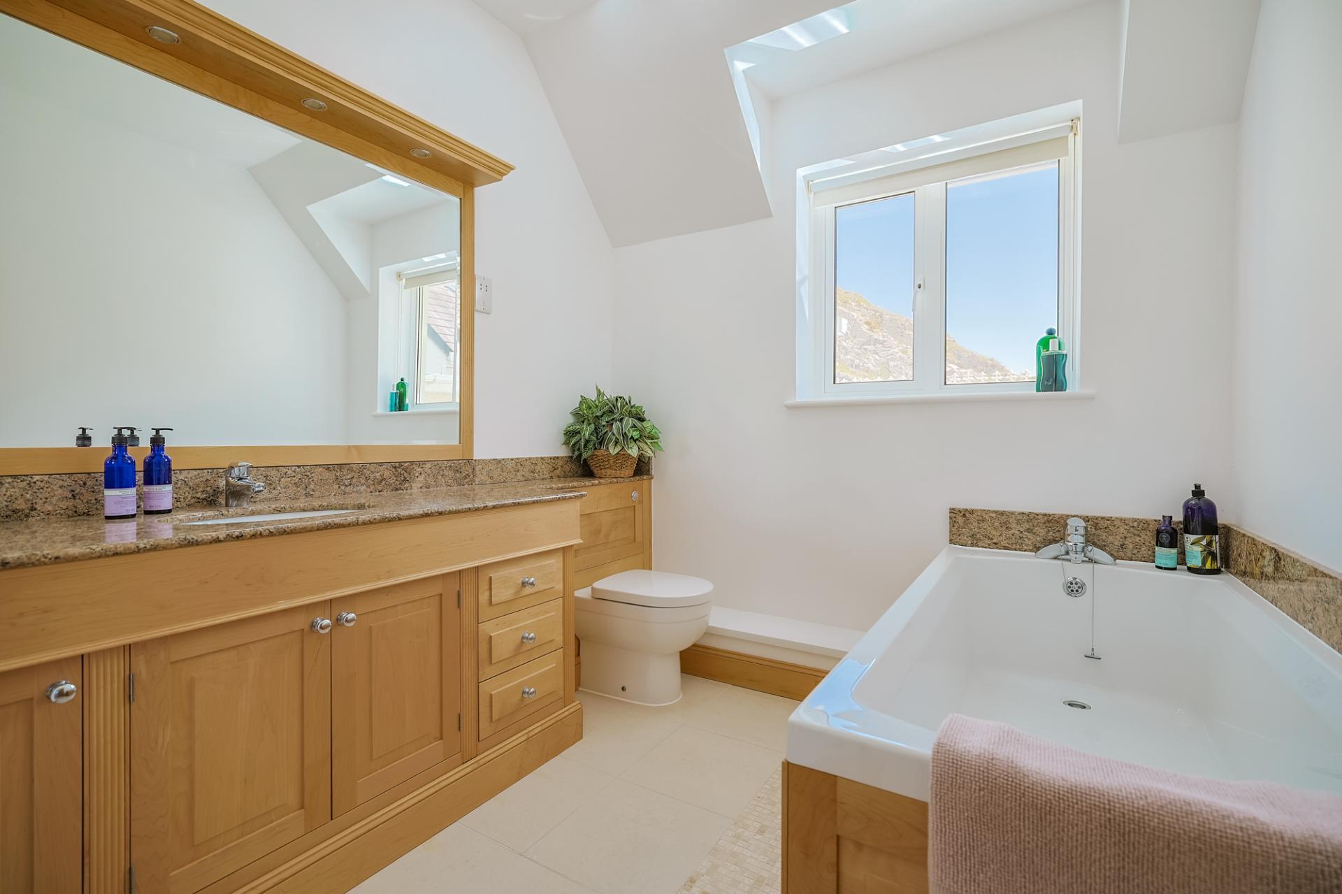 Located at the front of the home, bedroom two offers an exceptional view through a large picture window that overlooks the garden and sea. This beautifully bright double room features carpeted flooring, detailed coving, and bespoke, hand-made, fitted wardrobes, drawers, and a dressing table. There's also space for a seating area to enjoy the view. The ensuite is luxuriously appointed with a WC, wash basin with granite-topped bespoke hand-made units, a walk-in shower, heated towel rail, spotlights, extractor fan, and a Velux window.