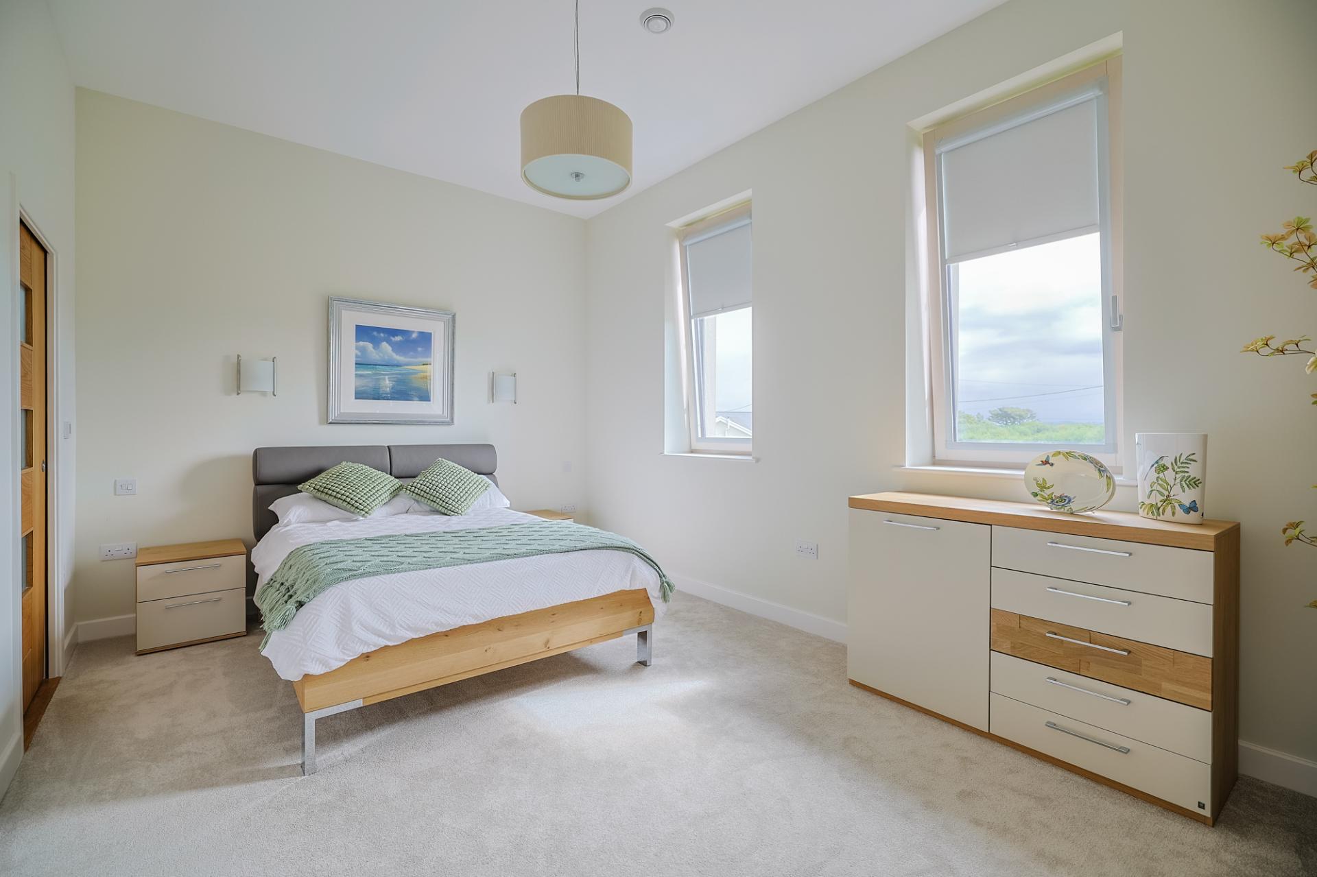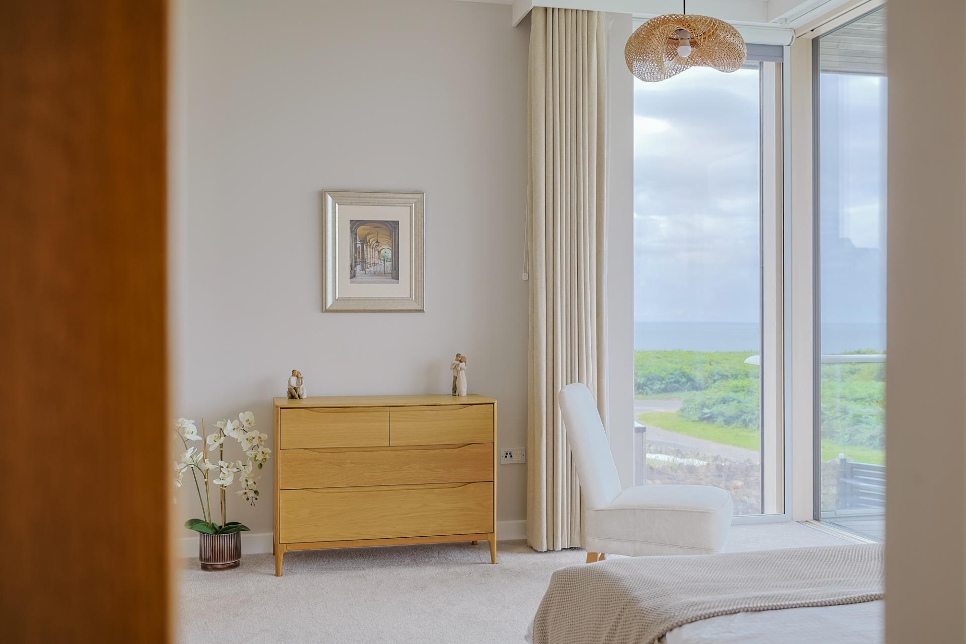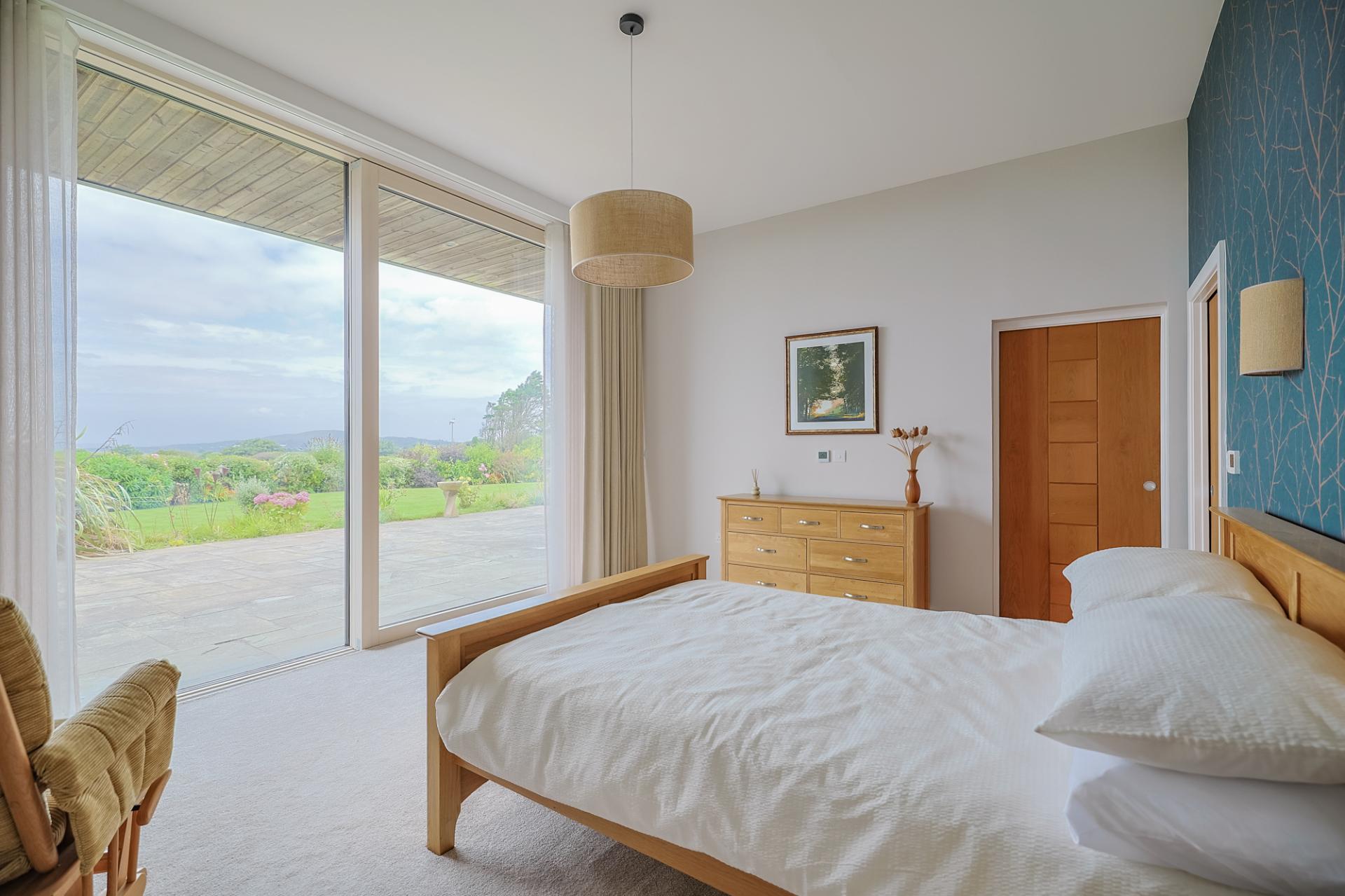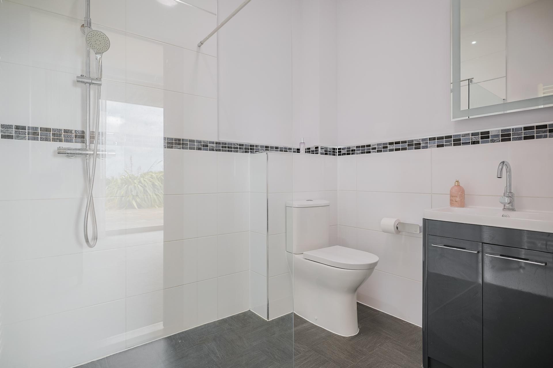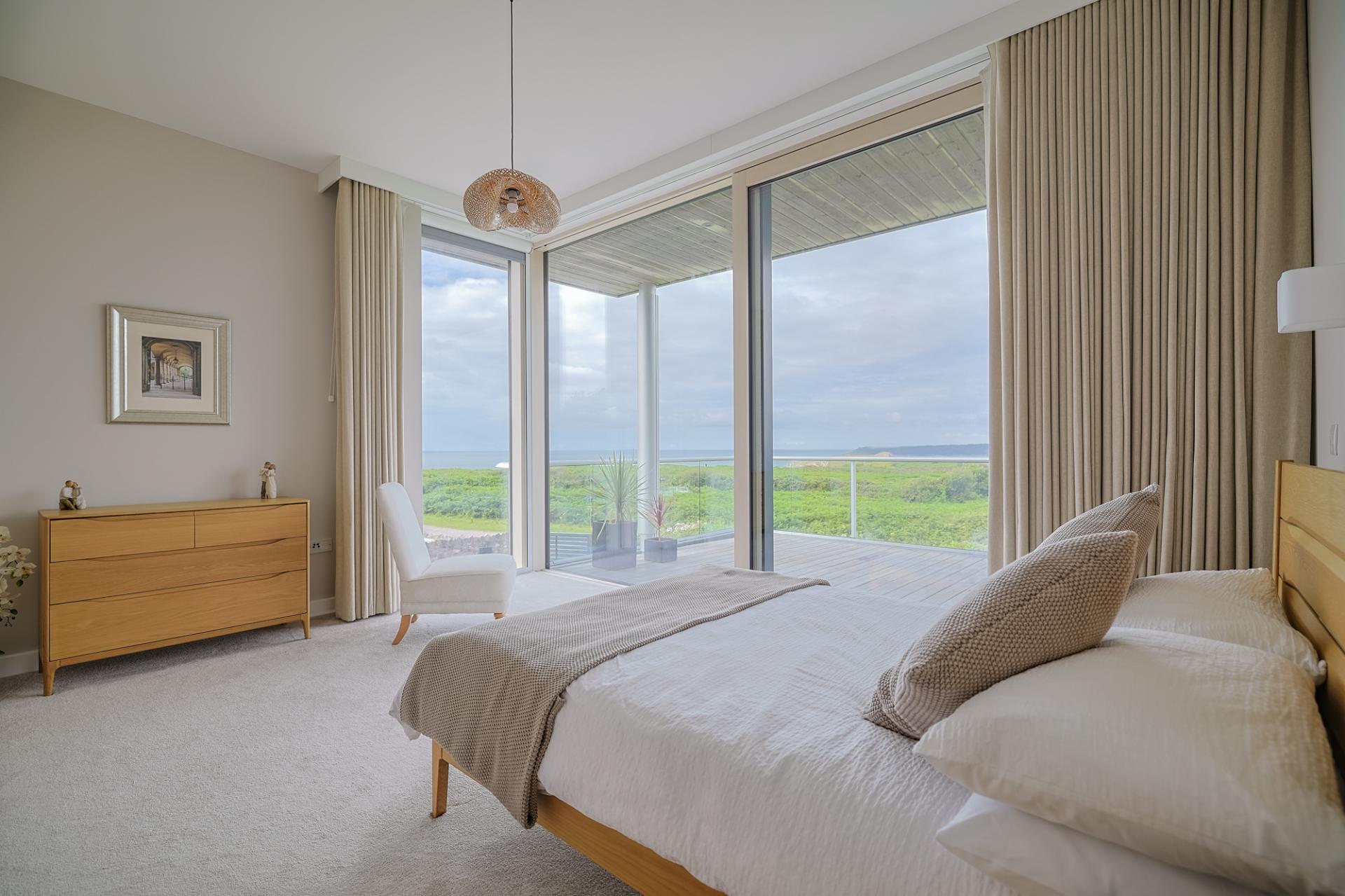 Bedroom four is located at the front of the property and designed with accessibility in mind. This bright, spacious room offers uninterrupted garden and sea views via floor-to-ceiling glazing and sliding doors. Concealed pocket doors lead to a fitted wardrobe and a private en-suite, equipped with a walk-in shower, WC, vanity basin, heated towel rail, illuminated mirror with shaving point, partial tiled walls, and luxury vinyl flooring.