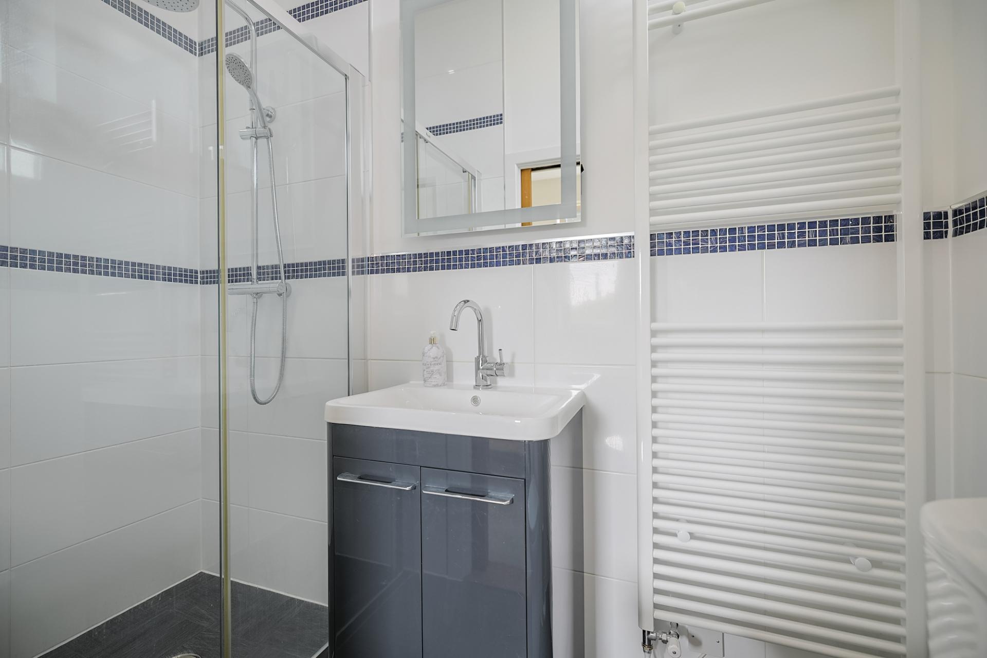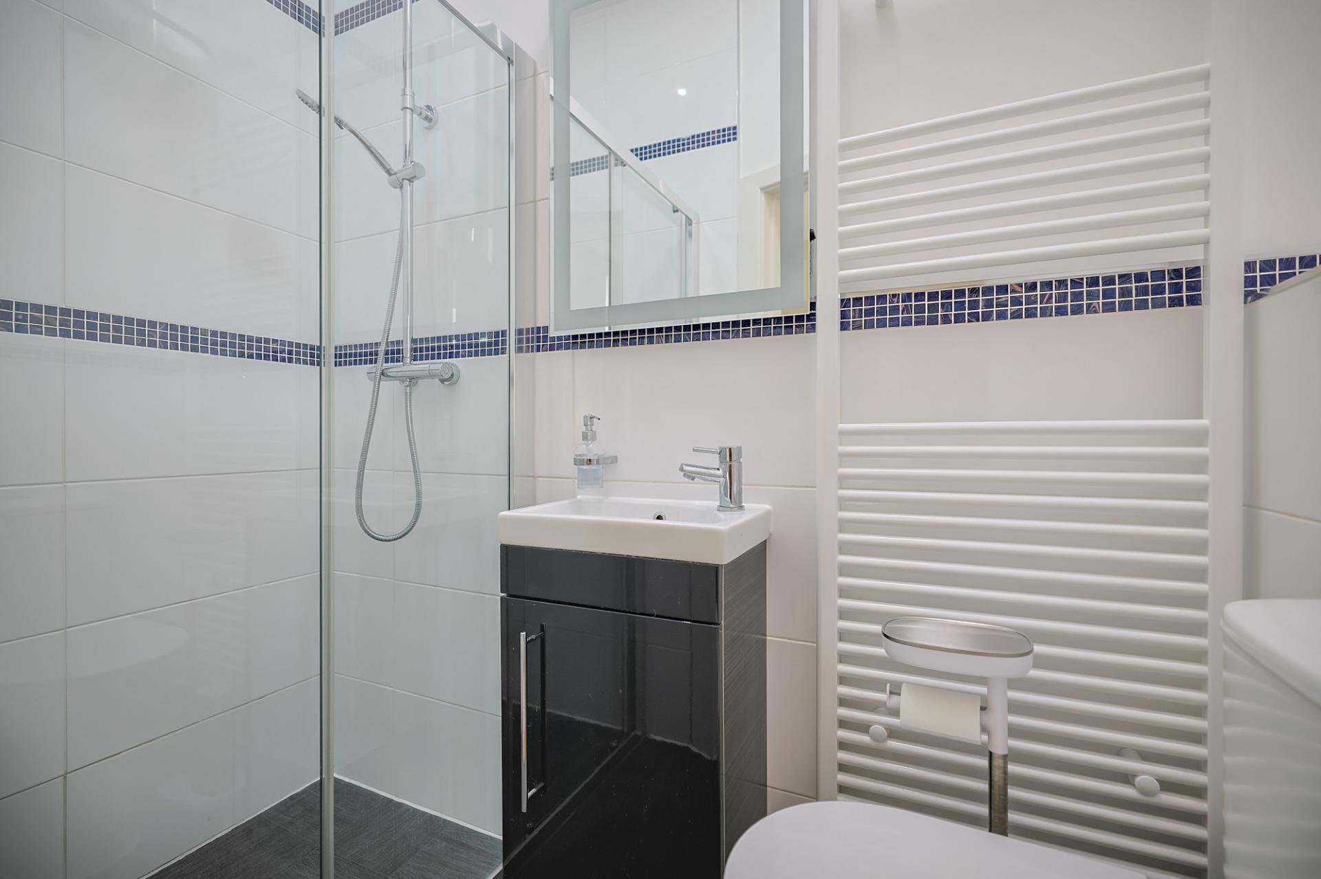 Situated at the rear of the property, bedroom five is a generously proportioned double room with two windows overlooking the garden. Carpeted throughout, it features built-in wardrobes and concealed pocket doors. The private en-suite includes a walk-in shower, WC, vanity basin, heated towel rail, illuminated mirror with shaving point, spotlights, partial tiled walls, and luxury vinyl flooring.