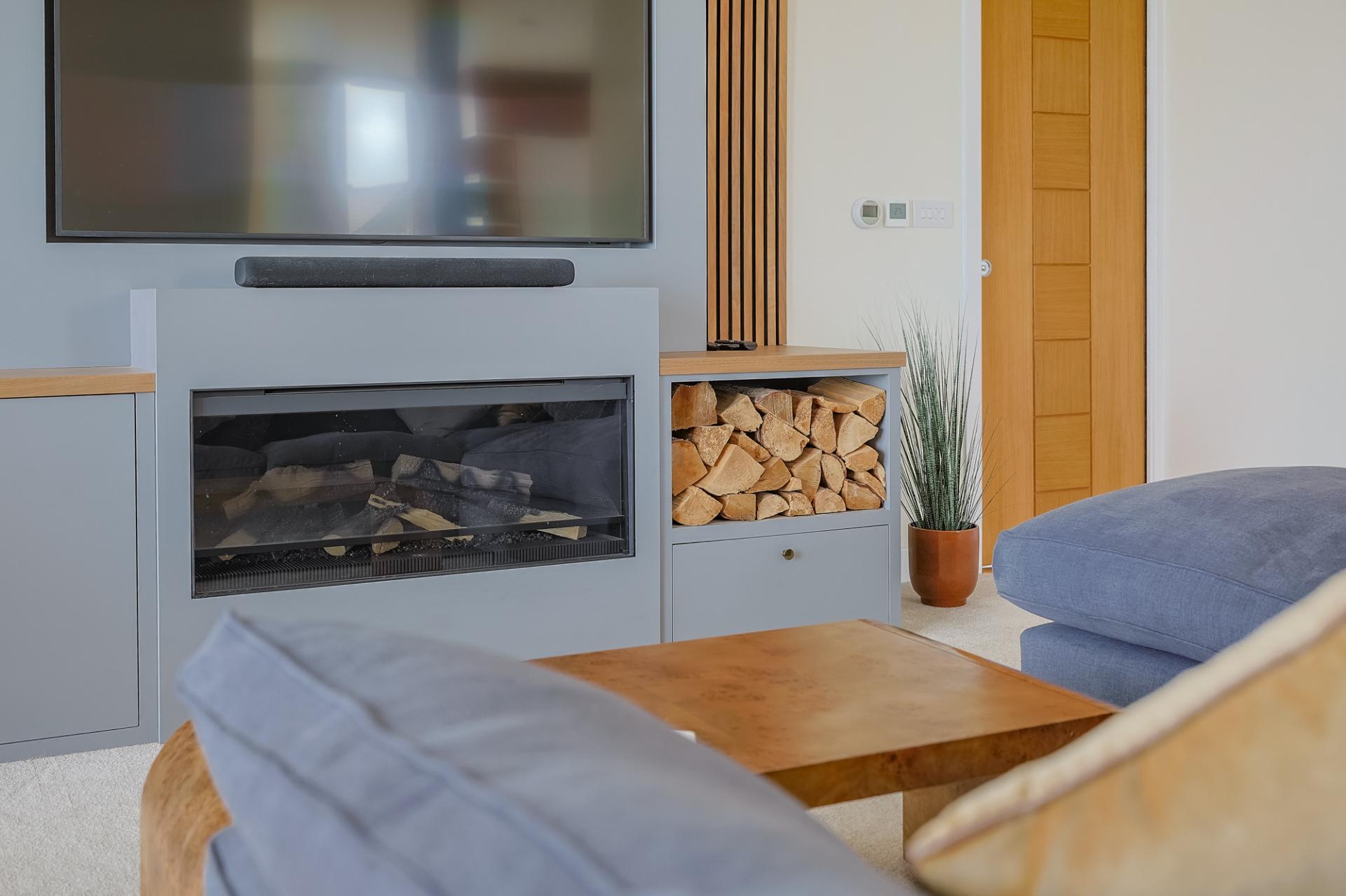 Ascending the floating ash staircase with glass balustrade and feature lighting brings you to the open-plan first-floor lounge. This grand space enjoys floor-to-ceiling glazing and sliding doors that open directly onto the spectacular full-width balcony, where panoramic views of Oxwich Bay and the surrounding coastline await. The room is carpeted, with a fitted media wall, feature fire, integrated sound system and spotlights, perfect for unwinding.