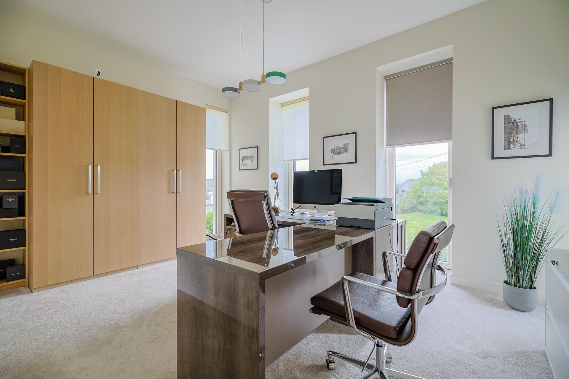 Currently used as a study, bedroom six is a flexible room that could easily serve as an additional double bedroom. It features dual aspect windows, fitted wardrobes and carpeted flooring, providing a peaceful and functional space for work or relaxation.