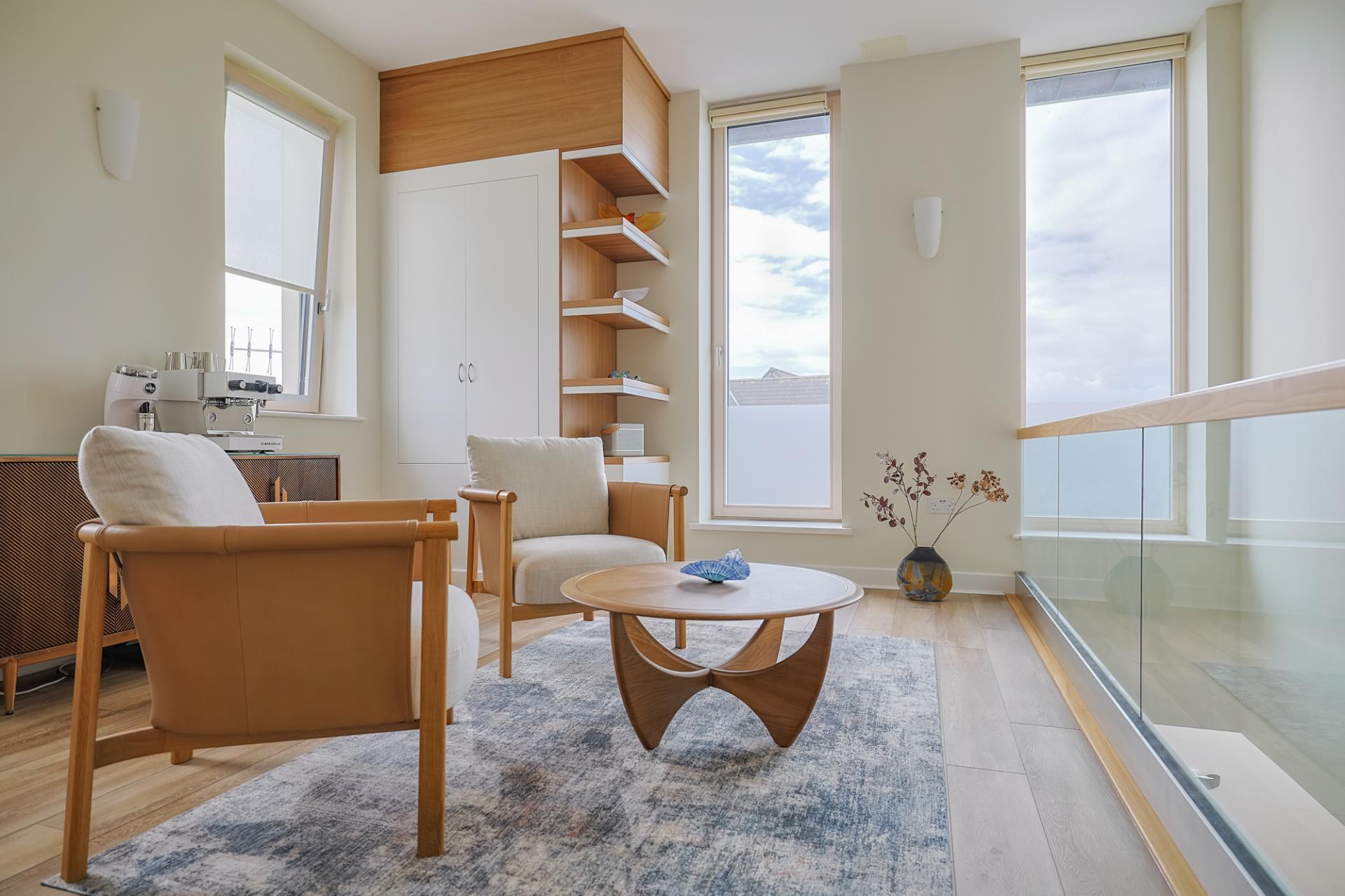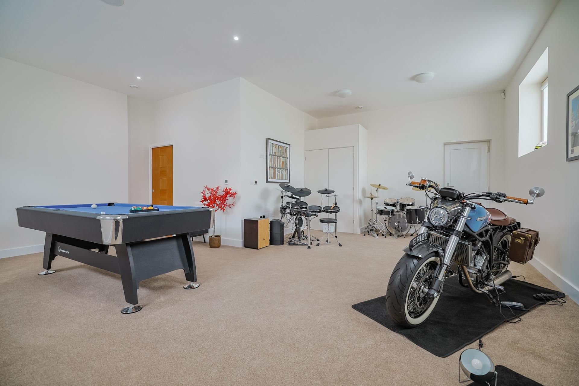 The open gallery landing benefits from dual-aspect floor-to-ceiling windows and oak flooring. One of the windows also functions as a door, giving access to the roof of the games room where the solar panels, thermal tubes and aerials are located. A storage cupboard and fitted shelving provide further functionality, while stylish uplighting adds ambience.