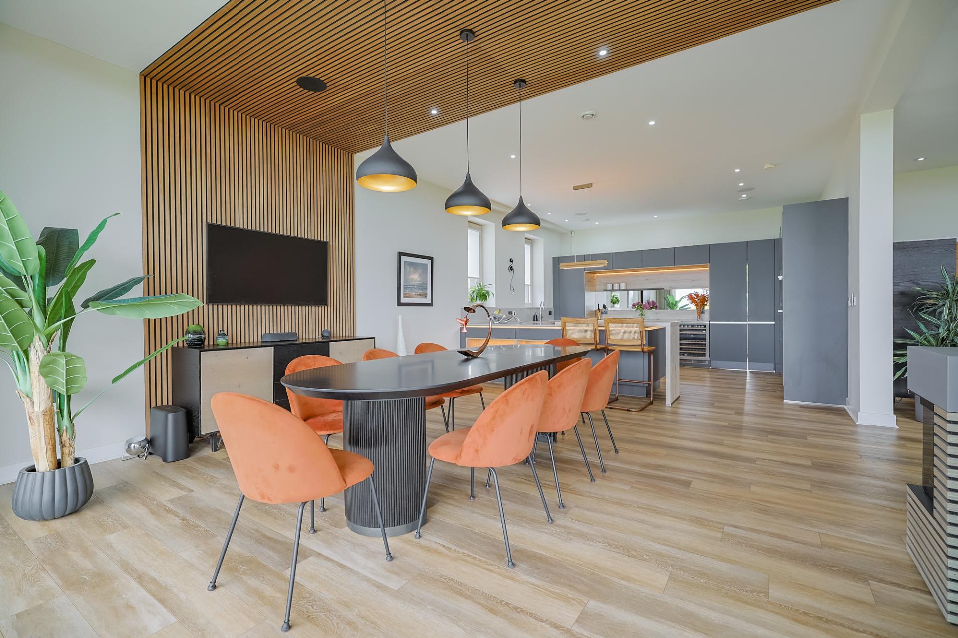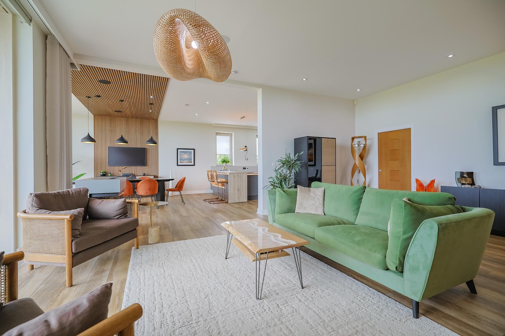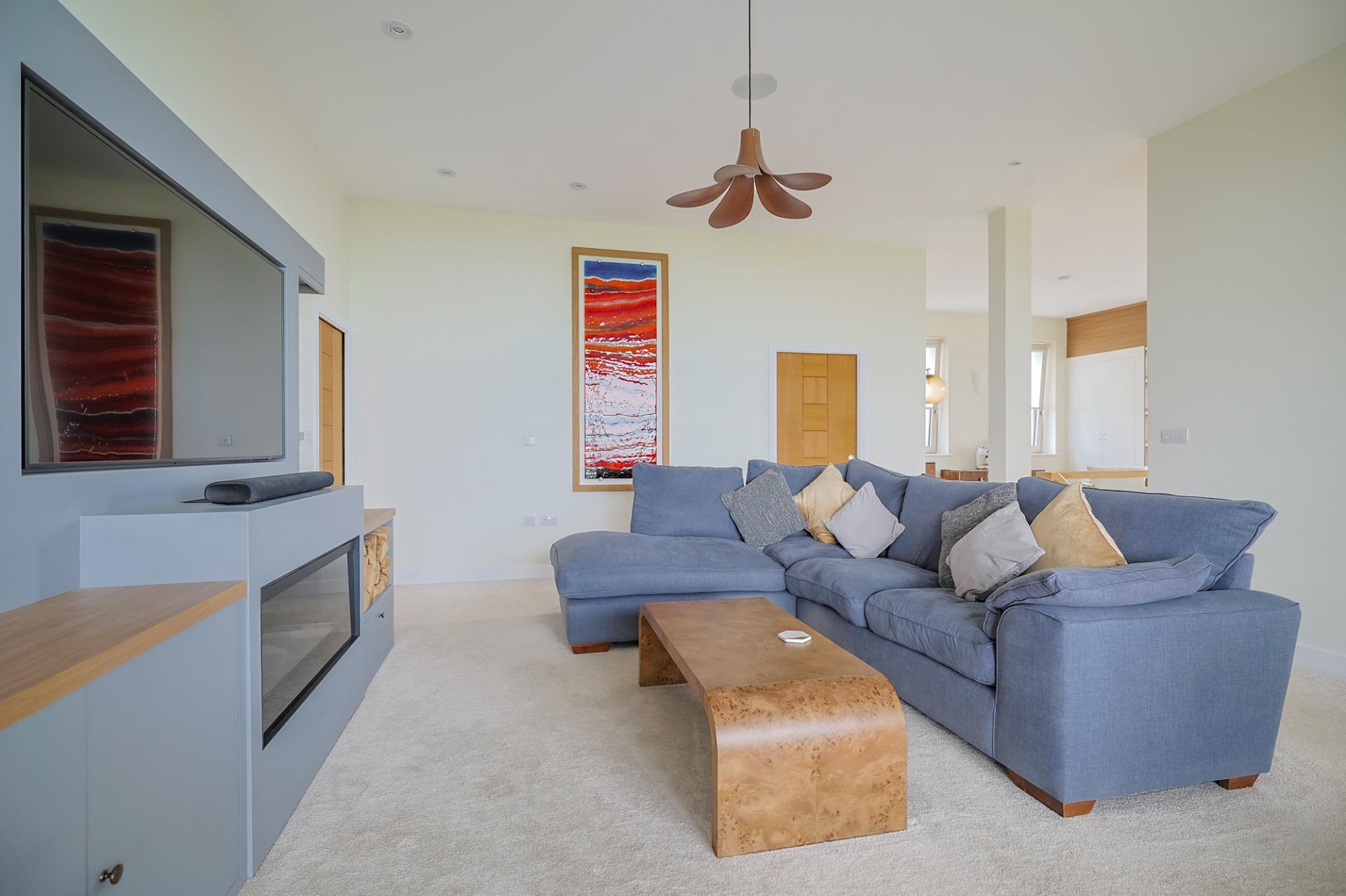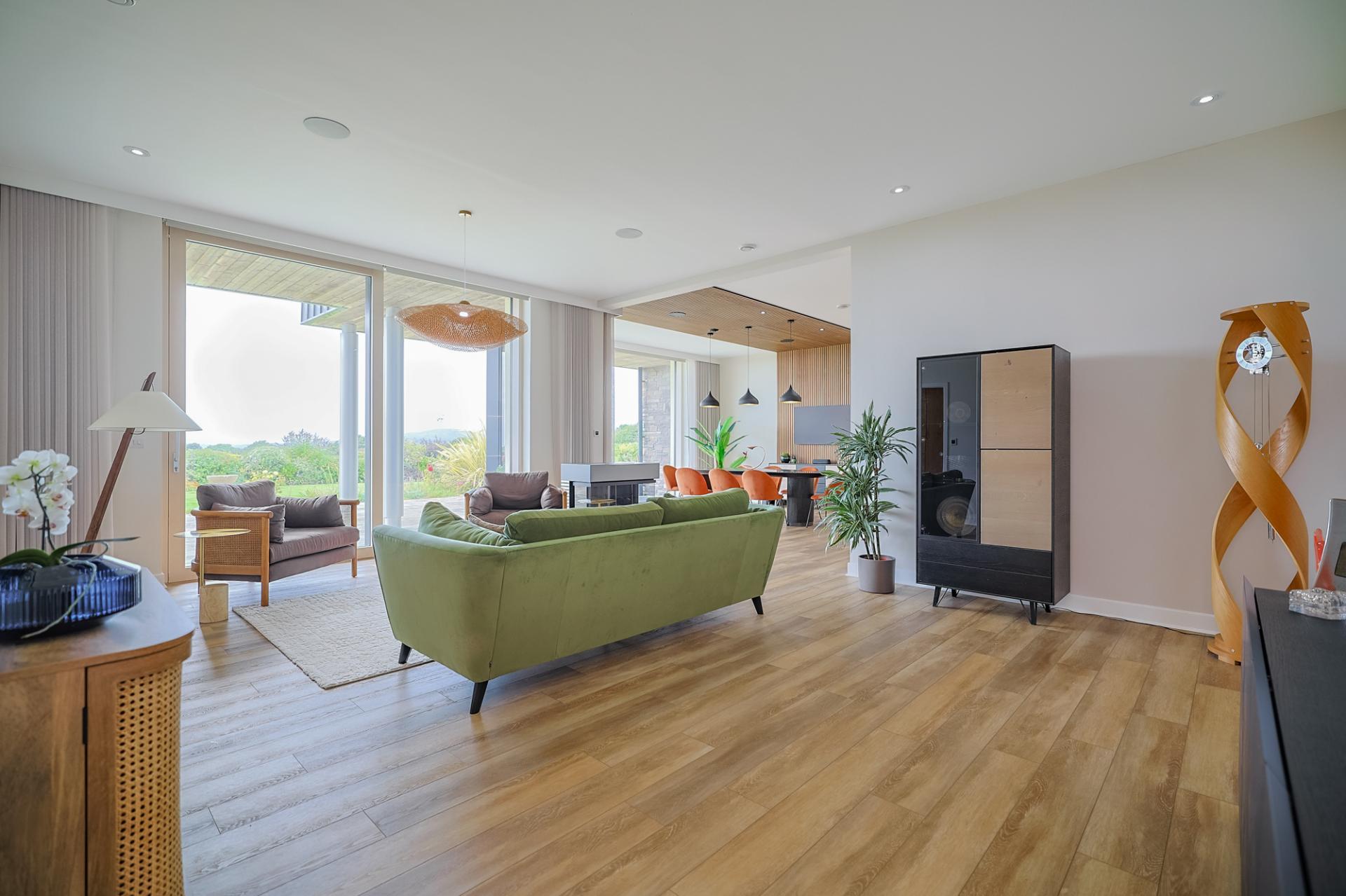 The expansive open-plan family area forms the heart of the home. Flooded with natural light from full-width floor-to-ceiling glazing and sliding doors, this stunning space opens out onto a sheltered patio, offering awe-inspiring views of the sea and surrounding landscape. Oak flooring, feature lighting, integrated sound system and generous proportions create an inviting and luxurious atmosphere. From here, you have direct access to the kitchen/dining area, cinema room, and bedroom four.