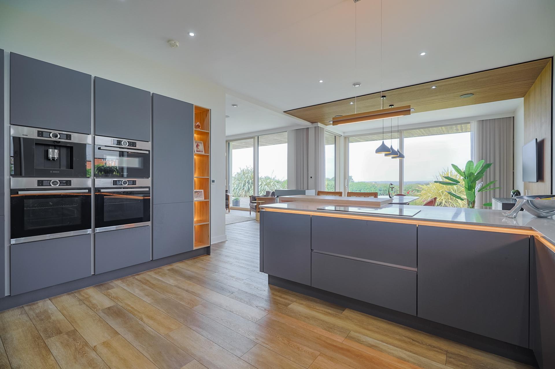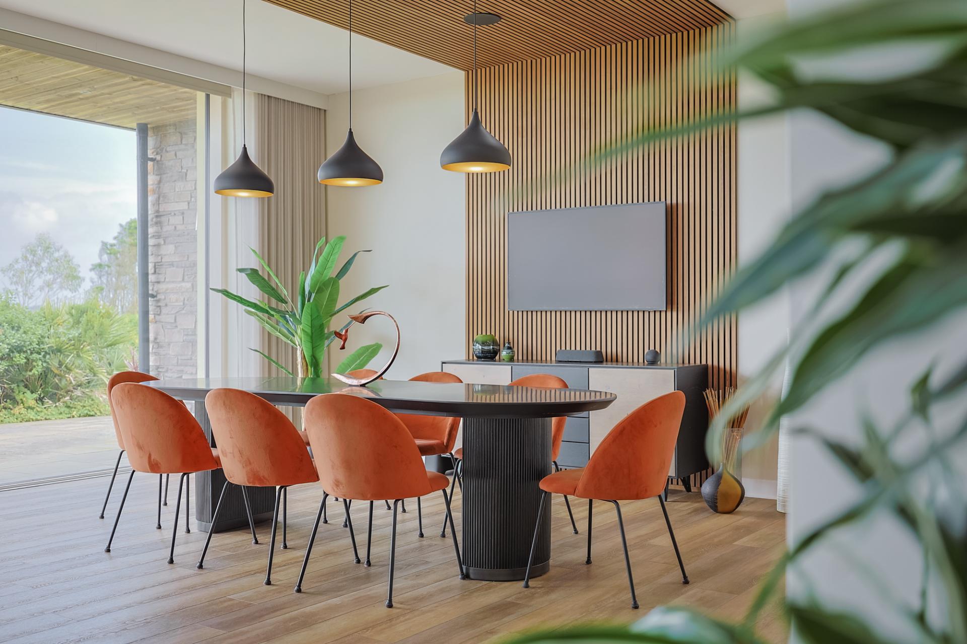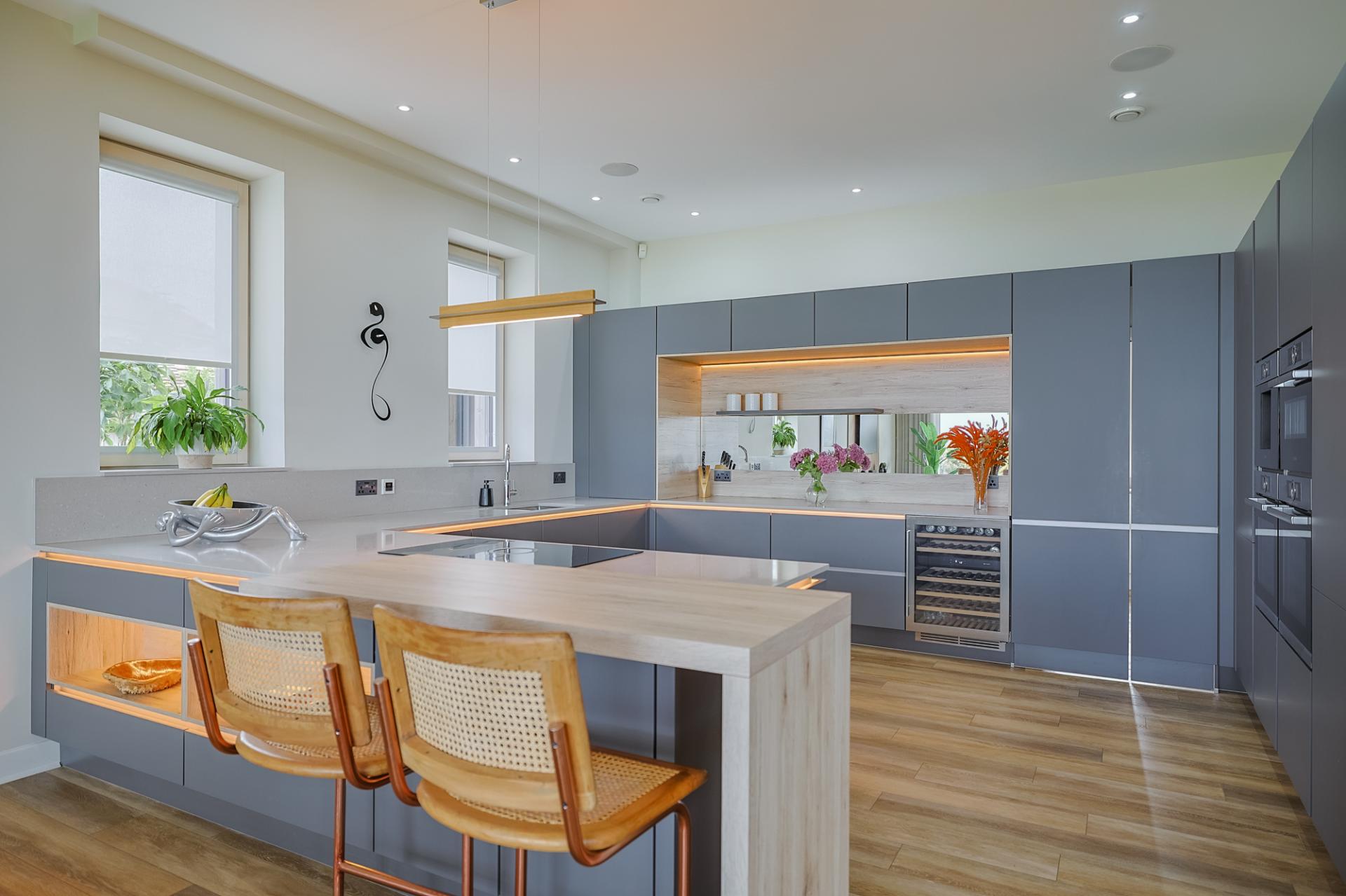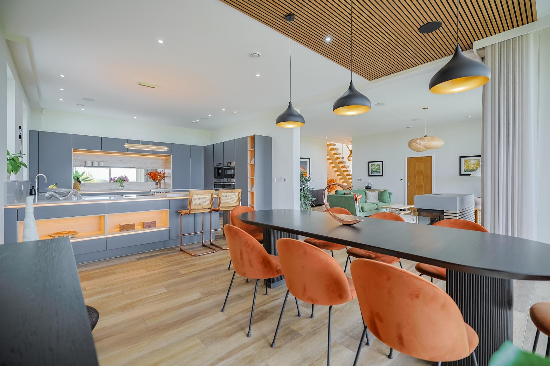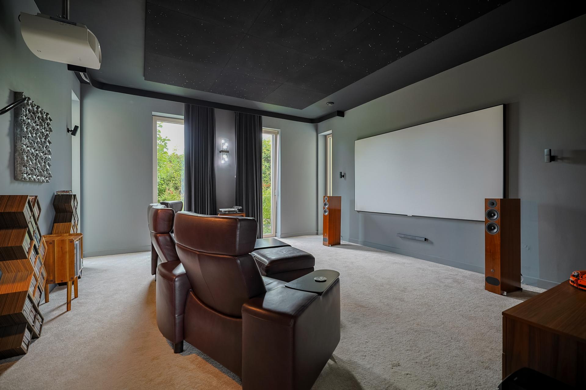 The expansive open-plan family area forms the heart of the home. Flooded with natural light from full-width floor-to-ceiling glazing and sliding doors, this stunning space opens out onto a sheltered patio, offering awe-inspiring views of the sea and surrounding landscape. Oak flooring, feature lighting, integrated sound system and generous proportions create an inviting and luxurious atmosphere. From here, you have direct access to the kitchen/dining area, cinema room, and bedroom four.