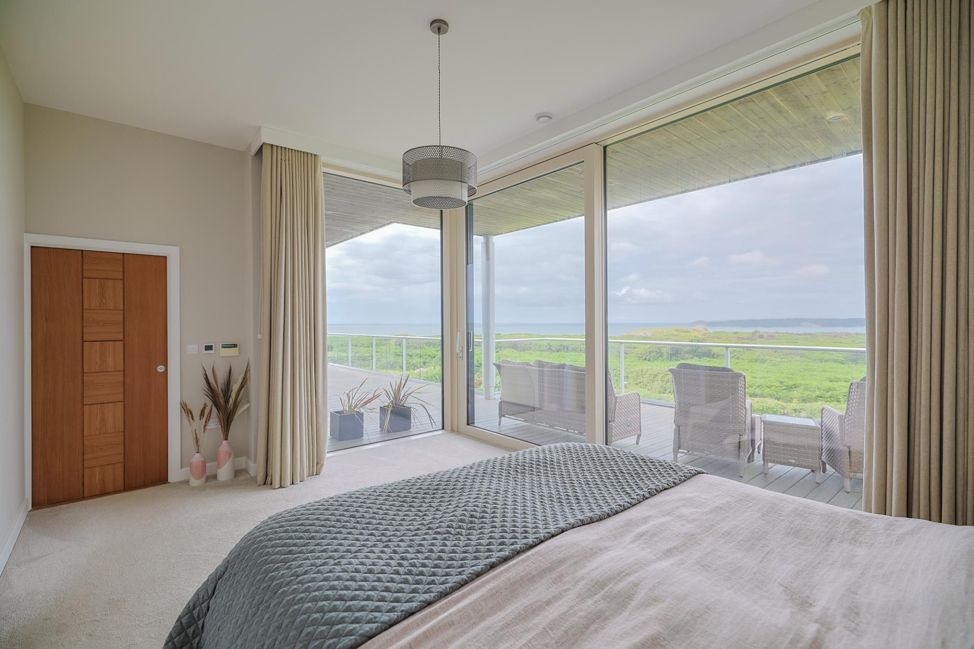 A luxurious retreat, the principal suite is filled with natural light from its L-shaped, floor-to-ceiling glazing and sliding door, which opens directly onto the balcony. Views from here are nothing short of spectacular, stretching across Cefn Bryn, Oxwich Bay, and the Devon coastline. Concealed pocket doors lead to a dressing room with fitted storage and dressing table, and to a beautifully appointed en-suite with twin Roca basins, walk-in double shower, WC, heated towel rail, two mirrors with touch lighting, partial tiled walls, oak flooring, and a side window.