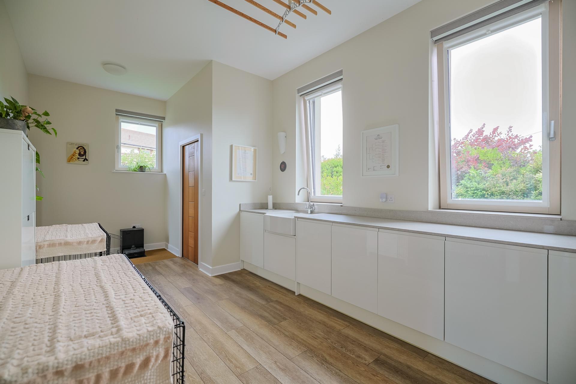 Behind the kitchen lies a generous utility room, fitted with extra cabinetry and worktop space, a large porcelain sink with swan-neck tap, and oak flooring. Windows overlook the rear and side of the property, with access to the outside and a further WC, which includes a WC, wash basin, mirror with lighting and luxury vinyl flooring.