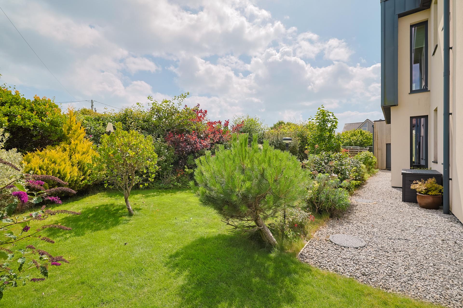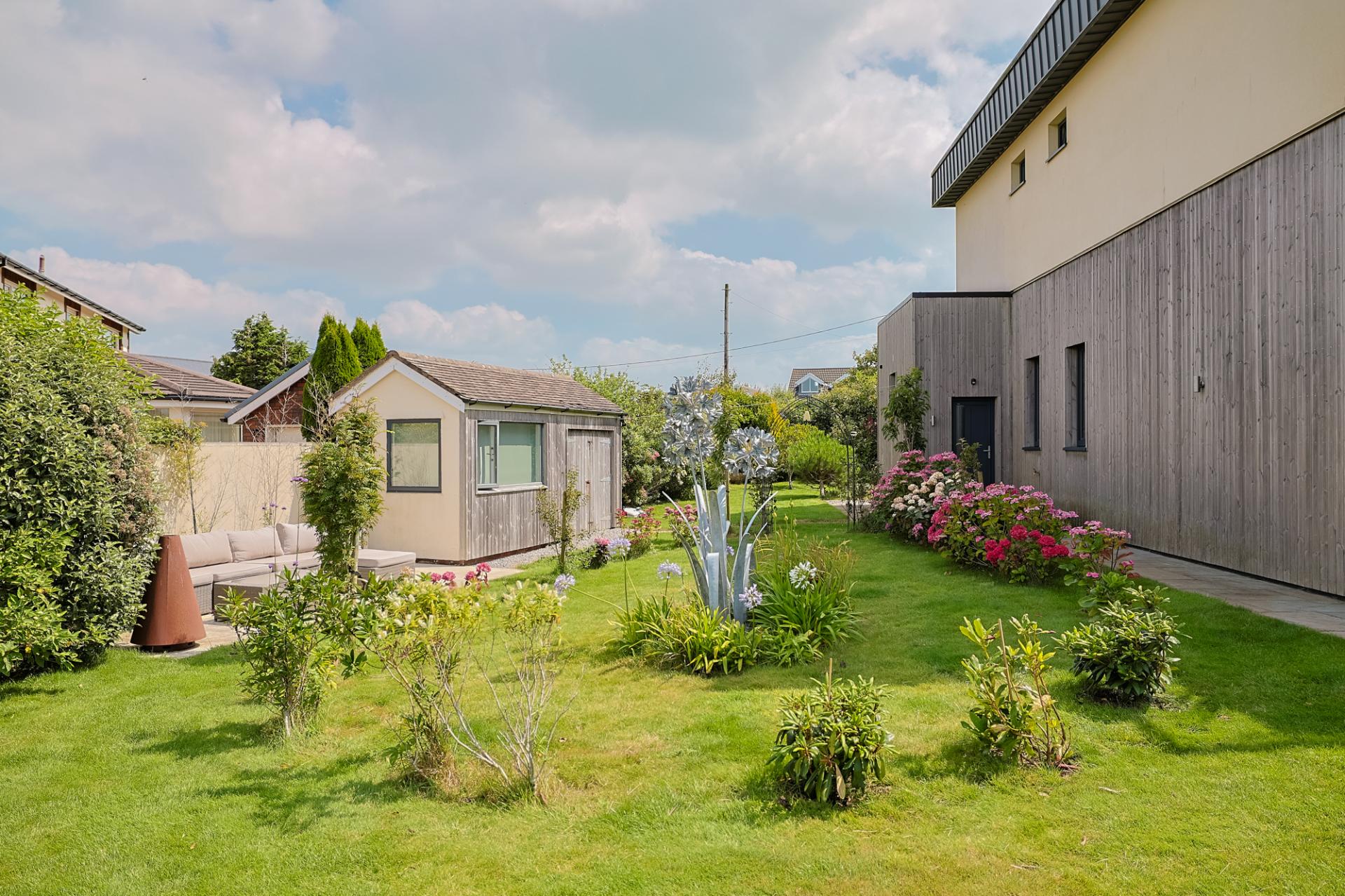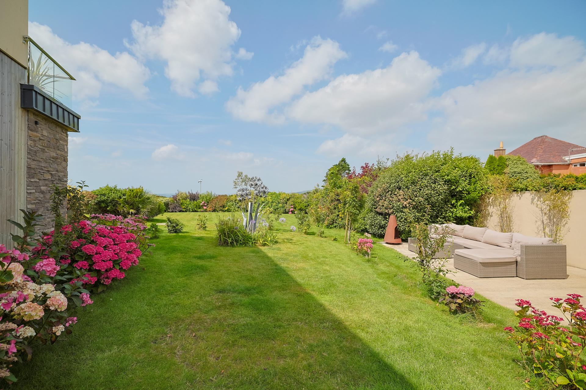 Outside, the landscaped gardens provide a serene and picturesque backdrop to the home. A level lawn is bordered by vibrant planting and carefully raised flower beds, while a natural stone patio wraps elegantly around the front, offering multiple vantage points to sit and take in the sweeping views. A charming limestone-chip path guides you through the garden, past beds in full bloom, a large potting shed and a separate patio area. A striking Agapanthus sculpture stands within the garden, encircled by flourishing Agapanthus blooms, which creates a captivating focal point and a perfect setting for memorable family photos. This garden is a true sanctuary—whether for keen gardeners or anyone in search of peace, privacy, and beauty.
