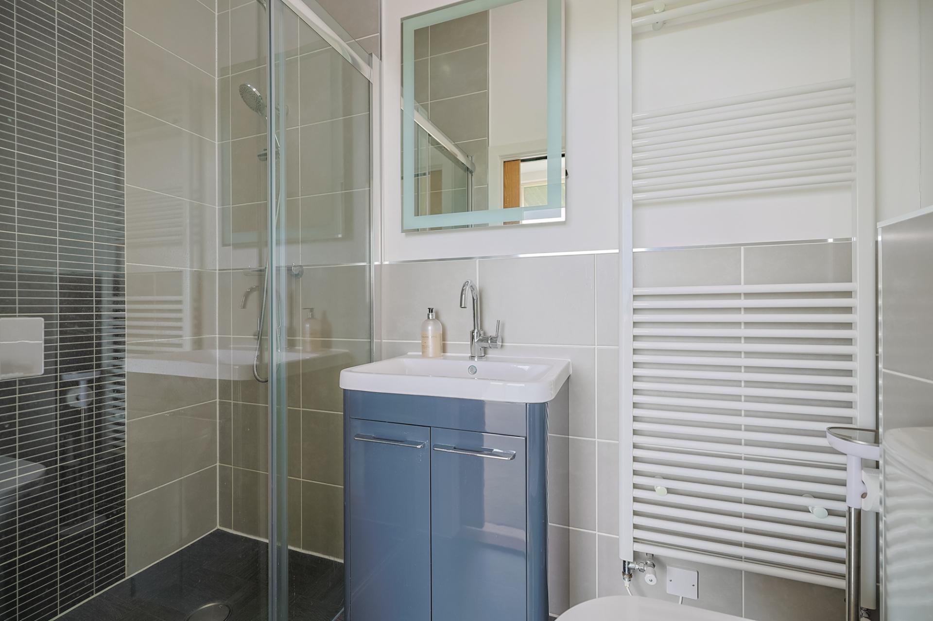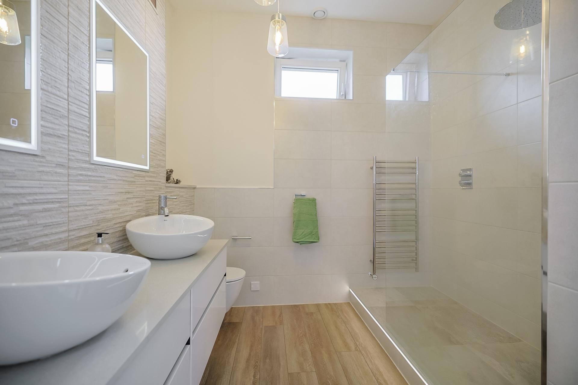 To the rear, bedroom three enjoys distant views of the Brecon Beacons through its two large windows. Carpeted and with concealed pocket doors, this double room also benefits from a private en-suite with walk-in shower, WC, vanity basin, heated towel rail, illuminated mirror and luxury vinyl flooring.