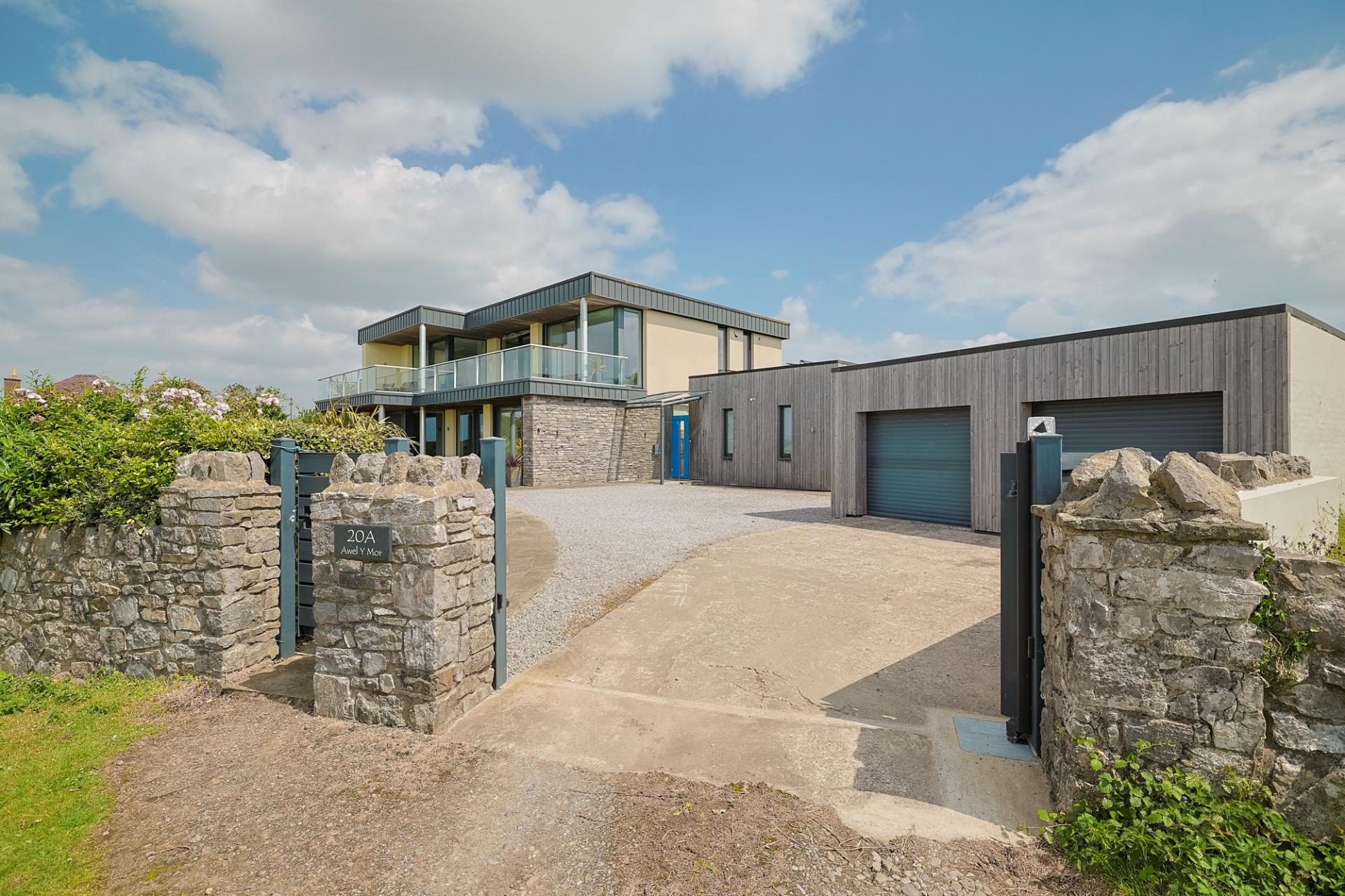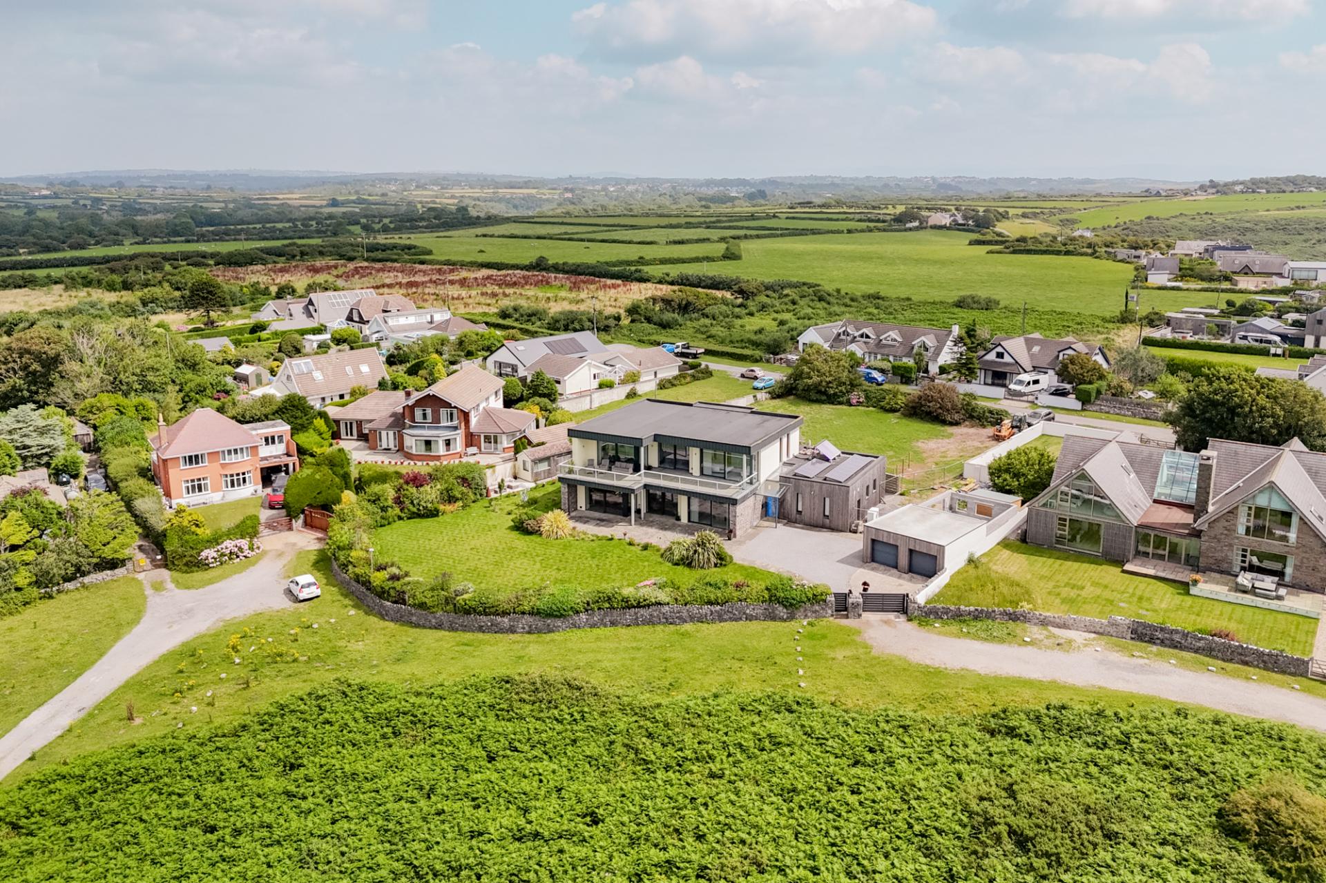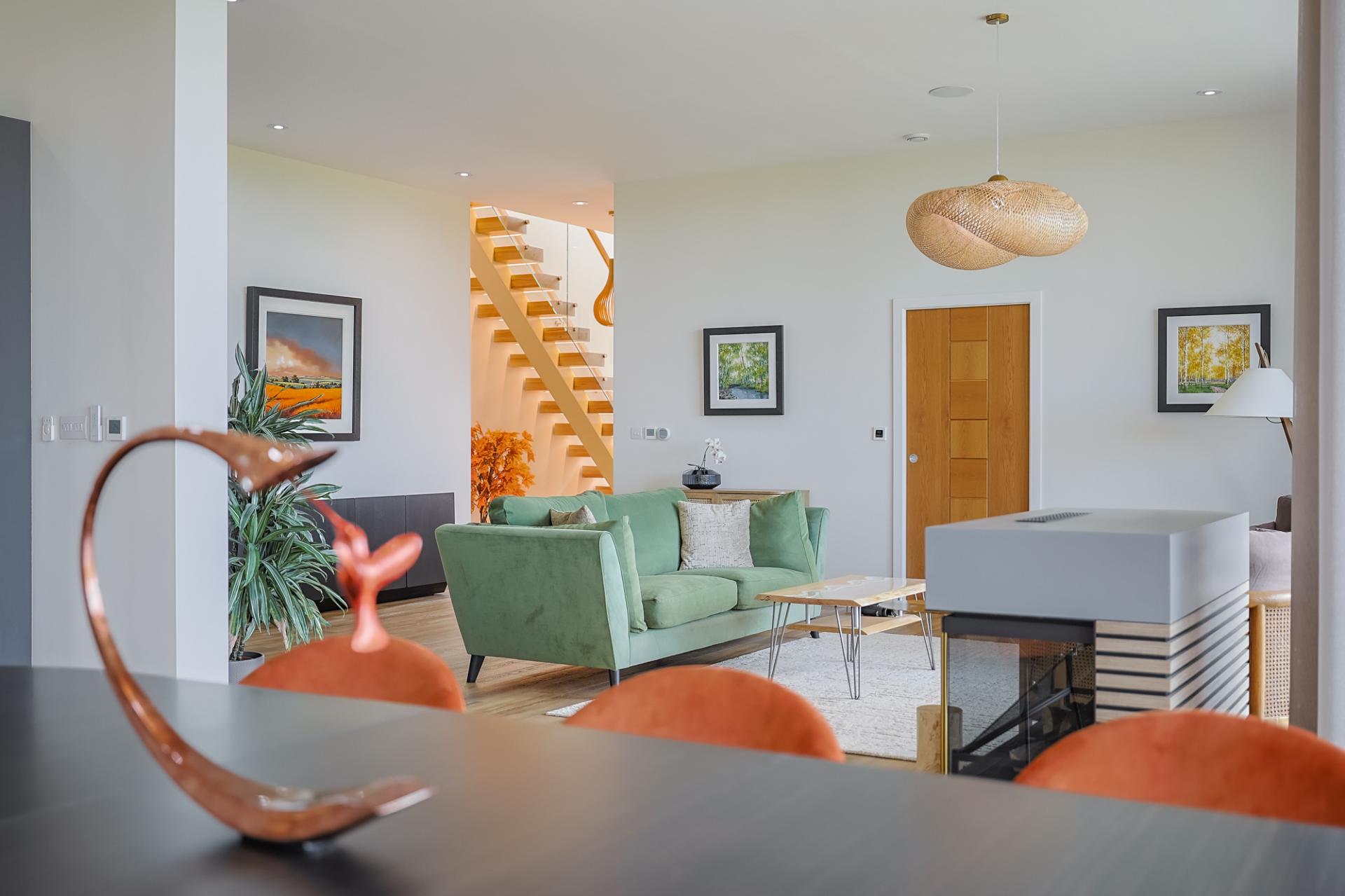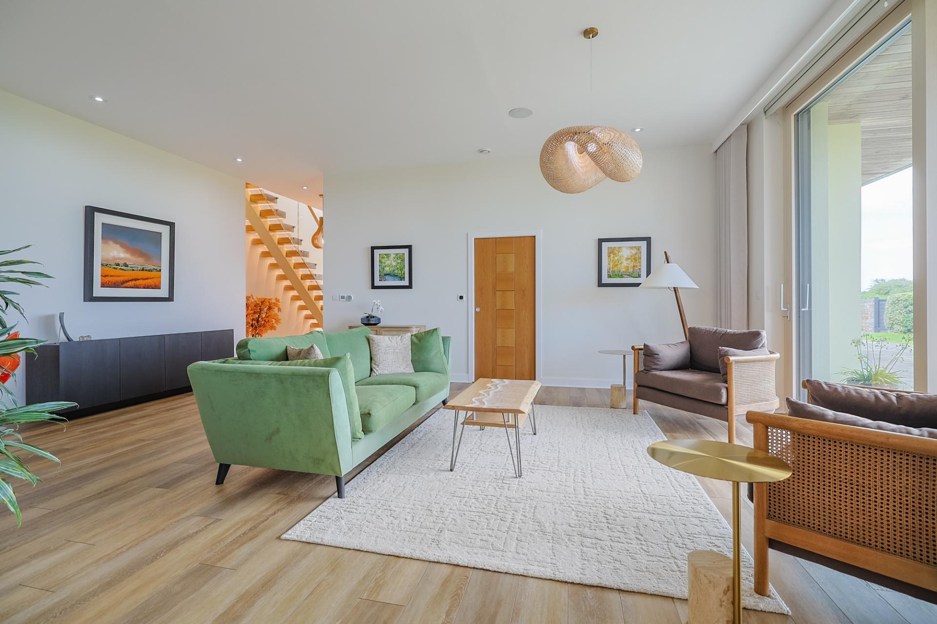 Completed in 2015, this striking and highly energy-efficient home spans approximately 4,500 sq. ft. and showcases outstanding contemporary architecture throughout. Built on a steel frame with reinforced concrete floors, the structure incorporates timber-framed walls with Warmcel insulation and triple-glazed windows and doors, delivering exceptional thermal performance. The exterior is finished in an elegant blend of thermowood, stone cladding and crisp K Rend panels. Its impressive EPC A rating (96%) is supported by features such as underfloor heating, mechanical ventilation with heat recovery, solar panels, photovoltaic cells, and an air source heat pump, all seamlessly integrated for low-energy living.
