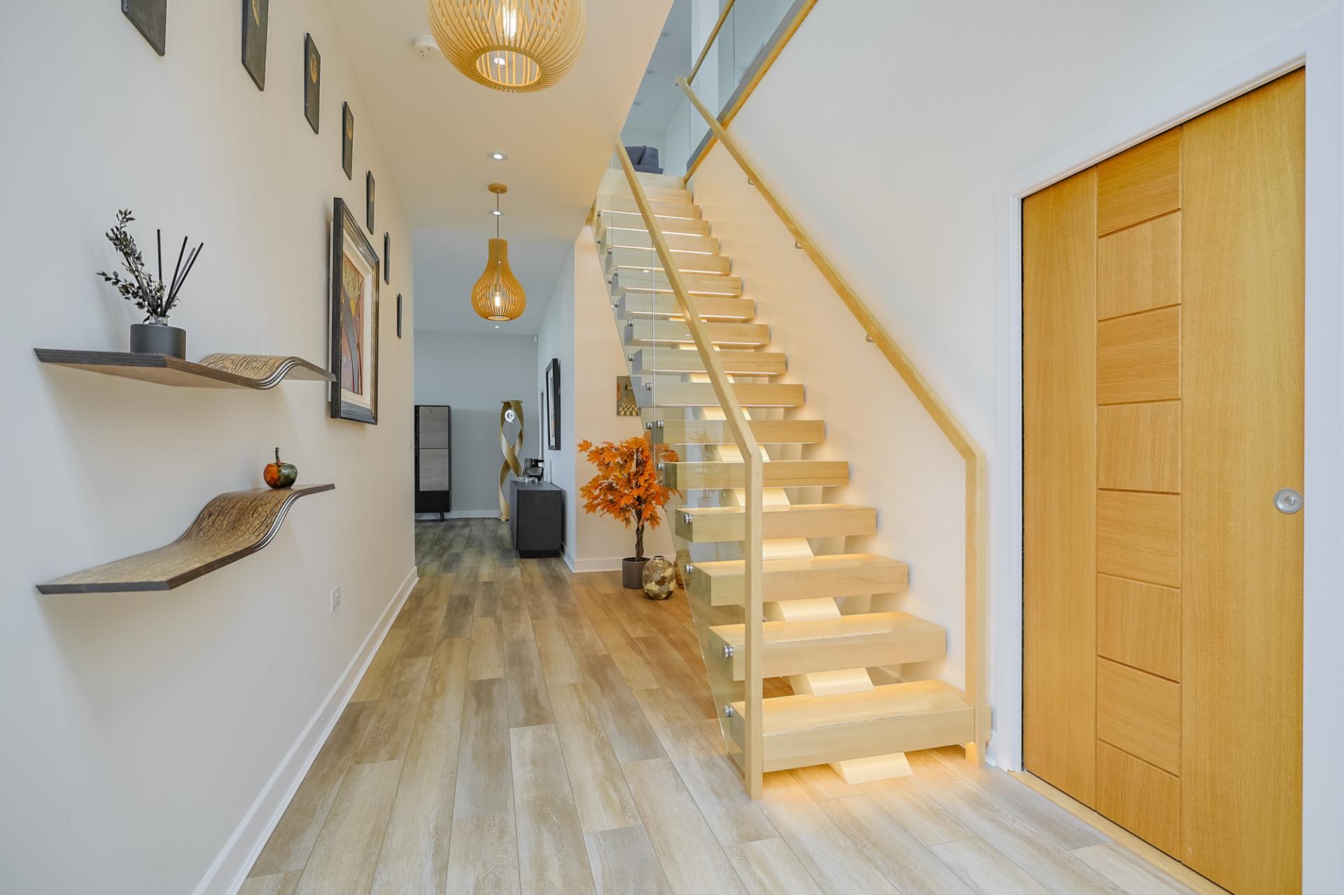 A sleek, glass-fronted porch welcomes you into the home, where you're drawn through a dramatic oversized entrance door into a vast and light-filled hallway. A stunning skylight above floods the space with natural light, illuminating the oak flooring and drawing you in. To the right, a large airing/cloak cupboard offers generous storage and houses the underfloor heating controls. Continuing down the beautifully lit hallway, you’ll find further storage, a WC, games room, bedroom five with en-suite, and the open-plan living space, as well as the staircase to the first floor.