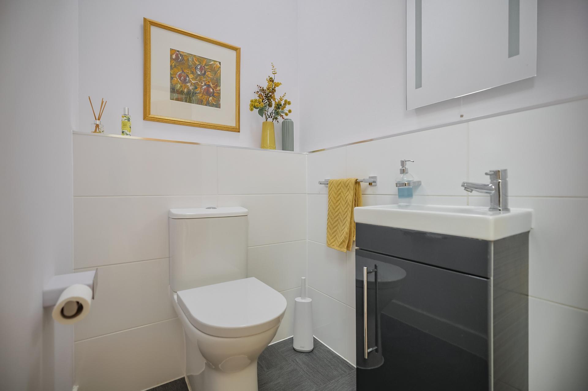 The ground-floor WC features a WC, vanity basin with integrated storage, mirror with lighting, partial tiled walls, and luxury vinyl flooring.