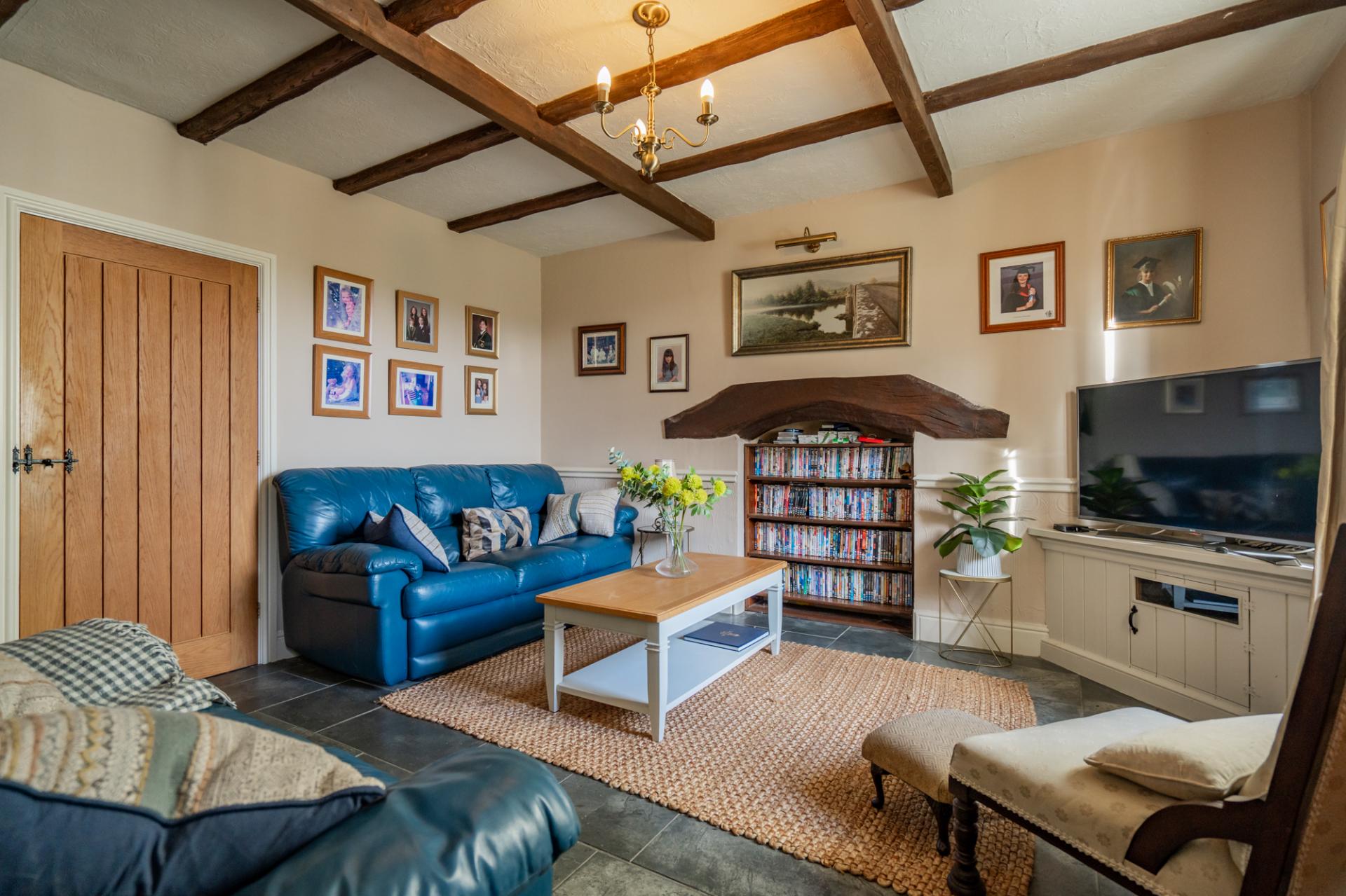 Return to the reception and step into the inviting sitting room. This delightful space features slate flooring, captivating beams, and a window with picturesque rural views. You'll find a fitted TV cabinet, a fireplace with current fitted shelving, and a distinctive lintel beam. Access to the rear lobby, leading to the first floor via a carpeted stairway, is also available from this room.